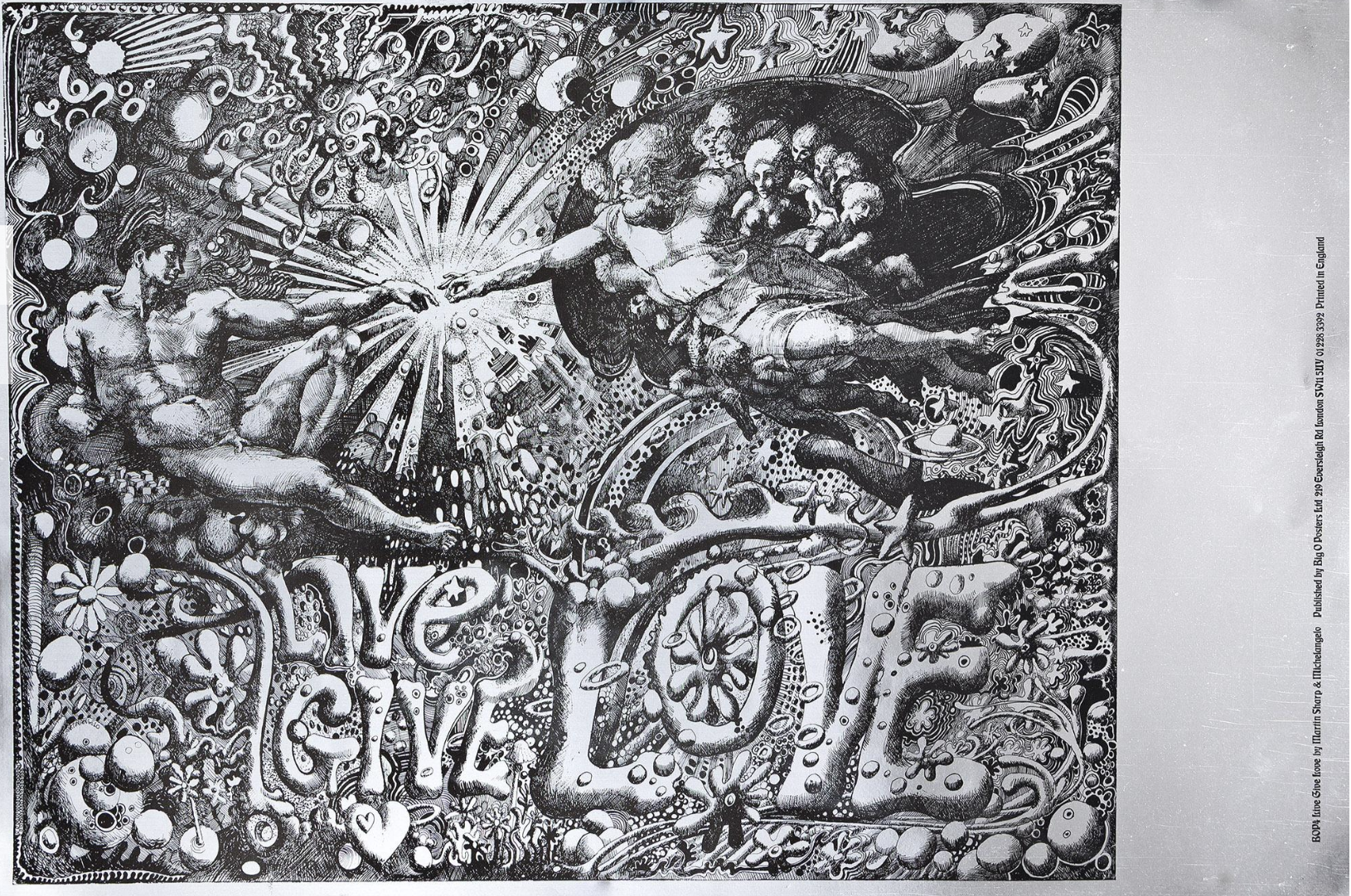 Striking metallic poster printed on foil, the design by Martin Sharp, a psychedelic adaptation of Michelangelo's Sistine Chapel fresco The Creation of Man (1511-12). Screenprint on silver foil laminated paper. In homage to this poster's original source, the poster is signed "martinangelo." High Art p. 143, V&A E.491-1997. 19¾x29¾ inches, 50¼x75½ cm. Big O Posters Ltd., London.