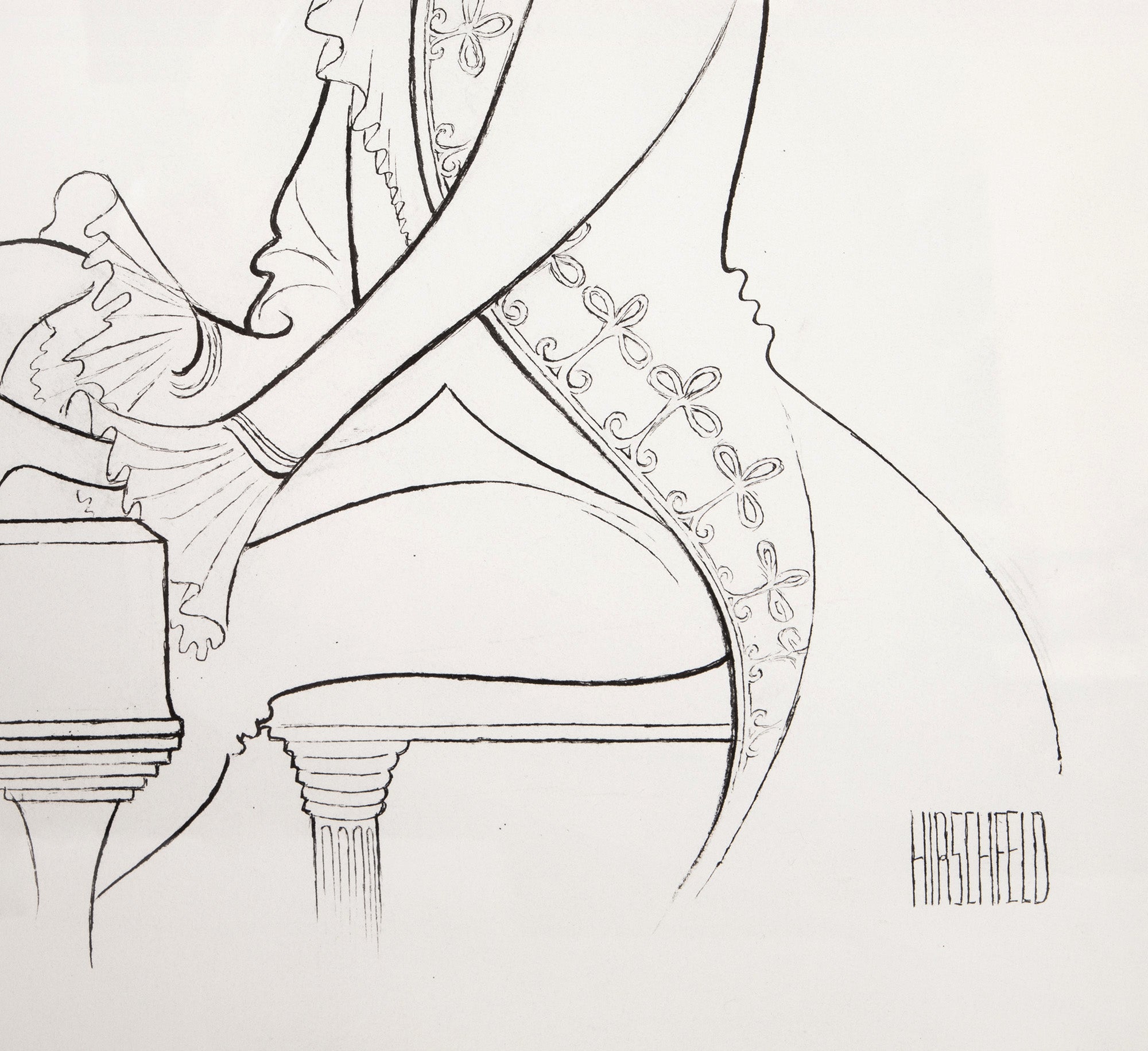Ink on board, measuring 19.5 x 25.5 inches, sight size. Signed “Hirschfeld” lower right image. Dark inking over cream board in fine condition; artist’s faint pencil tracings visible beneath ink strokes in some areas. Archivally matted and framed by Michelson Gallery.