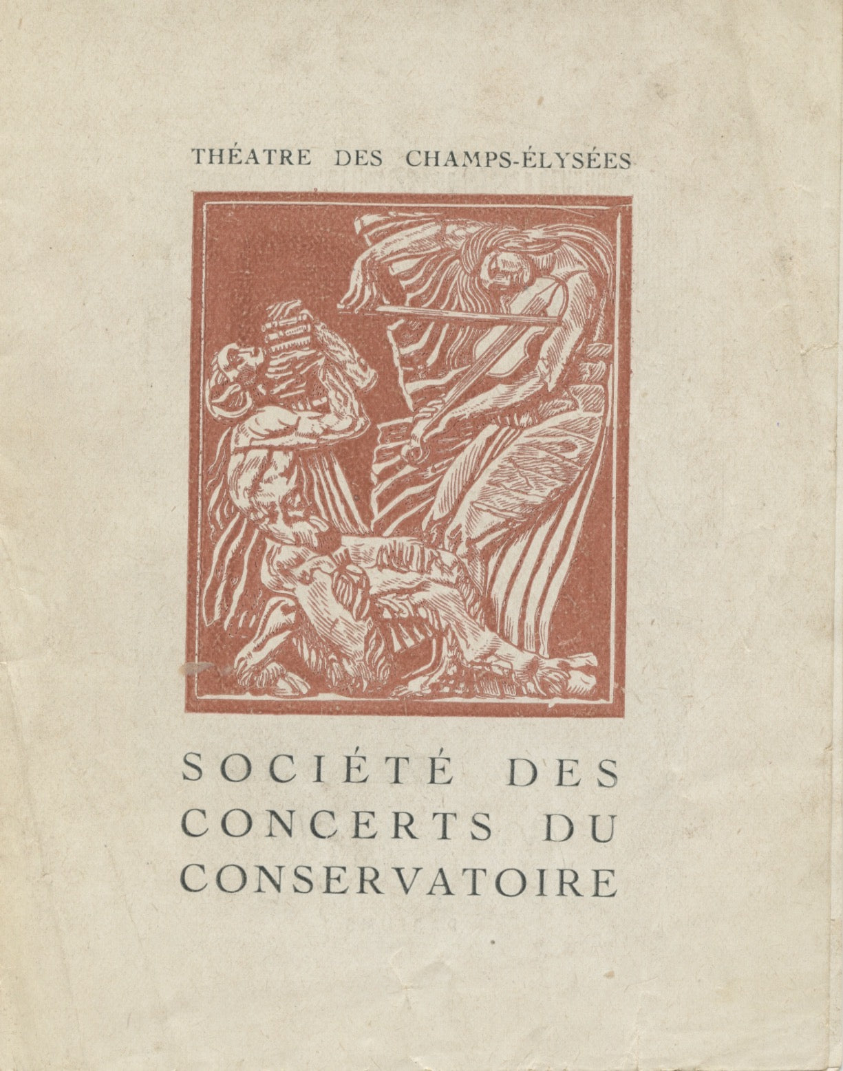 Uncommon original small wartime-format concert program, October 28 (no year, possibly 1945?) from a Neveu performance of the Beethoven concerto with Charles Munch conducting, Théâtre des Champs-Elysées Société des concerts du Conservatoire. Complete, 12 pp, 4 x 5 inches (10.5 x 14 cm). Block separated internally from covers, a little worn, else fine.