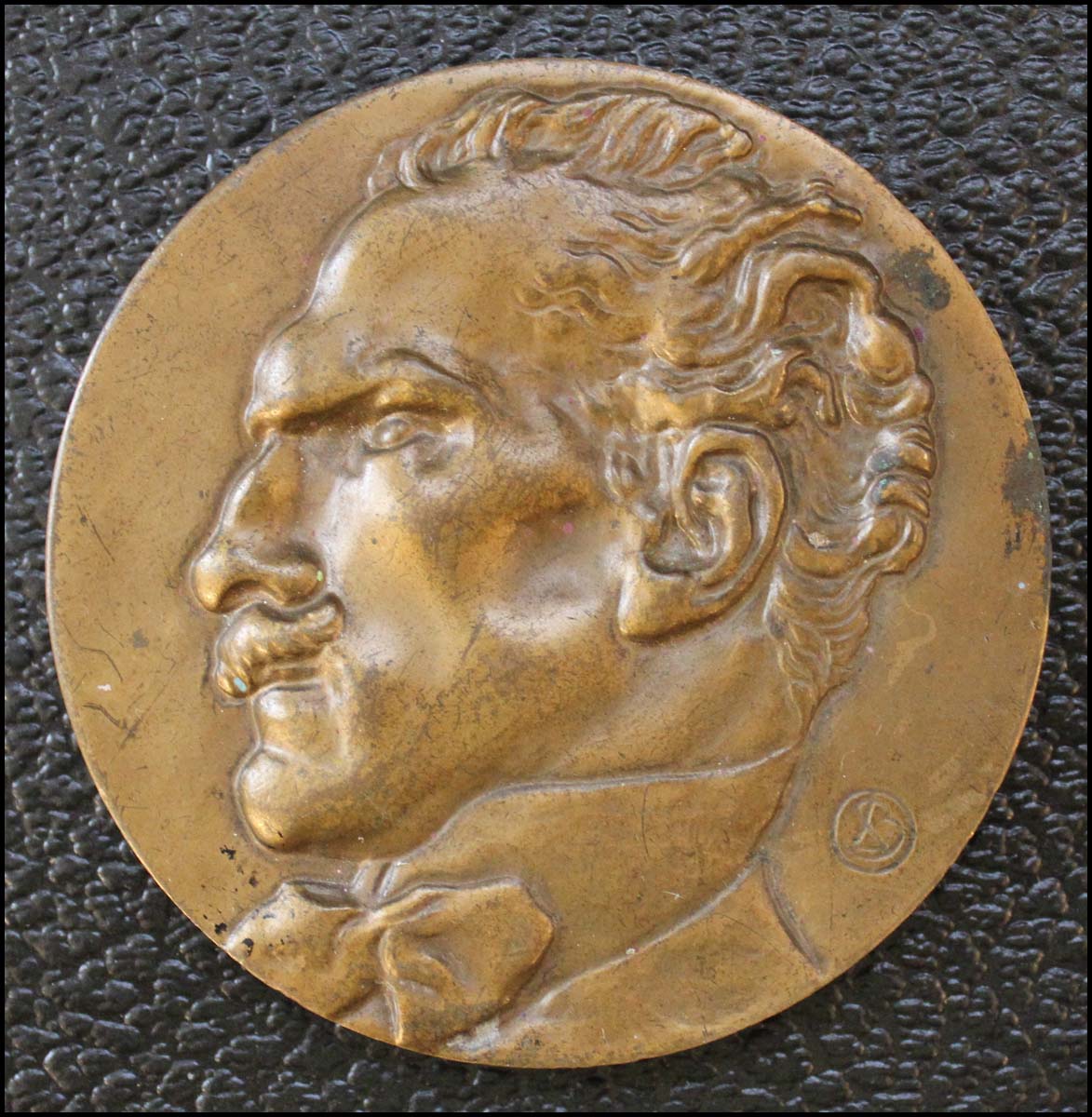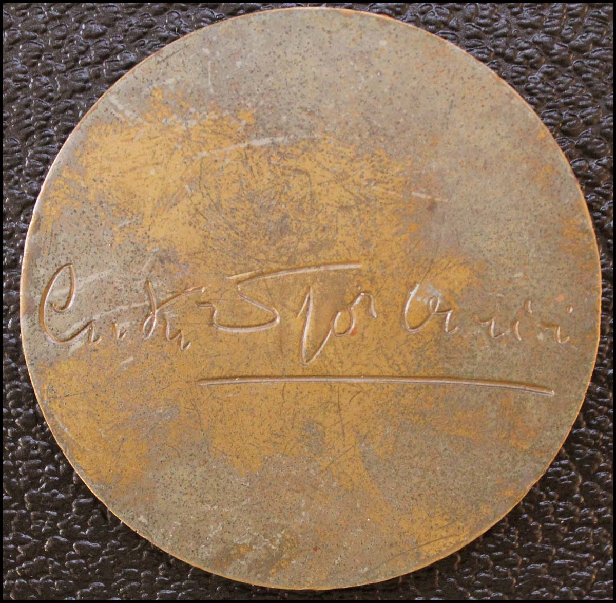Bronze portrait medal by Leonard Bistolfi, issued 1952 by the Medallic Art Company. With an incised facsimile signature of Toscanini on the obverse. 2.6 inches, approx. 1/8 inch thick. Some scuffing and minor corrosion, overall good.