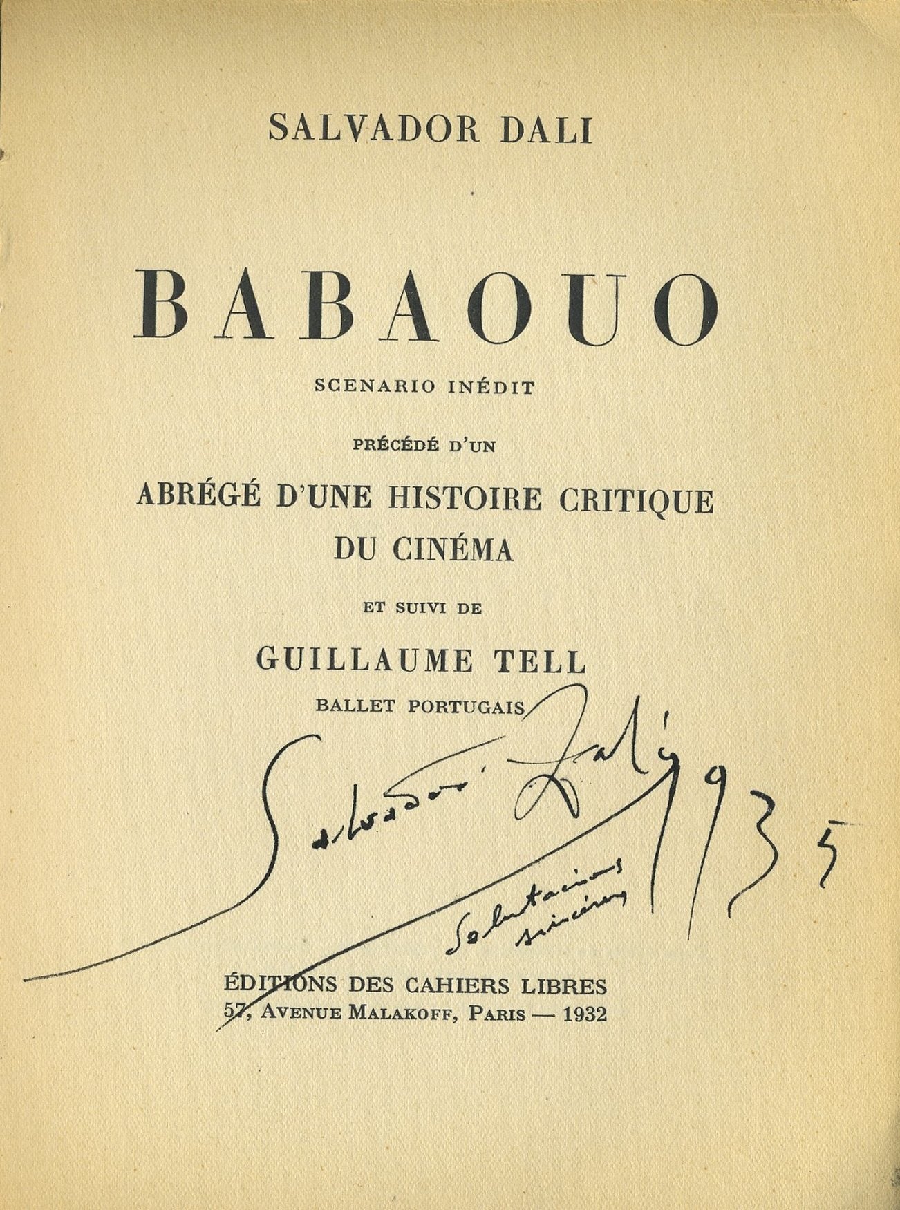 "Babaouo" includes "A shortened critical history of cinema" ["Abrege d'une histoire critique du cinema"] and "William Tell, portugese ballet" ["Guillaume Tell ballet portugais"]. "Scénario non réalisé de Salvador Dalí, datant de la période la plus inspirée et paru en 1932 aux éditions des Cahiers libres (Paris). Alors que le scénario lui-même est un chef-d’oeuvre de mystification poétique, le texte qui sert de préface au volume, ‘Abrégé d’une histoire critique du cinéma,’ constitue une contribution majeure au problème du cinéma du point de vue surréaliste. Dalí, dans ce texte, rend notamment un époustouflant hommage à certains films ‘de second ordre,’ (le mélodrame italien, le burlesque américain) qui lui servent à établir une distinction exemplaire entre la poésie et le simple art" (Petr Kral, in Biro/Passeron). Julien Levy selected portions of "Babaouo" and all of "Guillaume Tell" for his anthology "Surrealism" in 1936.