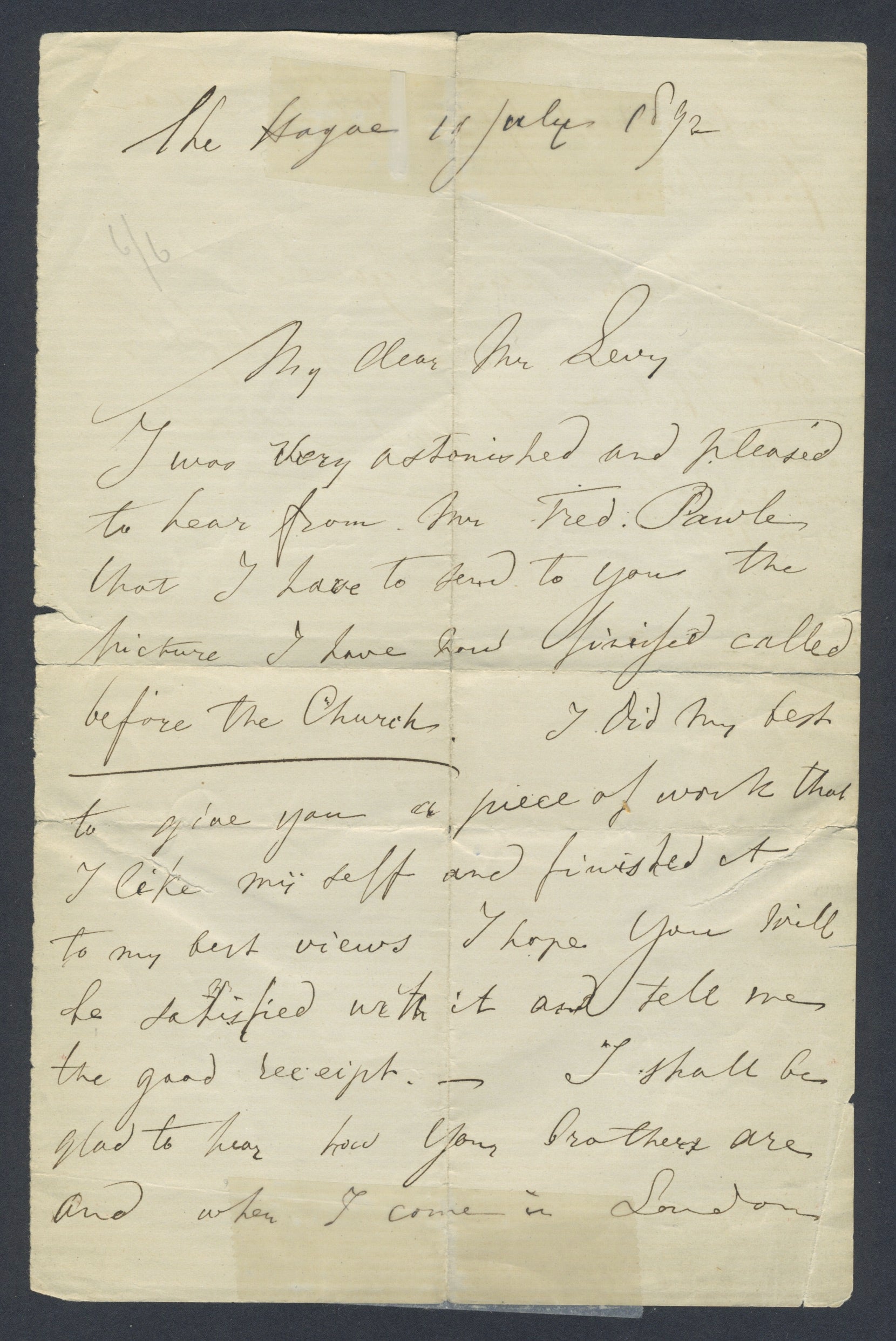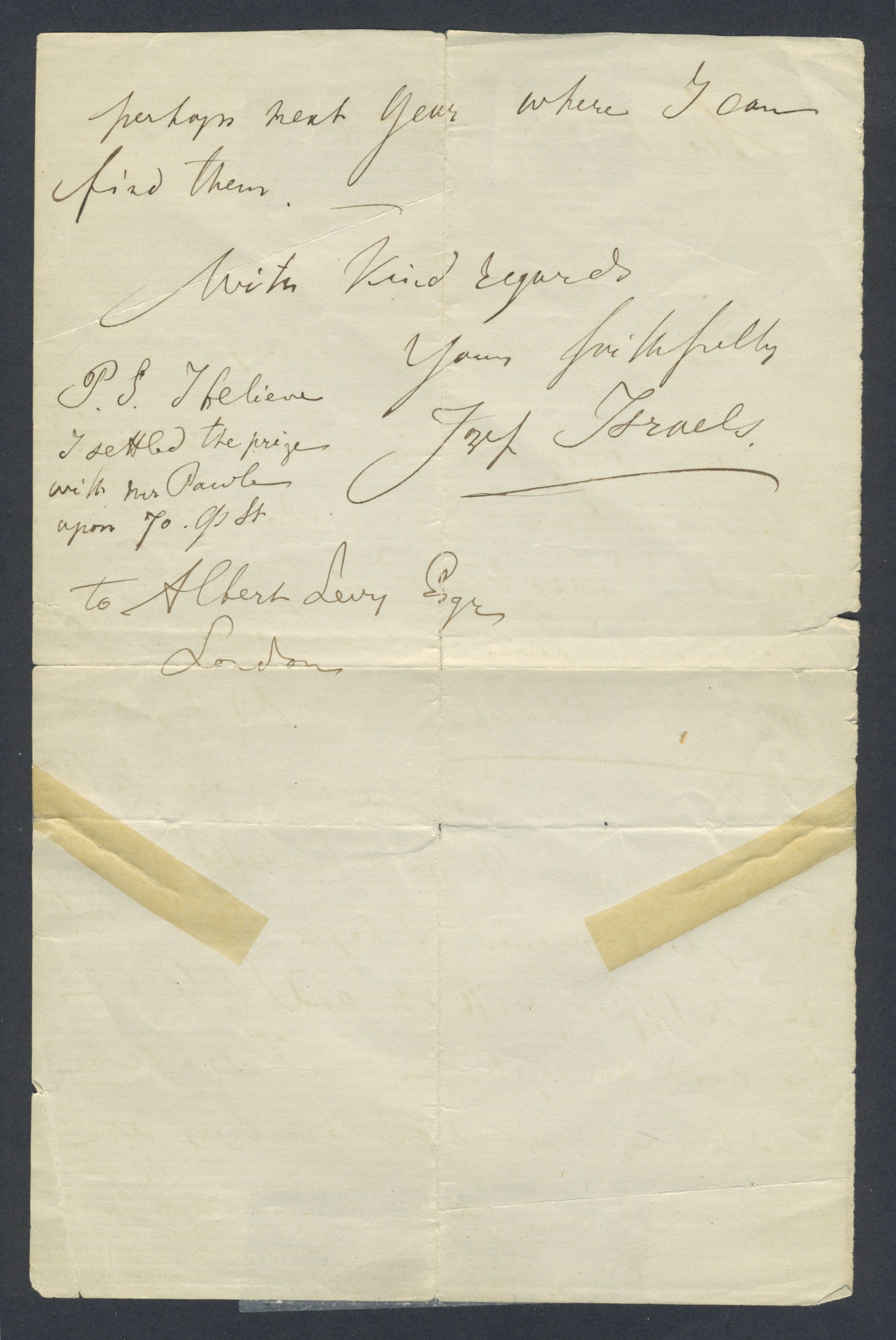 Autograph letter from the Dutch painter known as a leading member of the Hague School of landscape painters, concerning the sale of a painting. The Hague, July 14, 1892. Israëls writes: "My dear Mr. Levy, I was very astonished and pleased to hear from Mr. Fred. Pawle that I have to send to you the picture that I have now finished called Before the Church. I did my best to give you a piece of work that I like myself and finished it to my best views. I hope you will be satisfied with it and tell me the good receipt. I shall be glad to hear how your brothers are and when I come in London perhaps next year where I can find them. With kind regards, yours faithfully, Jozef Israels. P. S. I believe I settled the prize [price] with Mr. Pawle upon 70 G. St.[?]" 2 pp. Heavy folding creases with several splits; two recent tape repairs to the recto and two older tape repairs to the verso. Overall in good condition. 5 x 8 inches (13 x 20 cm).
