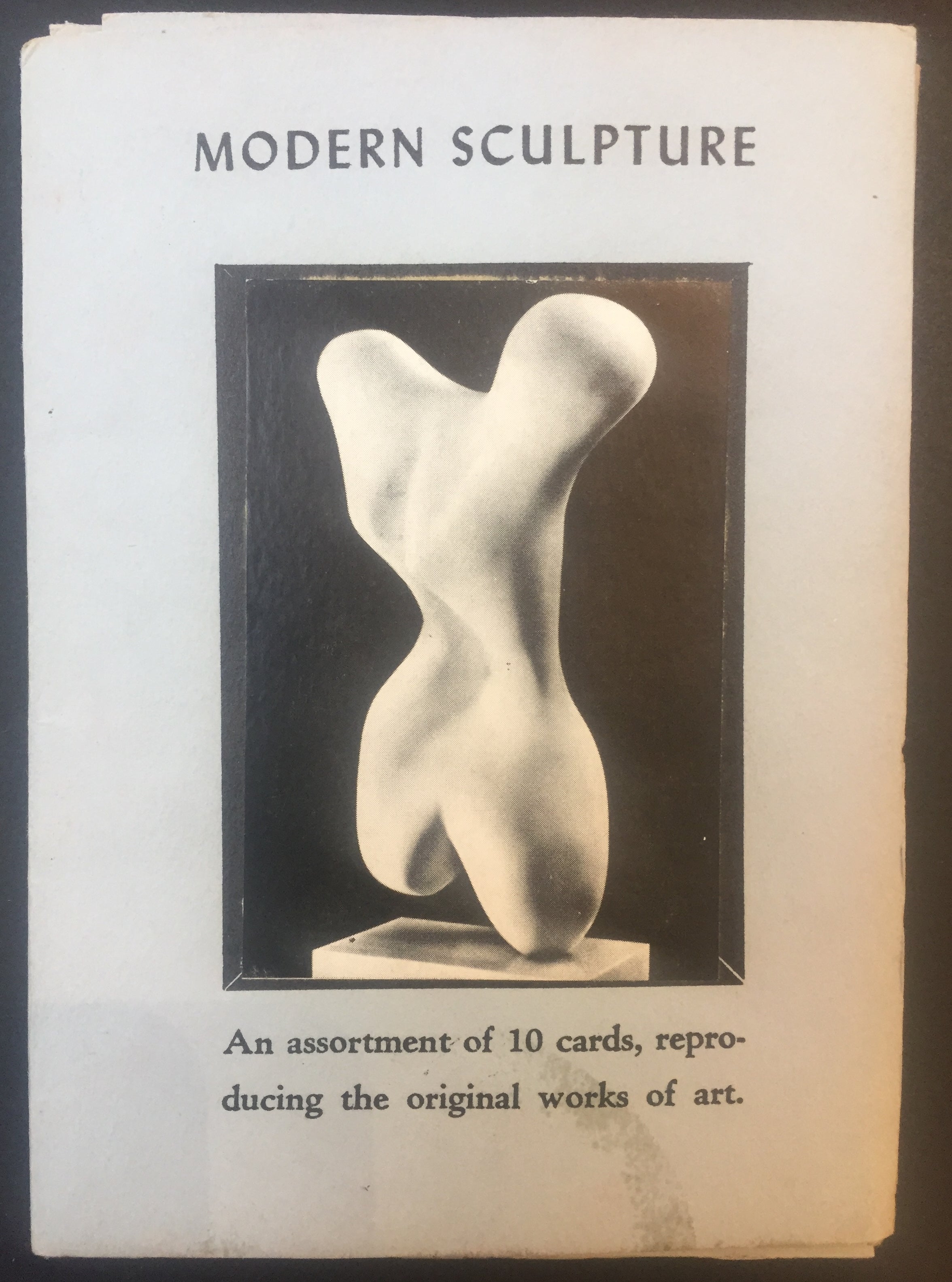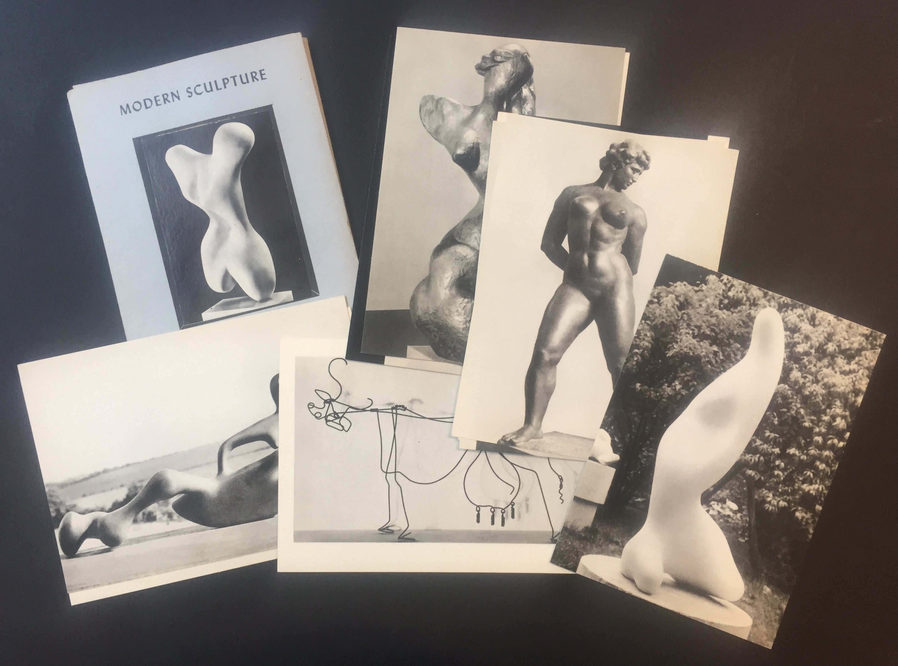 Portfolio of ten black-and-white postcards displaying works of sculpture by Jean Arp, Aristide Maillol, Edgar Degas, Constantin Brancusi, Henri Laurens, Seymour Lipton, Alexandre Calder, Henry Moore, and Wilhelm Lehmbruck. Edited by Fernand Hazan, Paris, and distributed by Artext Prints, Connecticut. In a small folder with a further image of Jean Arp's Torse on the cover. Wear to the folder, but internally very fine. 4.5 x 6 inches (11 x 15 cm).