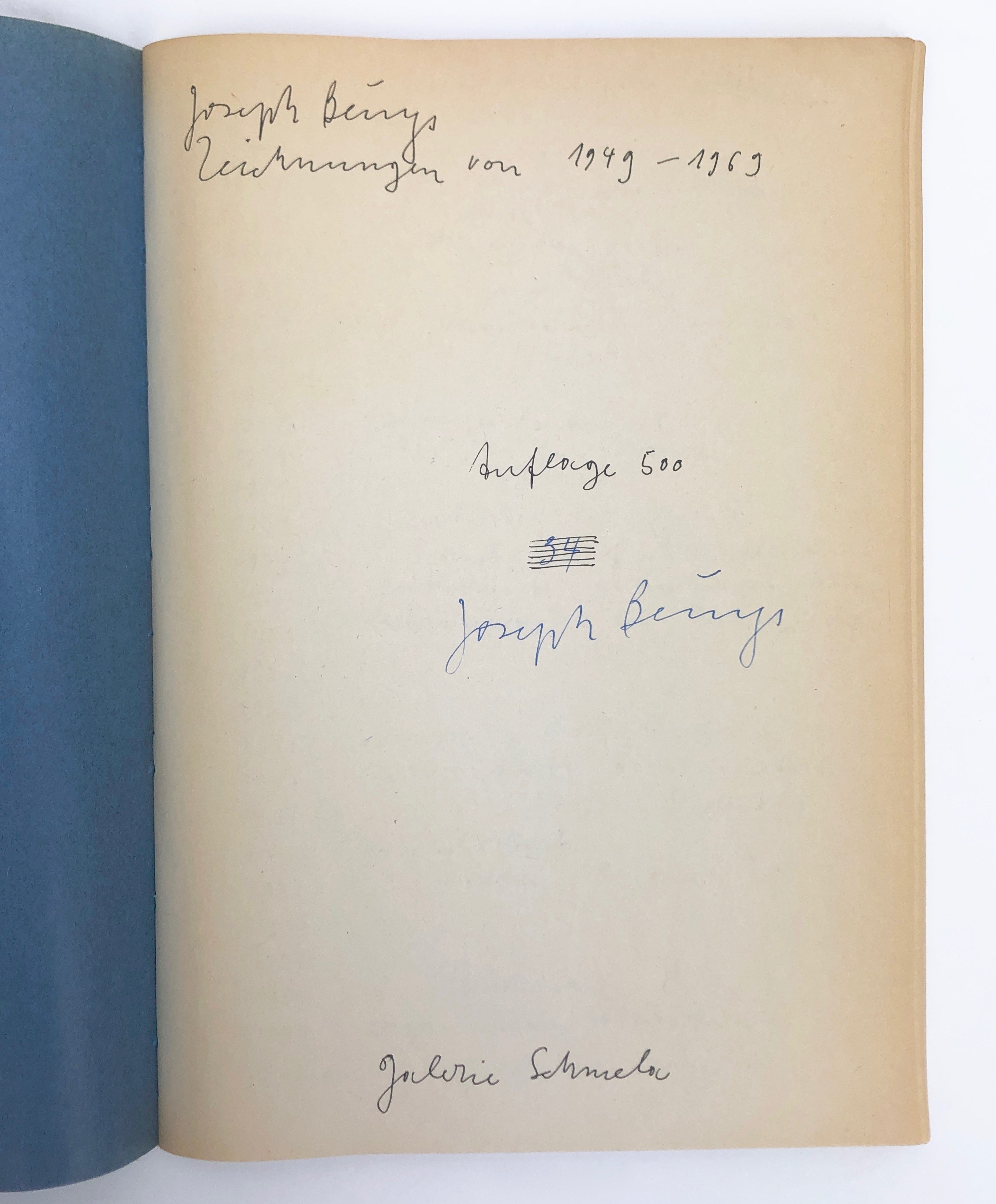 Signed and numbered catalog from the important Fluxus artist. [3] facsimile text pages giving Beuys' chronology, 57 black and white plates of his drawings. No. 34 of 500 numbered and signed copies. Original cloth backed blue wrappers. 4to (8.25 x 11.75 inches). Toning.