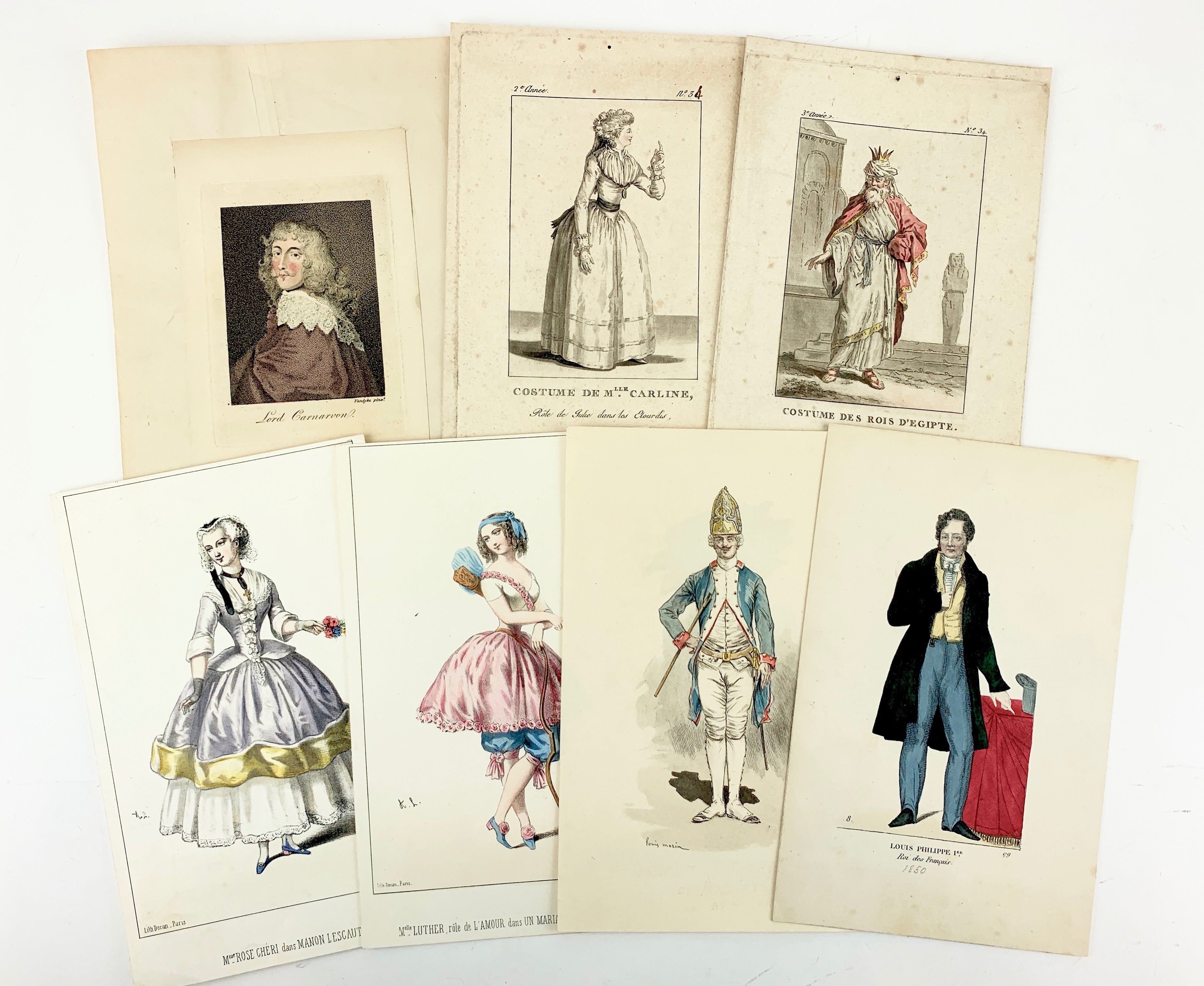 Collection of seven 19th century colored prints, several of which depict French actors and actresses, taken from various books, including one print after the Dutch engraver Jan Luiken, a pair of lithographs from Decan of Paris, and one design from Louis Morin. Overall in fine condition. Six approximately 5.5 x 8.75 inches (14 x 22.2 cm.), one 6 x 10.25 inches (15.2 x 26 cm.).