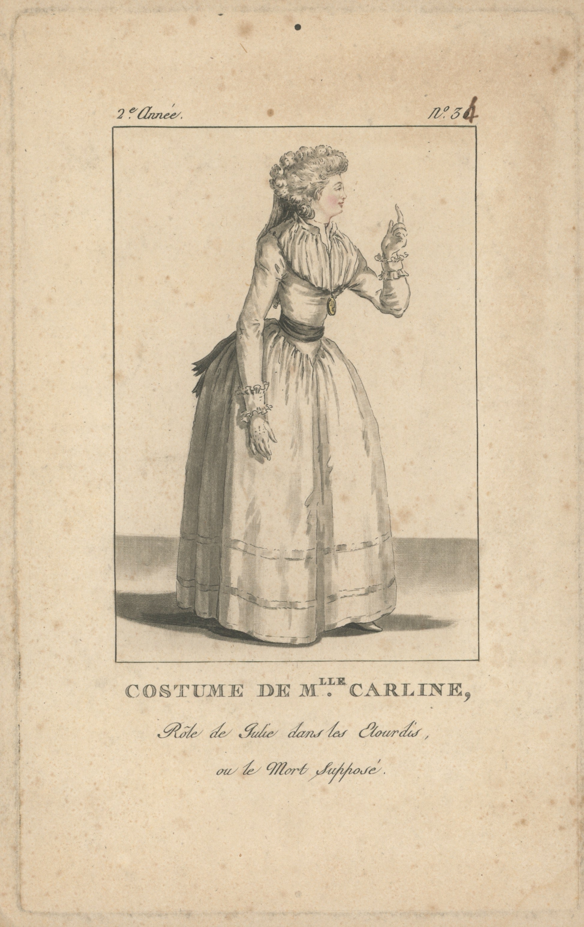 "Costume de Mlle. Carline, Rôle de Julie dans les Étourdis, ou le Mort Supposé." Engraved. No. 36 in a series, hand-corrected to 34. Small areas of spotting, overall in fine condition.