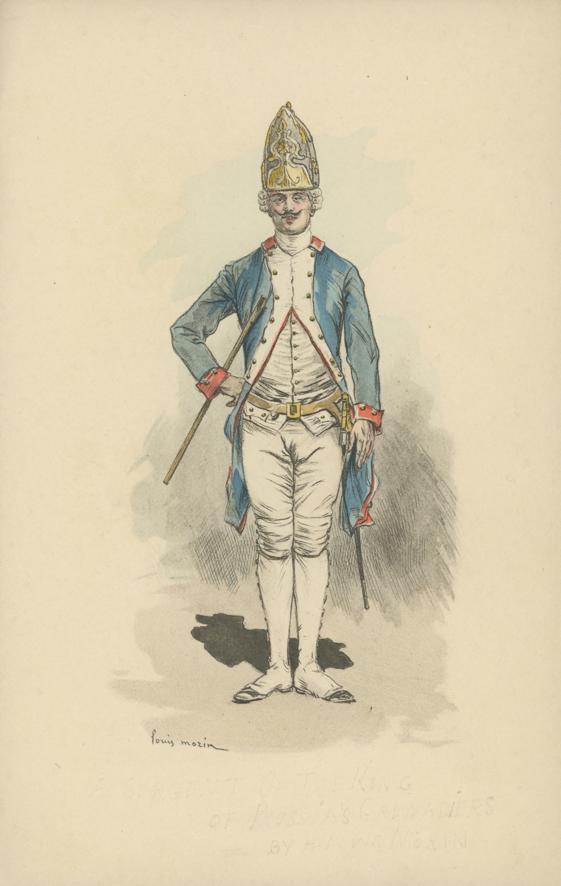 Uncaptioned lithograph by H. Louis Morin depicting one of the King of Prussia's grenadiers. Faint pencil marks to lower margin, overall in fine condition.