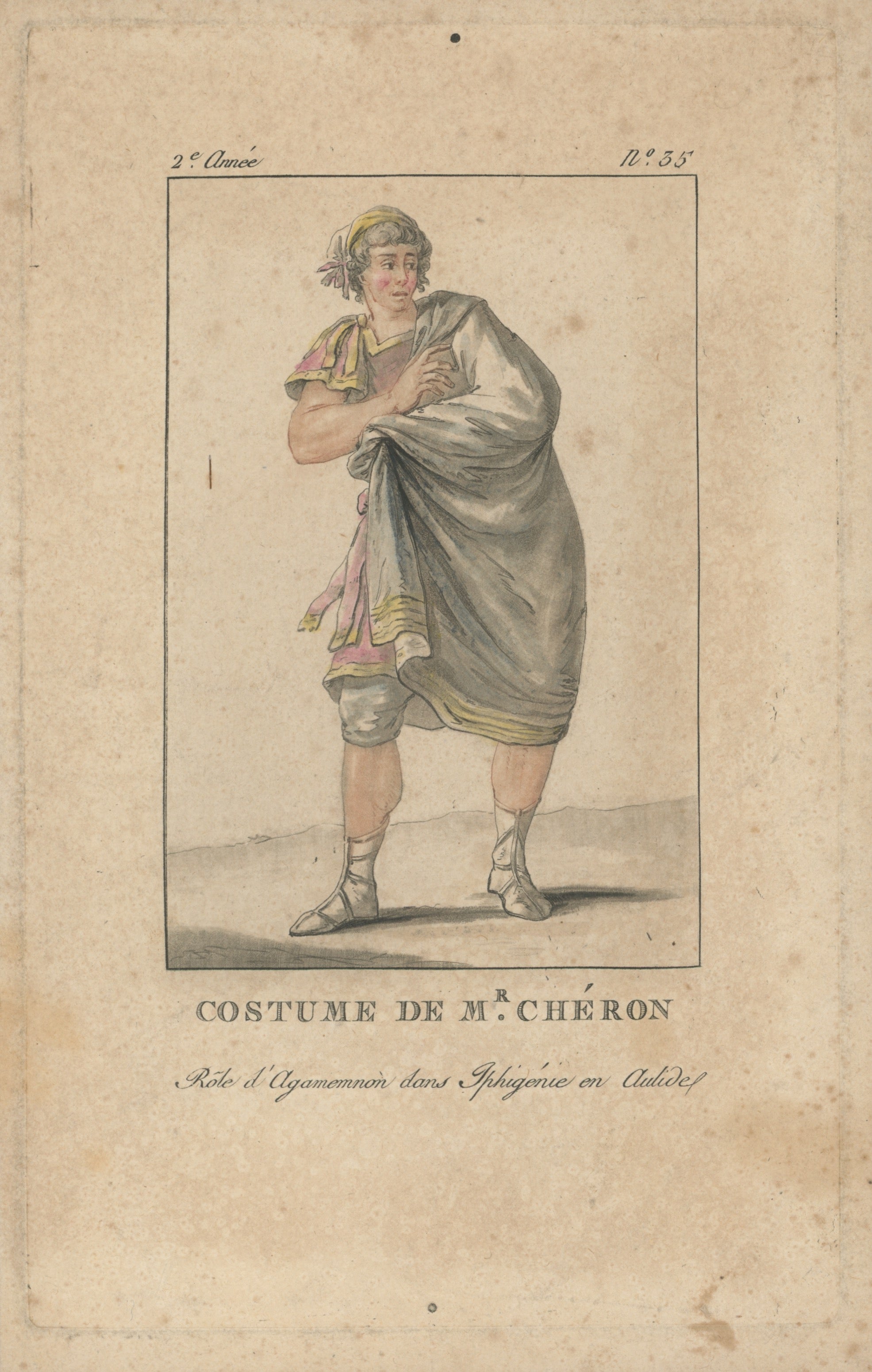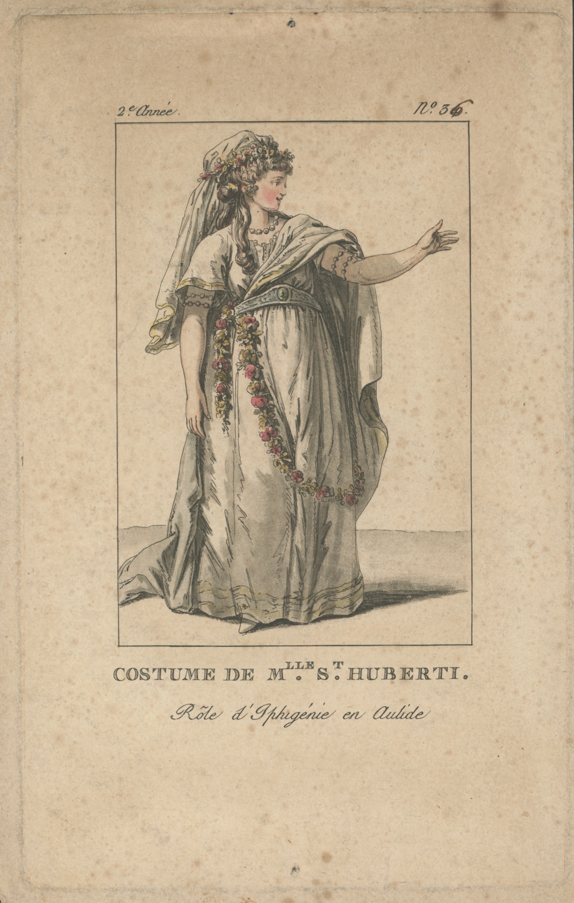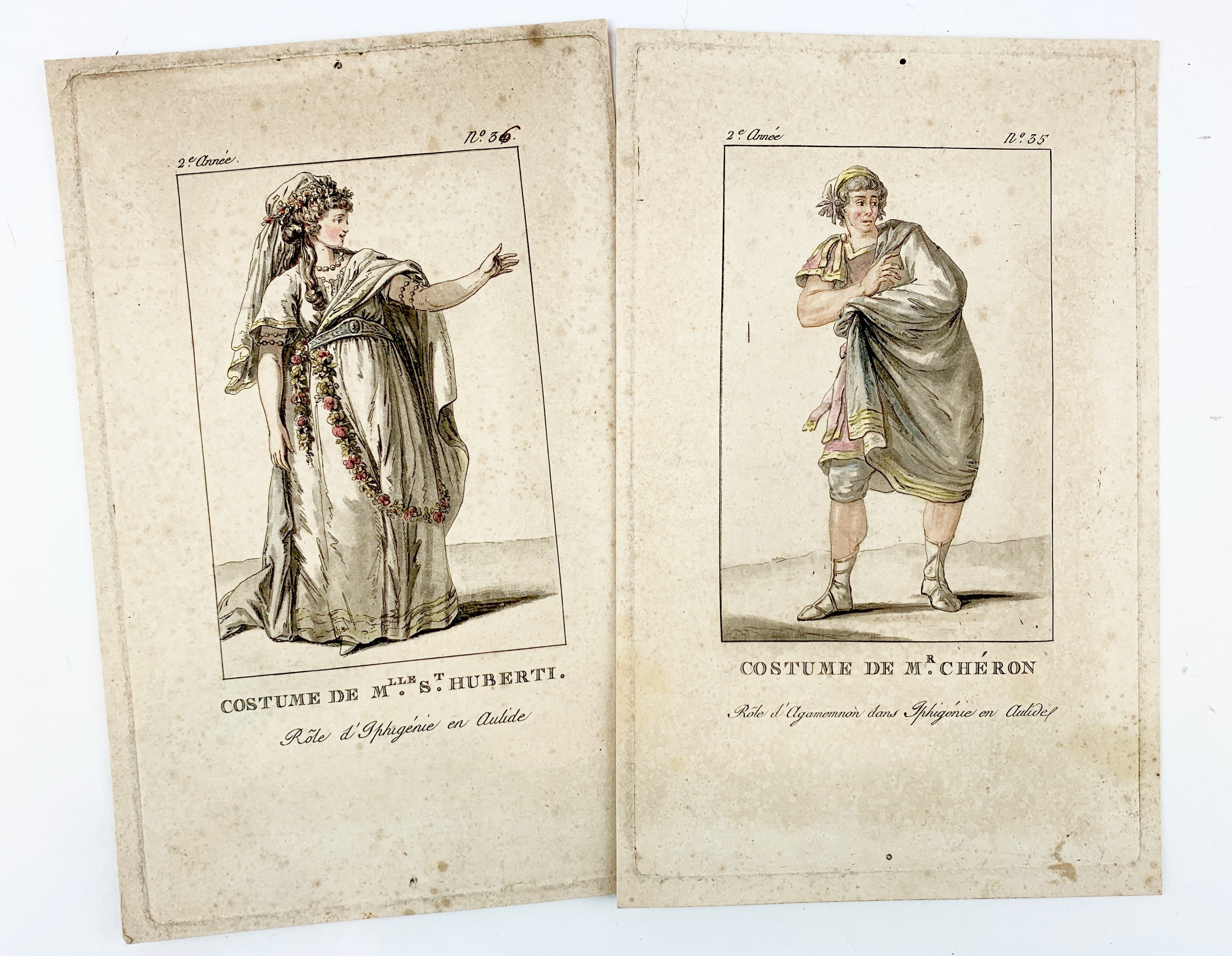 Pair of hand-colored engravings depicting the French opera singers Antoinette Saint-Huberty and Augustin-Anastase Chéron in costume for the composer's opera Iphigénie en Aulide ca. 1800. The captions read "Costume de Mlle. St. Huberti / Rôle d'Iphigénie en Aulide" and "Costume de Mr. Chéron / Rôle d'Agamemnon dans Iphigénie en Aulide." Moderate foxing to both pieces, overall in fine condition. 5.5 x 8.5 inches (14 x 21.6 cm.).