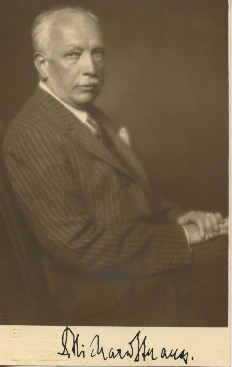 Edith Barakovich was a well-known celebrity photographer in Vienna and Berlin whose career was cut short by the advent of Nazism. She committed suicide in Casablanca in 1940, as her emigration to the U.S. was delayed again and again. Her address on the blind stamp (Vienna IV., Prinz-Eugenstrasse) allows to date the photograph to the years 1918–22. Strauss was principal conductor of the Vienna State Opera from 1919 to 1924.