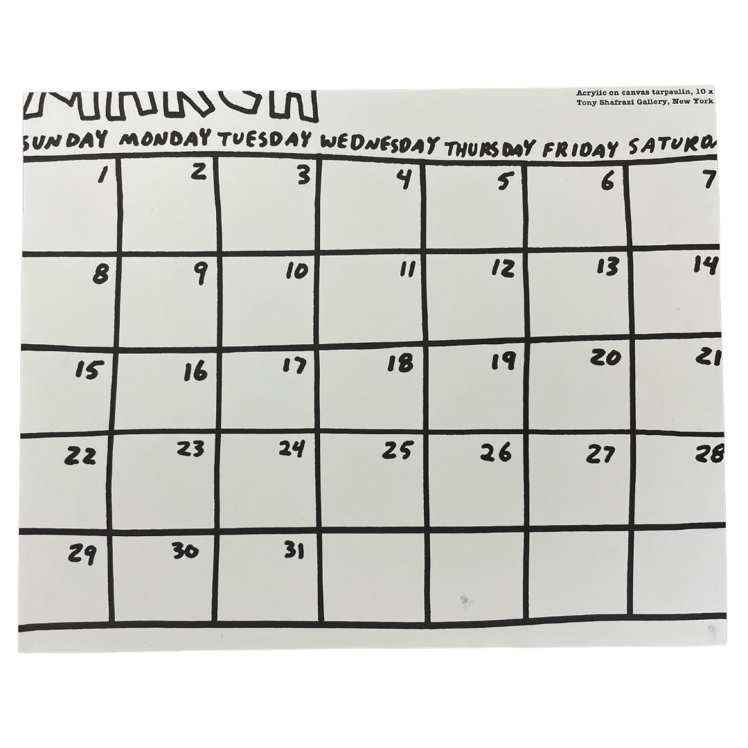 Thick stock color illustration of the 1985 work "Tree of Life," an extracted 1987 calendar page (verso with March calendar), signed boldly in silver marker to the lower tree by the American graffiti artist and social activist known for his instantly recognizable visual language of dancing figures and his work to bridge the gap between high and low art. 10.2 x 12.5 inches (25.5 x 32 cm). In fine condition.