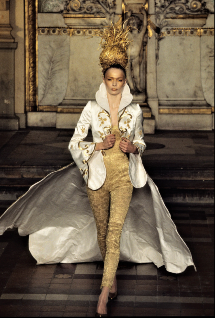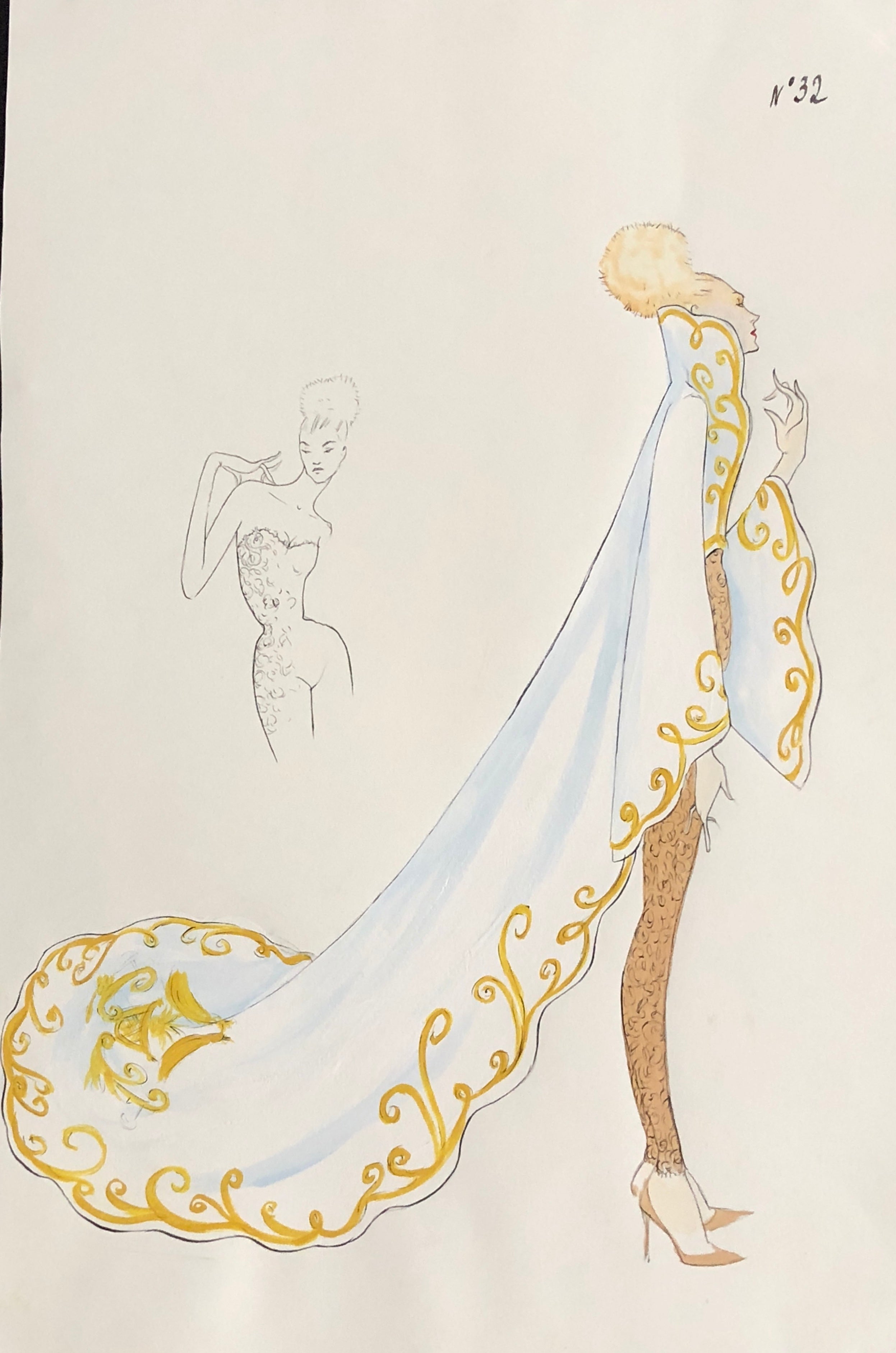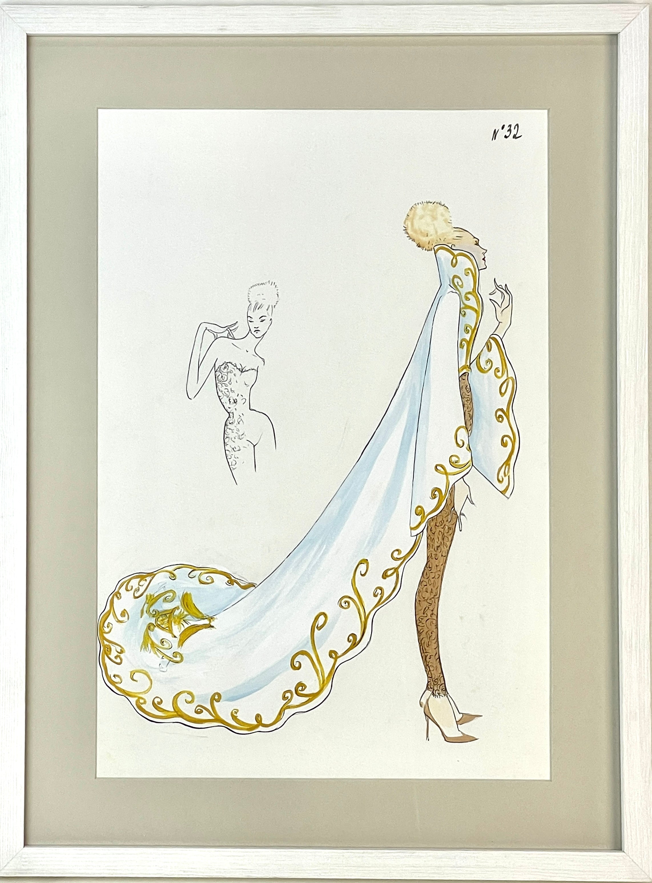 McQueen, Lee Alexander. (1969 - 2010). Original Drawing for his First Givenchy Haute Couture Collection (trained coat with body suit). Original fashion design for his first Givenchy haute couture collection, 'In search of the Golden Fleece', Spring-Summer, 1997, unsigned, number 32, gouache and ink, showing a a long trained coat with lavishly embroidered borders, sleeves and high collar, worn over a gold lace body suit. 12 x 18 inches (30 x 46 cm). In very fine condition.