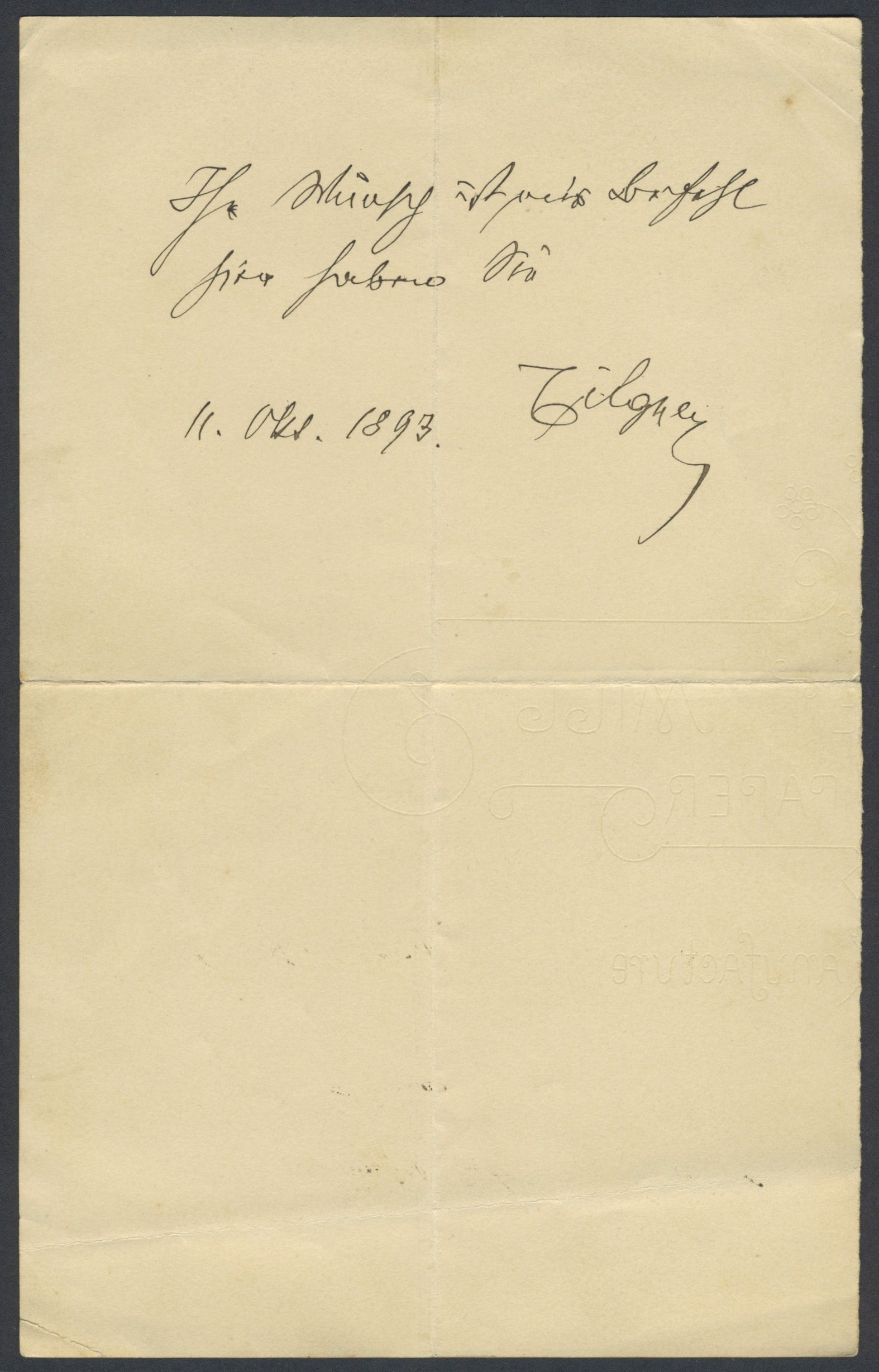 Autograph signature from the important Austrian sculptor whose work includes the Mozart Monument in Vienna, as well as numerous other sculptures in the Burgtheater and around Vienna. On a small sheet, he has penned (translated from the German): "Your wish is my command... Tilgner." Dated October 11, 1893. Heavy folding creases and light toning; overall in fine condition. 5 x 8 inches (12.8 x 20.3 cm).