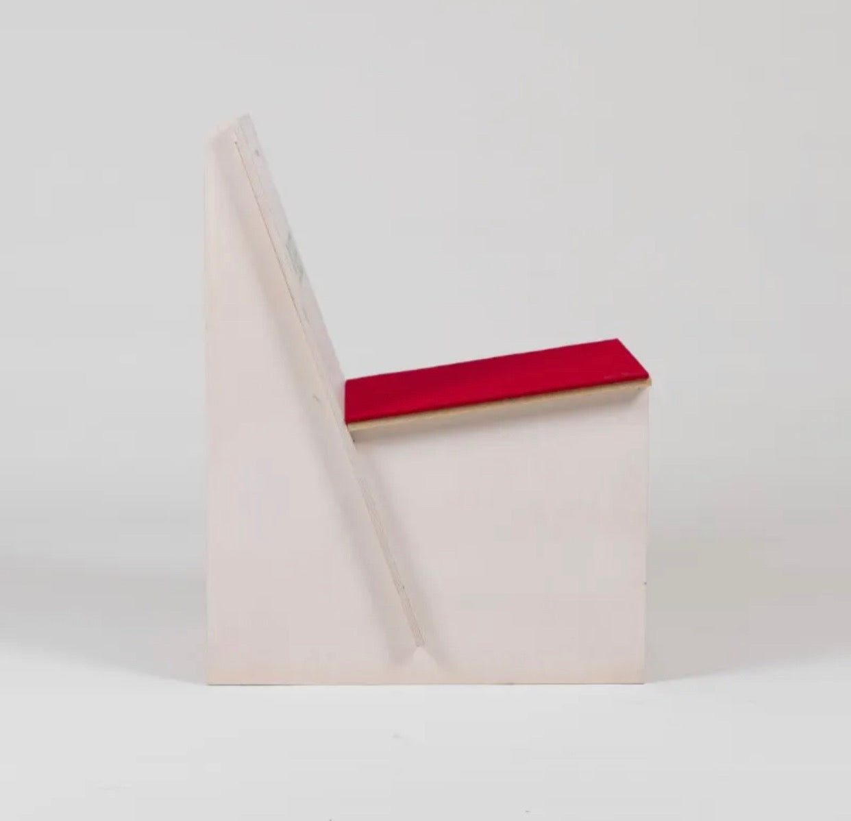 American conceptual artist John Baldessari says: PLEASE... sit on this chair! Commissioned by Onestar press and designed by Sébastien de Ganay, the intent of the project was to produce a lounge chair that could be produced and assembled anywhere. The production consists of cutting four pieces out of simple plywood on a local CNC machine - in order to make its carbon trace as low as possible - able to be assembled in a matter of minutes with no screws or glue. The "4 Piece Chair" was born in 2015 with a number of artist collaborations with Onestar Press including Lawrence Weiner (2015), Rirkrit Tiravani (2016), and John Baldessari, who made the customizations to this particular model in 2016.