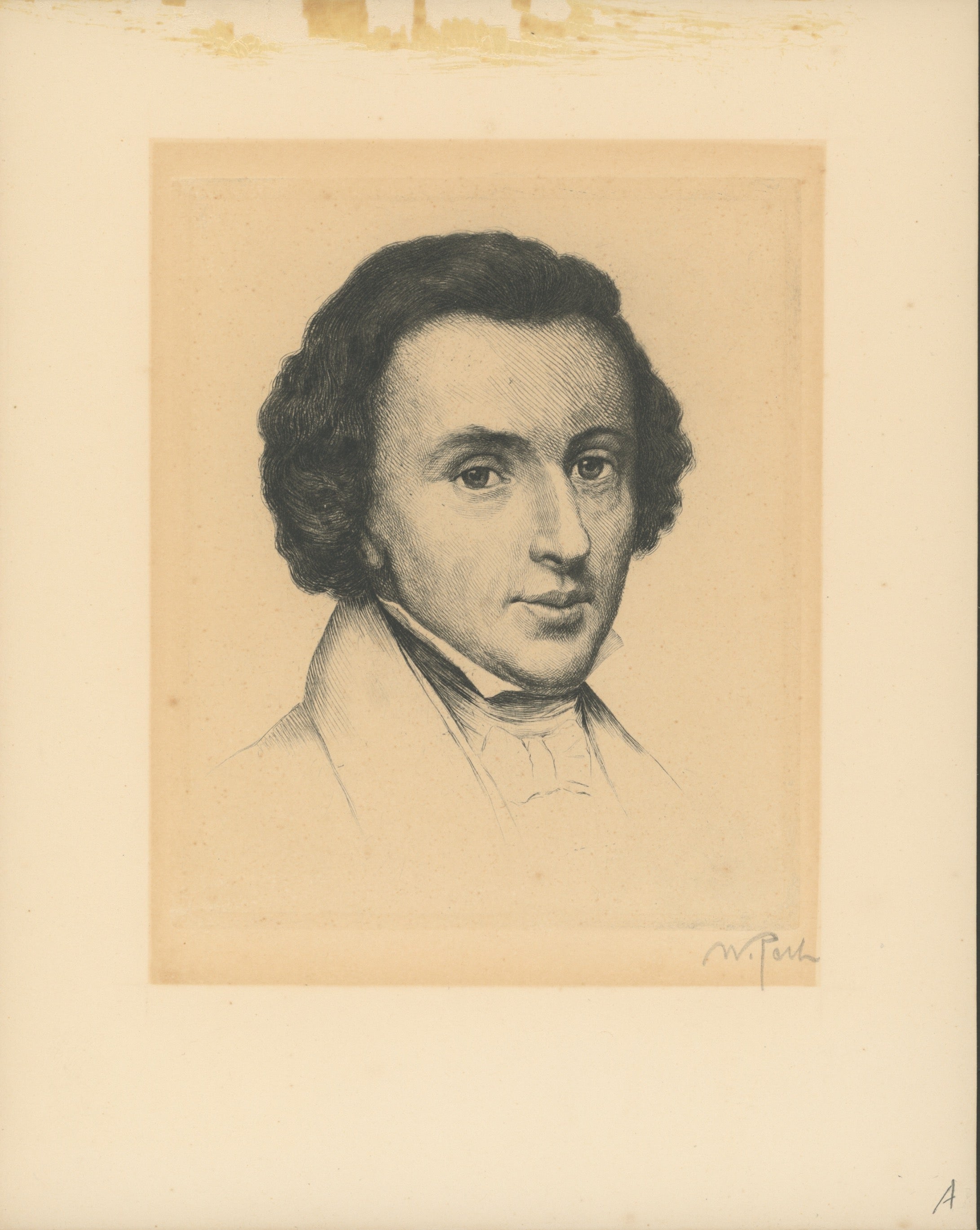 Fine original etching of the great French pianist and composer by the German artist Wilhelm Pech, who has signed "W. Pech" in pencil to the lower right of the engraving. Mounting remnants to upper margin, block of toning around the plate, some staining along the lower margin, otherwise good. 6 x 7.5 inches (15.2 x 19 cm.).