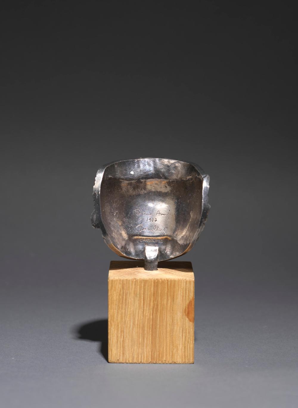 Mitoraj, Igor. (1944-2014). Sculpture pour Christofle France, 1977. Silver plated metallic sculpture of a bandaged face designed by the Polish artist and sculptor for the French company that introduced electrolytic gilding and silver plating to France in 1842. Etched inscription reading "Bonne année / 1977 / Bouilhet" to verso. In very fine condition. 2.5 x 2.25 x 1.5 inches (6.5 x 6 x 4 cm.).