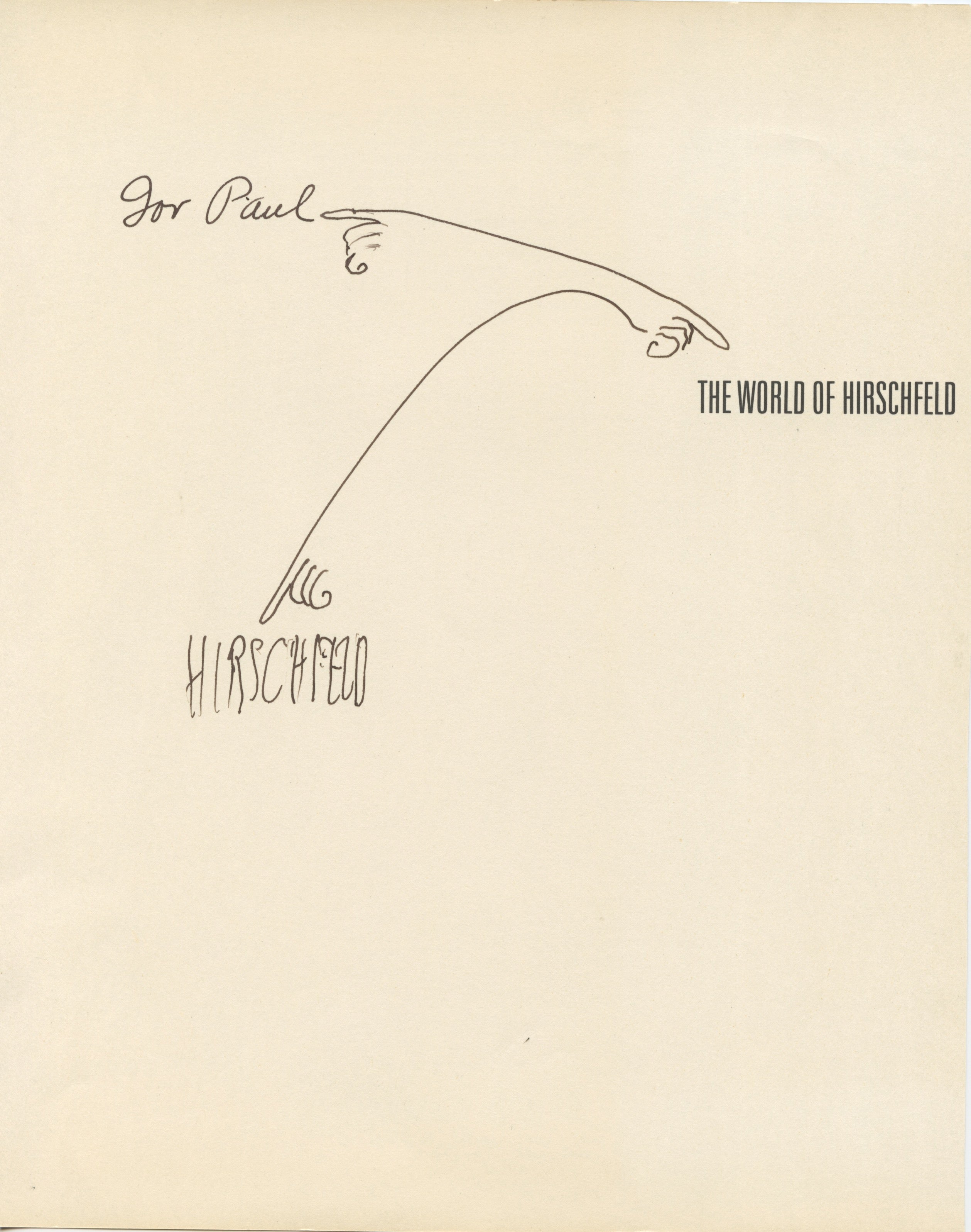 Signed half title of The World of Hirschfeld (New York: Harry N. Abrams, 1970). Inscribed, "For Paul / HIRSCHFELD" with the addition of three hand drawn arms and pointing hands drawn by the artist. A single sheet cut from the book. 10.5 x 8.5 inches (27 x 21.5 cm). In fine condition.