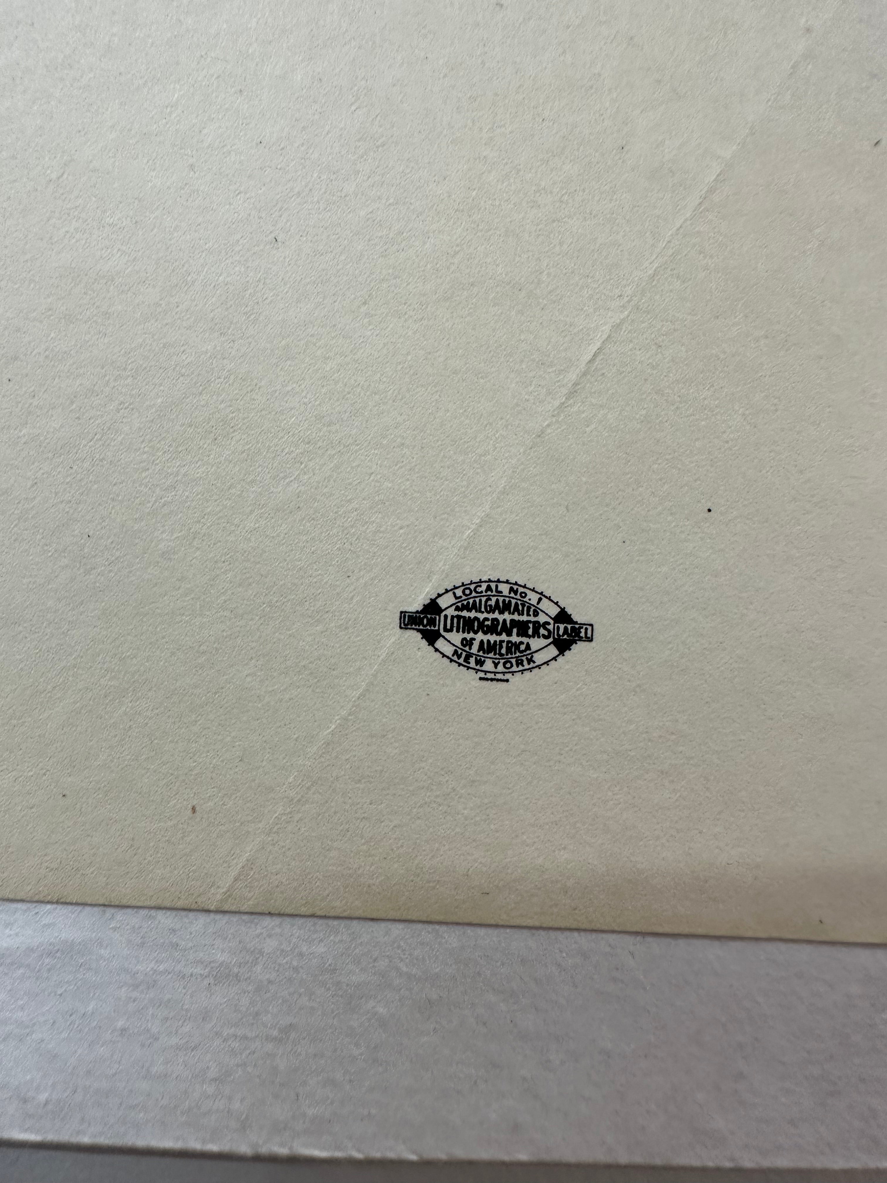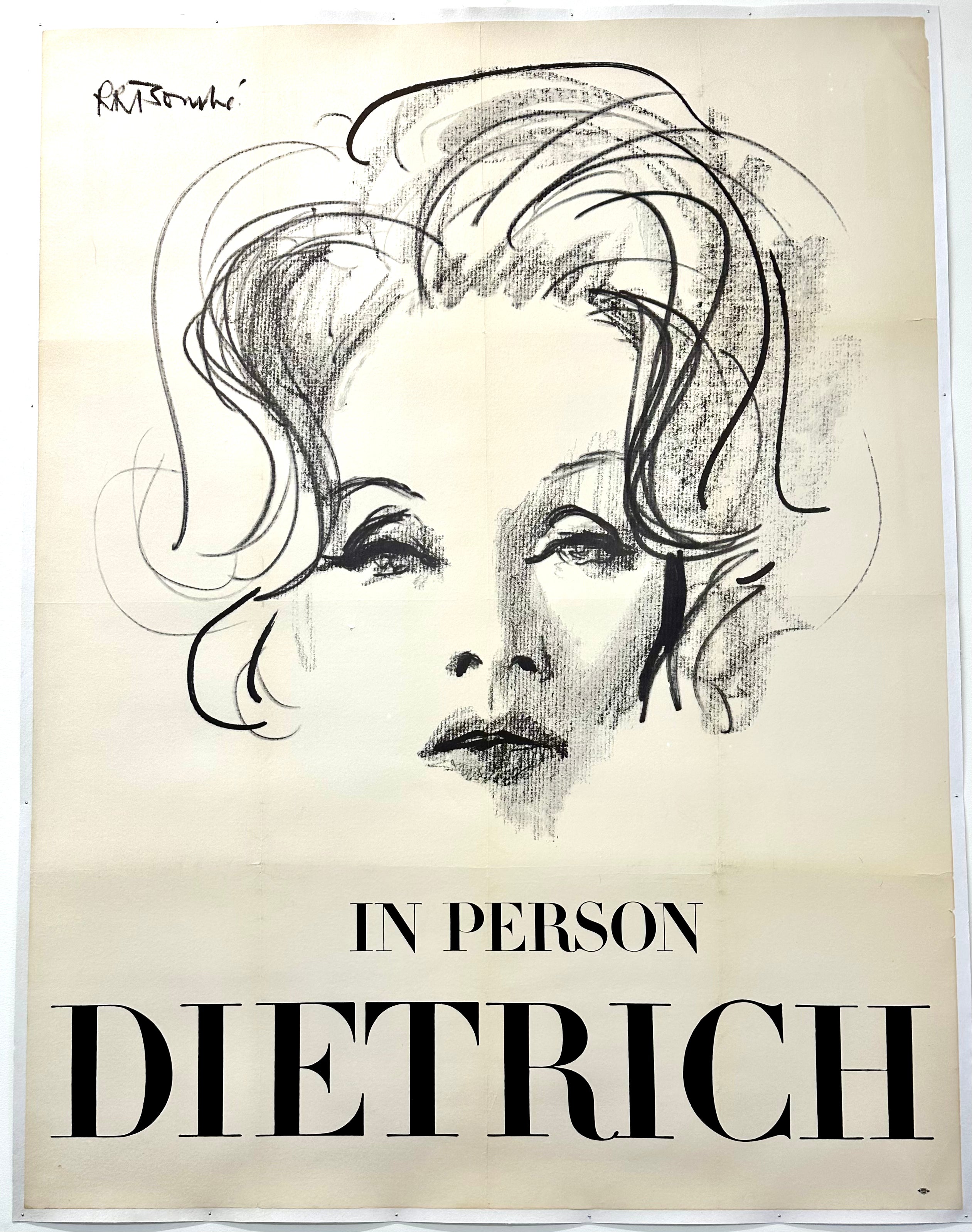 Enormous original NY-printed ca. 1960 poster created for the one-woman performances of Marlene Dietrich with music arranged by Burt Bacharach. The drawing, which also appeared on the cover of the 1961 book "Marlene Dietrich ABC," is by René Bouché, artist and fashion illustrator, known for his work in Vogue magazine between the 1930s and 1960s. This example originally from the personal collection of Marlene Dietrich, then to Paul McMahon, a critic, photographer and artist who worked for more than 13 years touring with her as the icon’s stage manager, announcer, dresser, secretary and escort. Sold together with a letter of provenance from the husband of Paul McMahon, Ralph Hodgdon. A few small abrasions and nicks as well as now flattened but visible creases; well-restored and linen/canvas-backed. Please note this the original first printing of this often-reproduced poster, later issued in smaller formats, on different stock, and with variations and Paris and other printing locations. 41 x 53.5 inches.