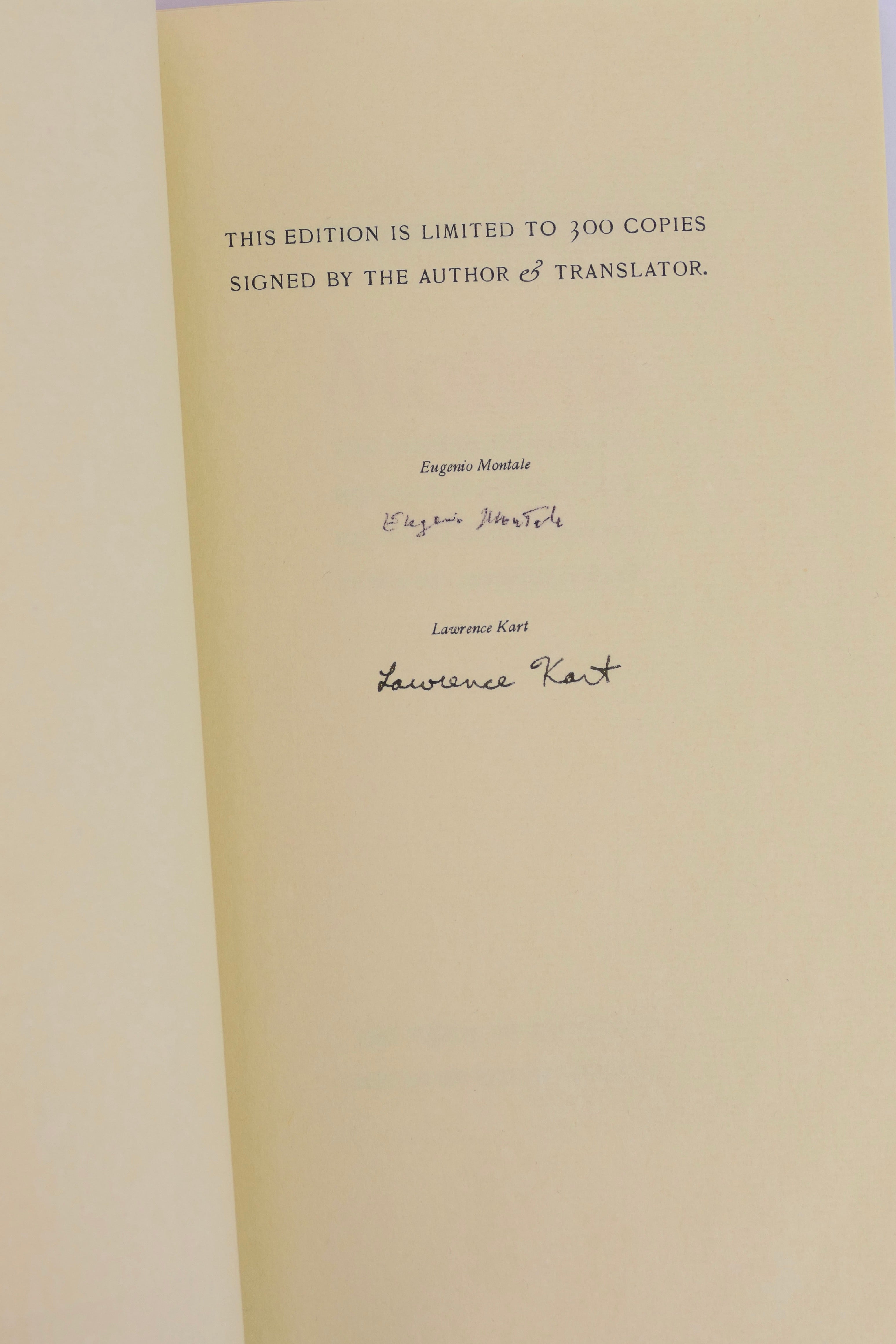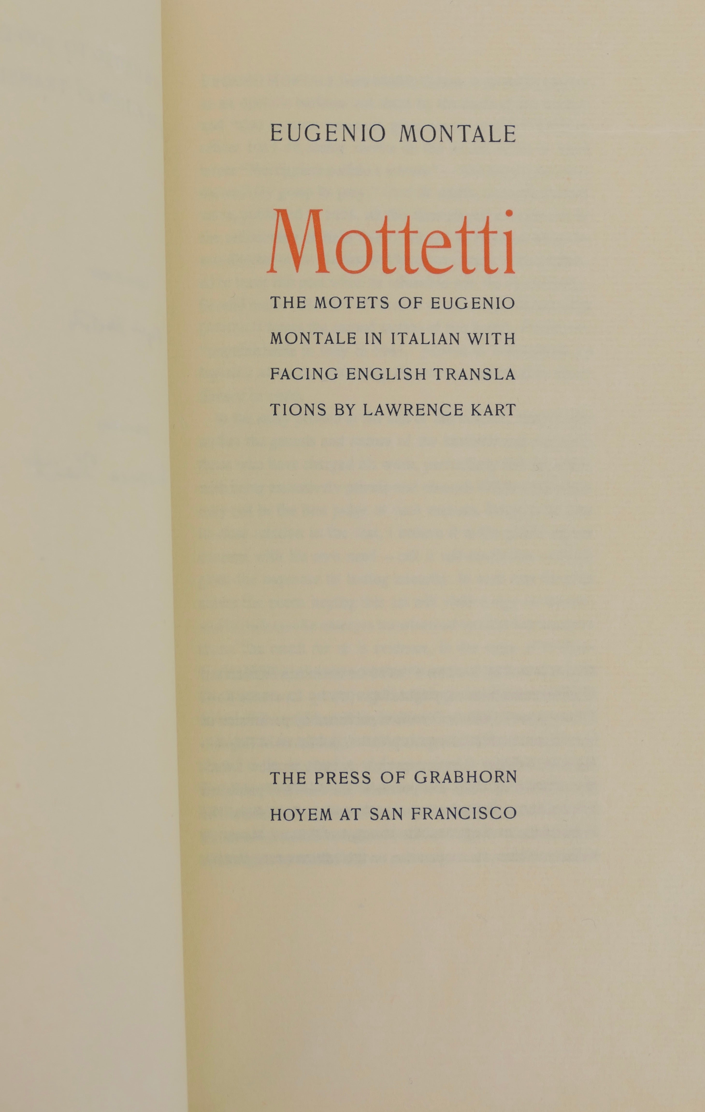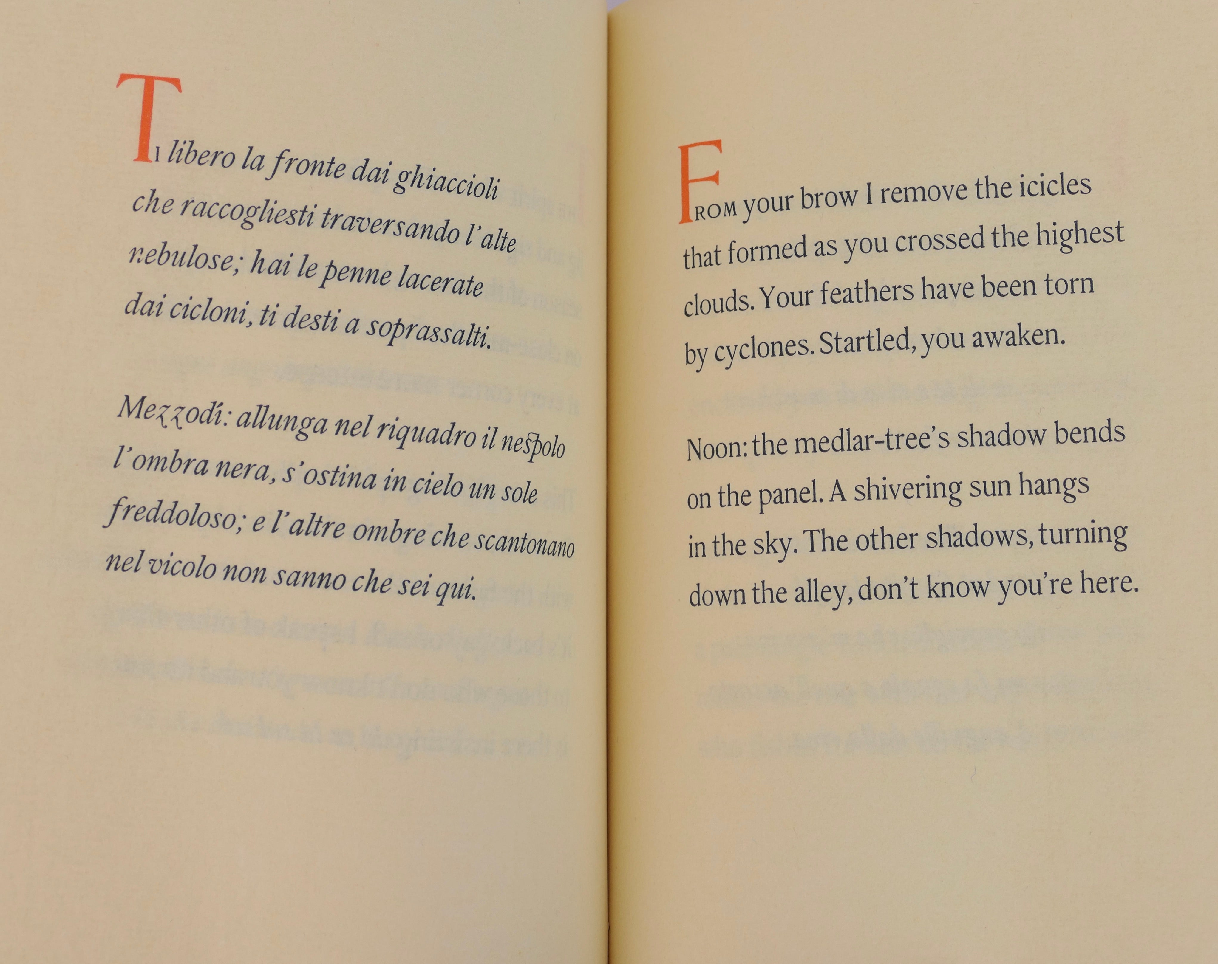 Soft cover, yellow silk sewn covers. Tall 8vo. One of 300 copies signed by the author and translator. Parallel Italian English text for the poems, printed in two colours. Interior pages are clean and bright., in pristine covers, overall in fine condition.