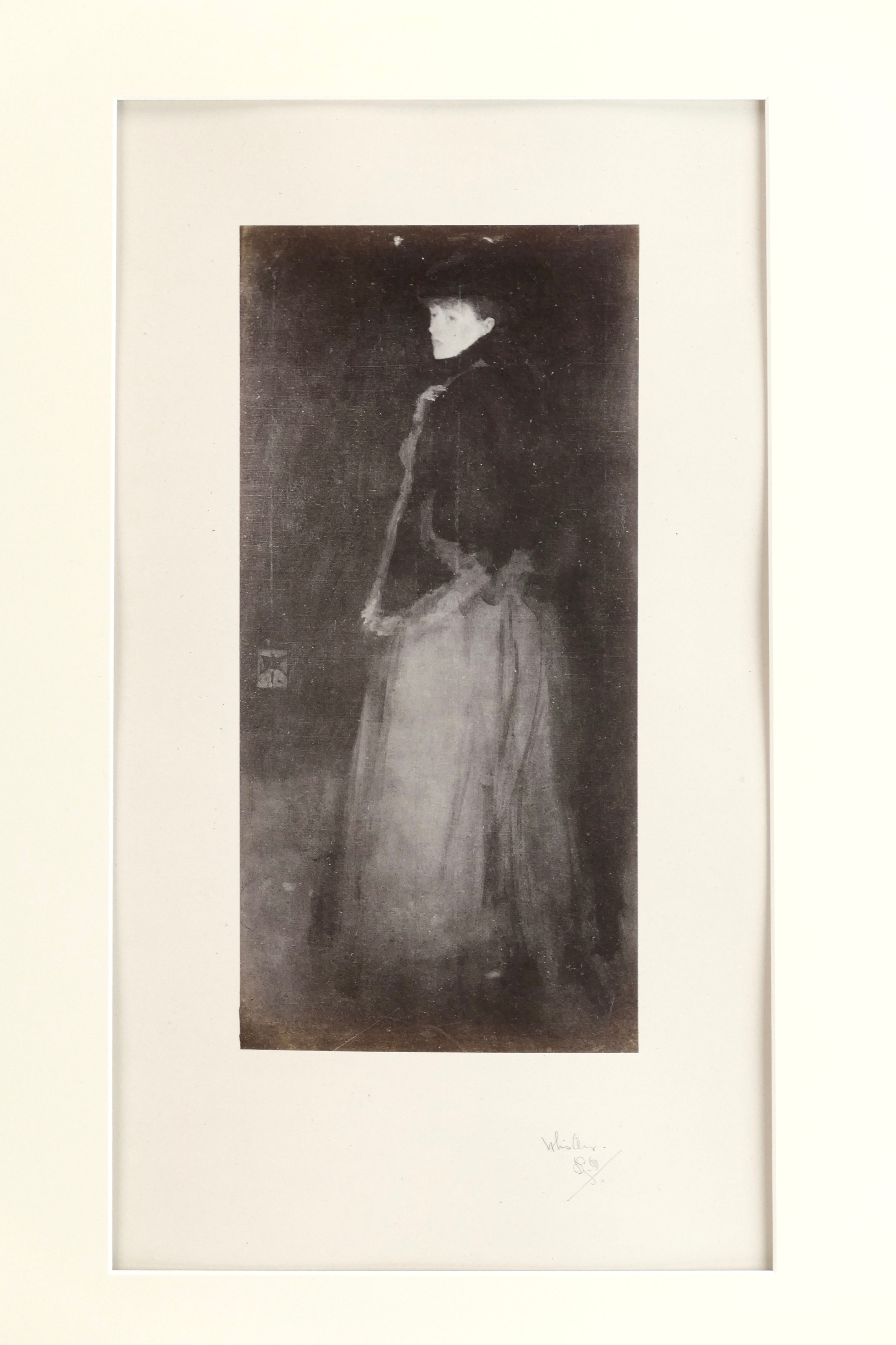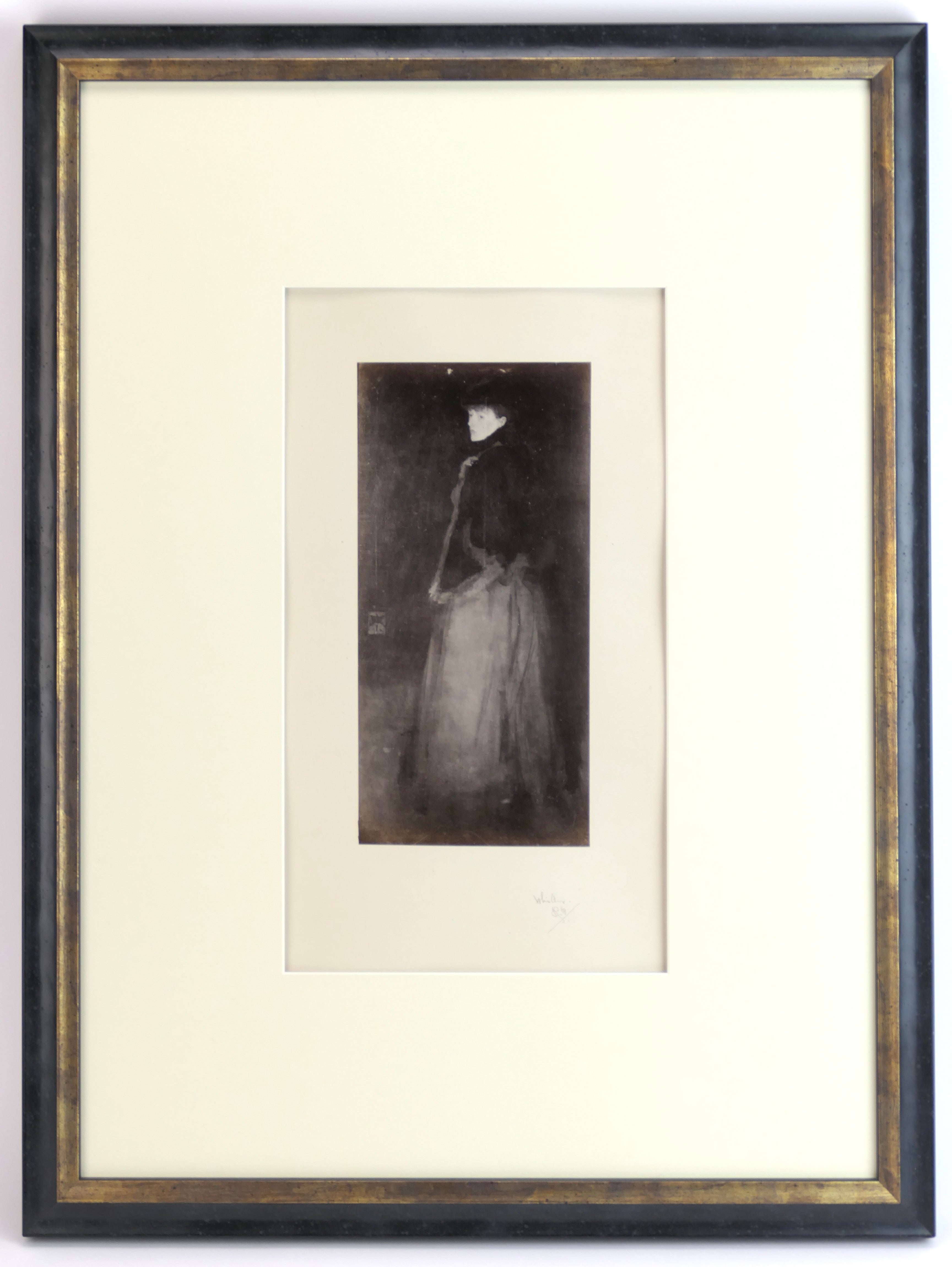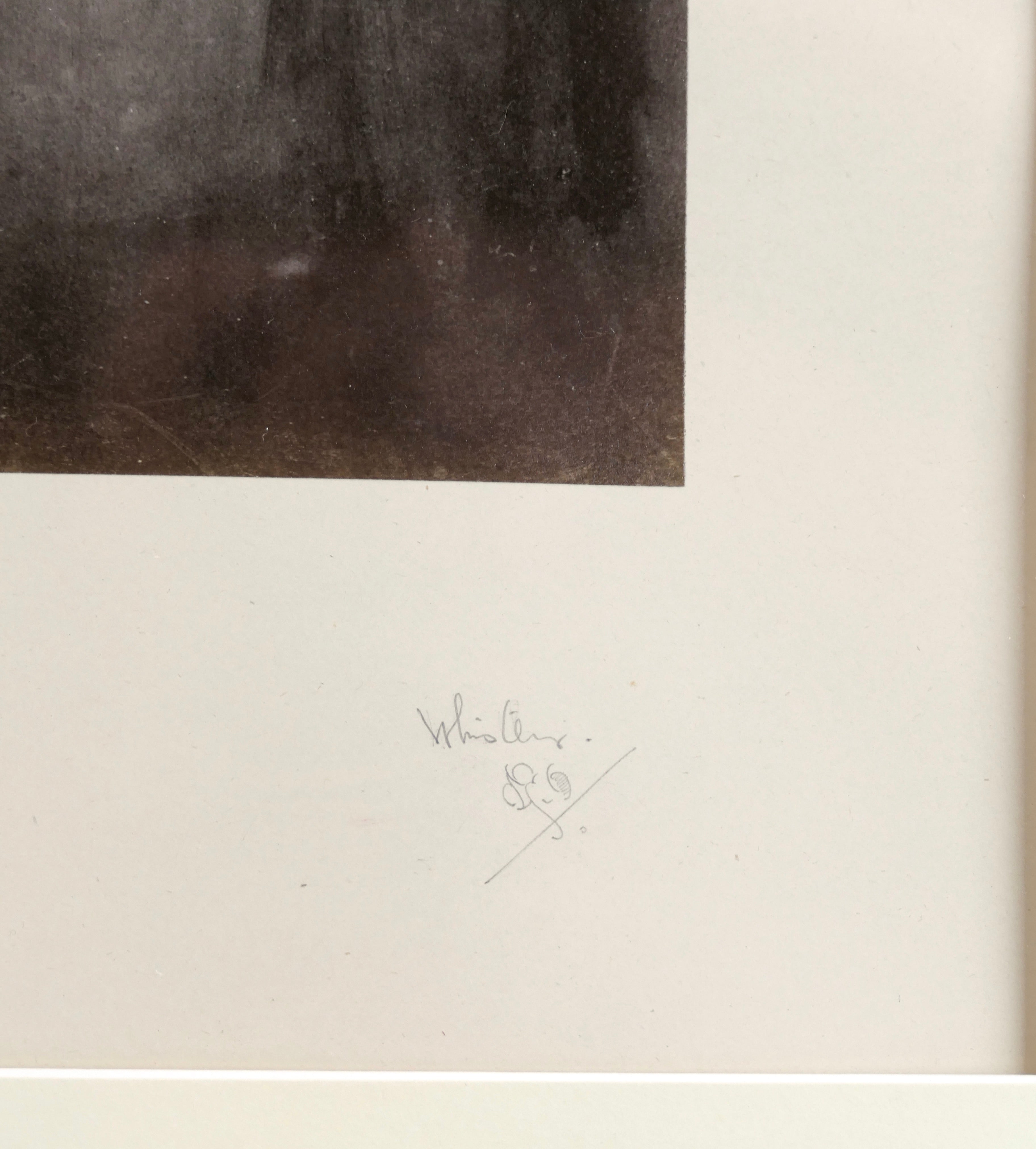 First edition of this image, from the portfolio Nocturnes-Marines-Chevalet Pieces (1892) as photographed by William Gray, Glasgow and issued by Goupil Gallery, London, being one (of 24) mounted photographs of the artist's paintings, each signed by the artist "Whistler" and with his butterfly device on the leaf below the photograph. Reportedly, only a small number of these signed collections were prepared and successfully sold, and of those, most were split up. Image measures 10 x 4.75 inches with the mat window measuring 14 x 7.75. The frame measures 24.75 x 18.5 x 1 inches.