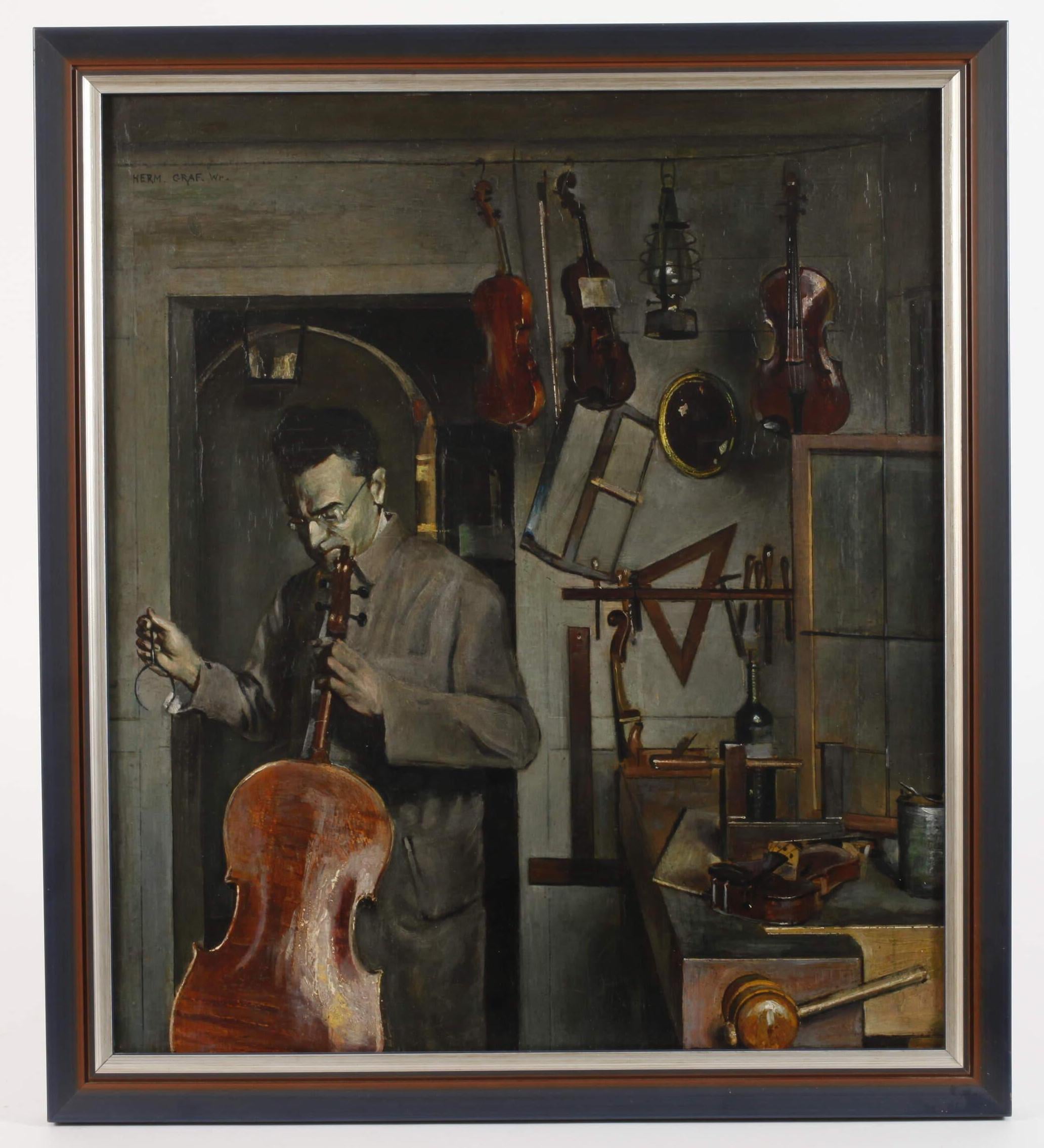 An instrument maker with cello and his tools is shown finishing the instrument in his workshop, while in the background on the wall hang other various luthier's tools and instruments as well as other string instruments. A very fine and atmospheric genre painting with beautiful treatment of the light by the German realist painter known for his quiet, introspective interiors, often illuminated by natural light, which he created in Weimar.