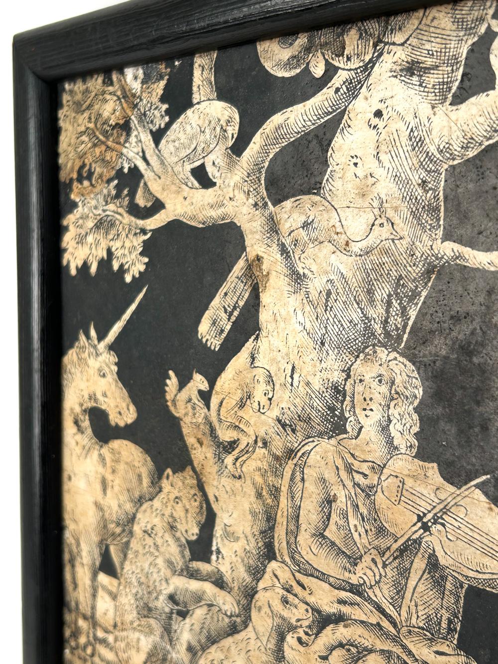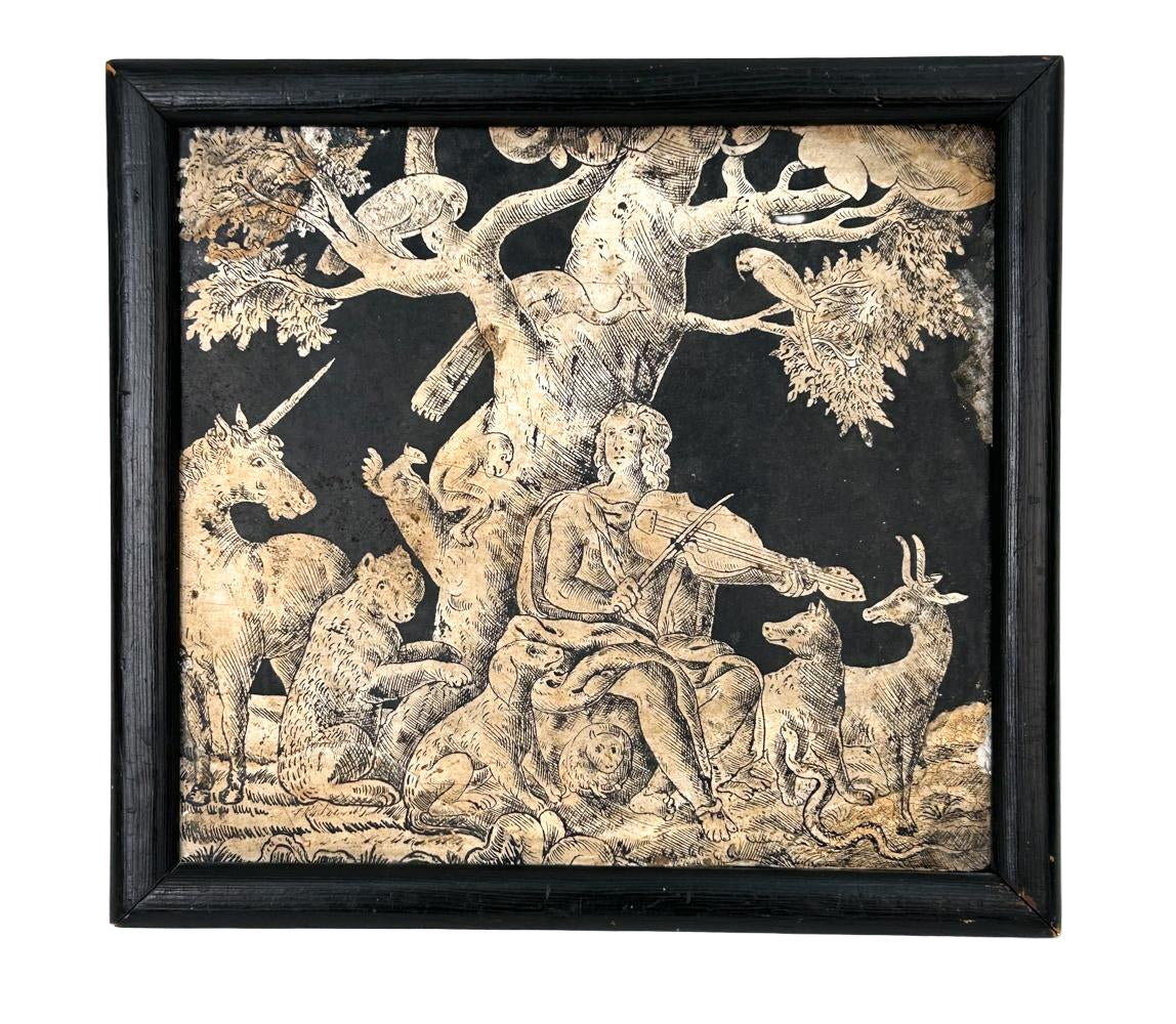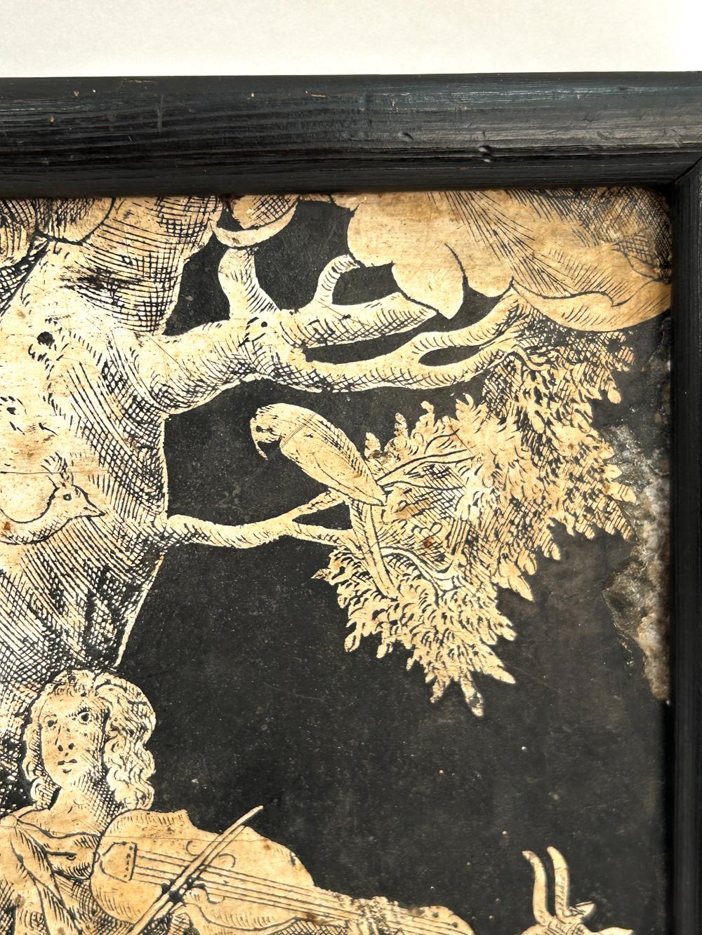 Large thick tile with pen and ink of Orpheus with his violin under a tree surrounded by trees and birds. In a later frame. Unsigned but Dutch, probably second half of the 17th century. Tile with left side corners broken and repaired. Surface with yellowing and some pitting, rubbing to right edge. Frame measures 10 x 11.25 inches (25.5 x 28.6 cm).