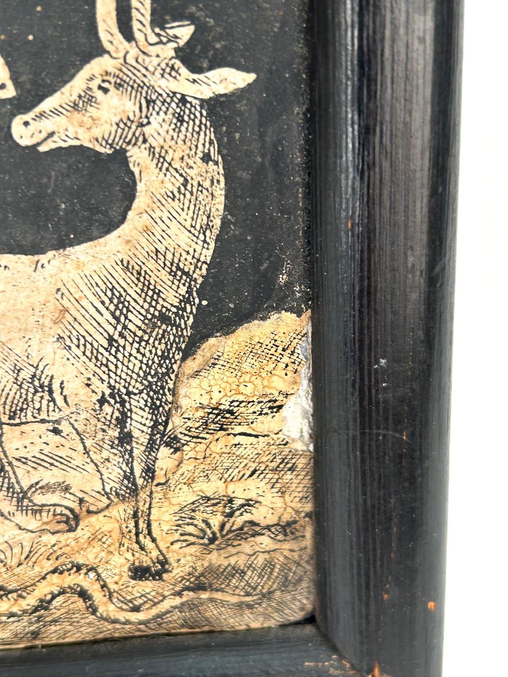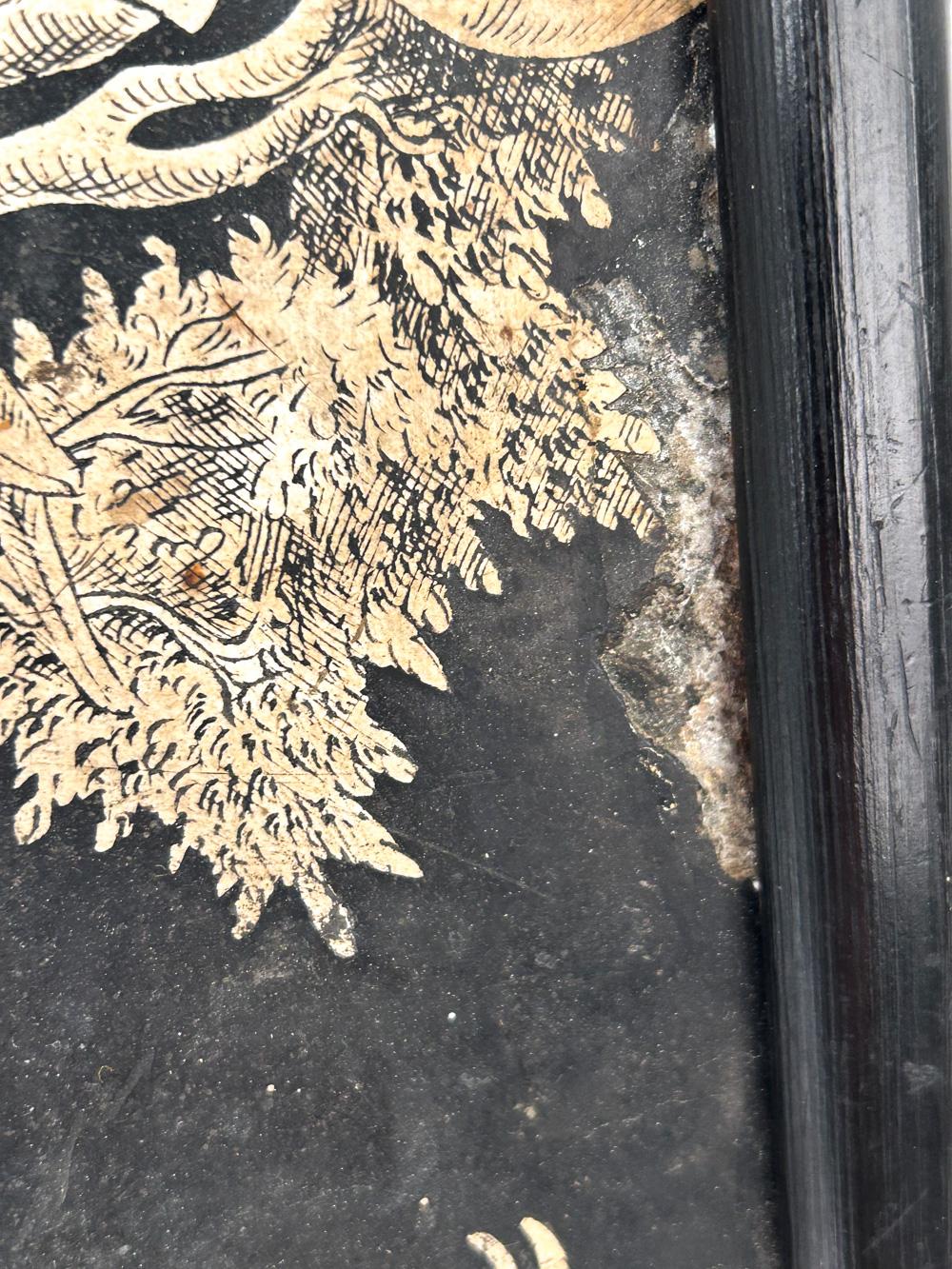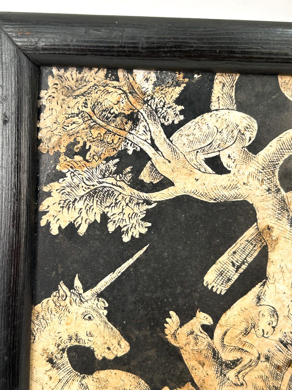 Large thick tile with pen and ink of Orpheus with his violin under a tree surrounded by trees and birds. In a later frame. Unsigned but Dutch, probably second half of the 17th century. Tile with left side corners broken and repaired. Surface with yellowing and some pitting, rubbing to right edge. Frame measures 10 x 11.25 inches (25.5 x 28.6 cm).