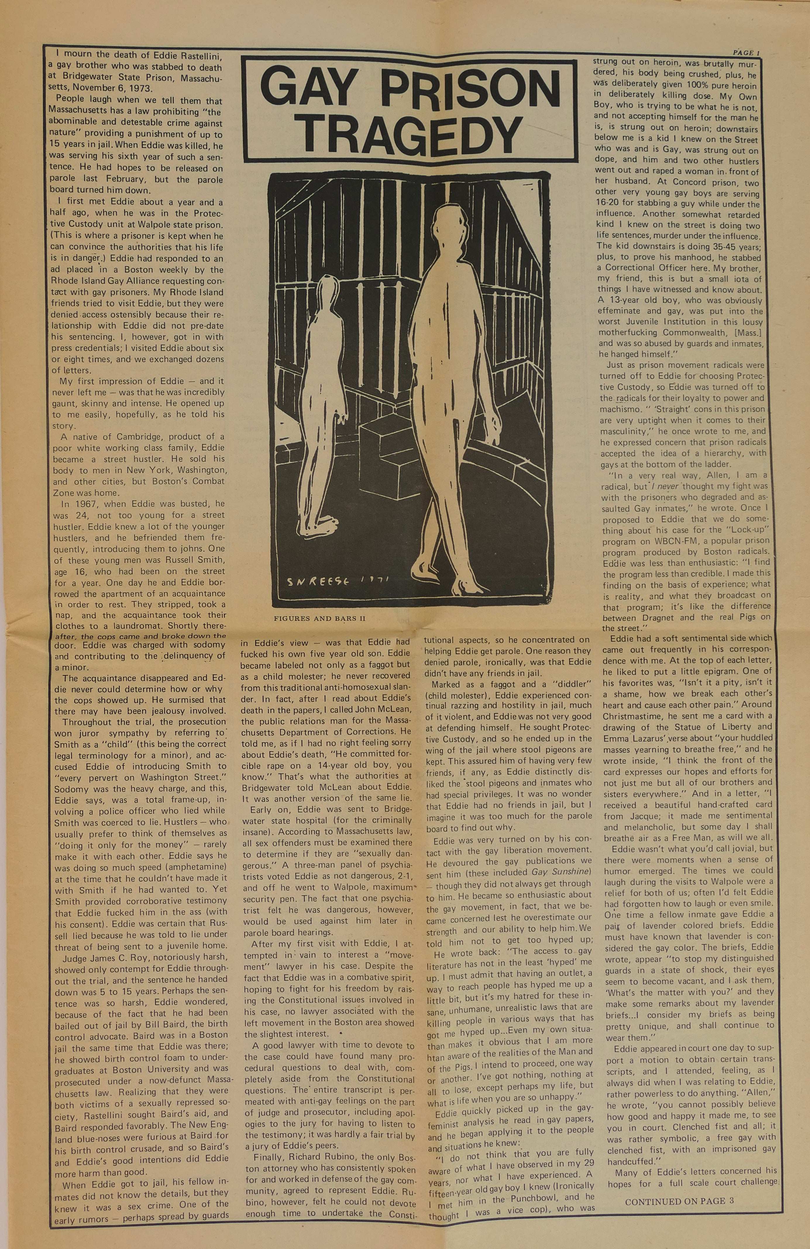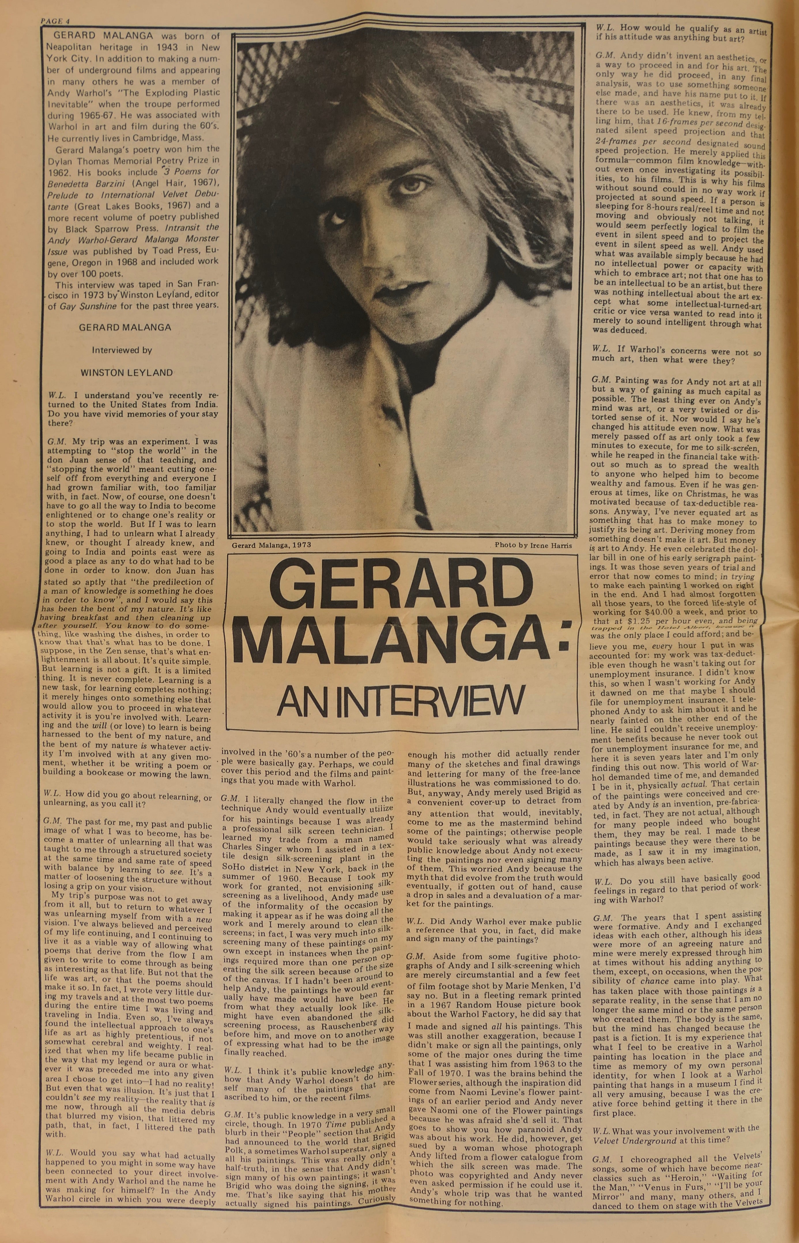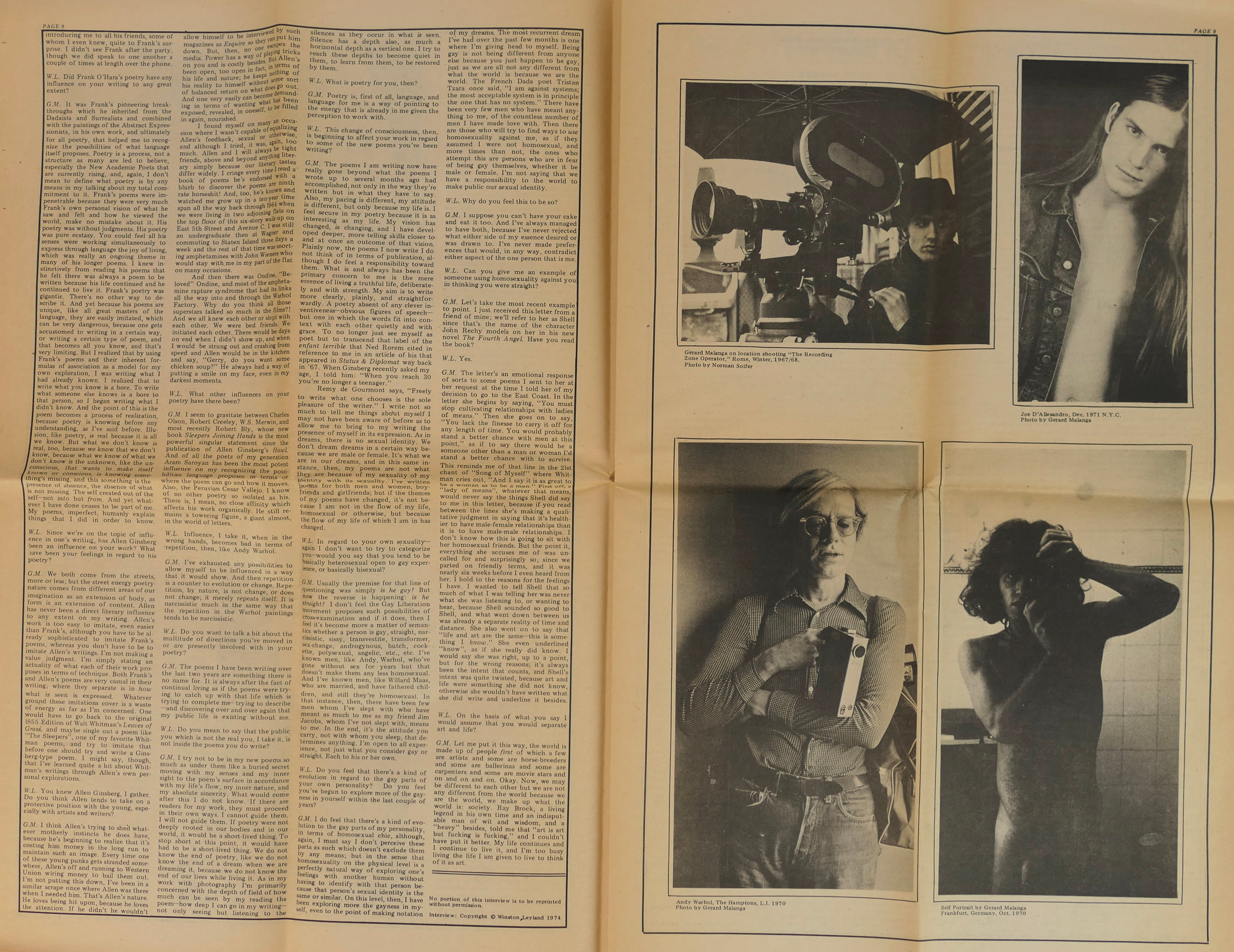 An uncommon copy of the San Francisco-based gay newspaper including news, commentary, calendar events, personal ads, etc., and including an an interesting interview and article on artist and Andy Warhol acolyte, Gerard Malanga, including photos and mentions of Warhol himself and Joe D'Allesandro, as well as poems by Joe Brainard and others. 24 pp. Toned, a few nicks around the edges, overall a fine copy.
