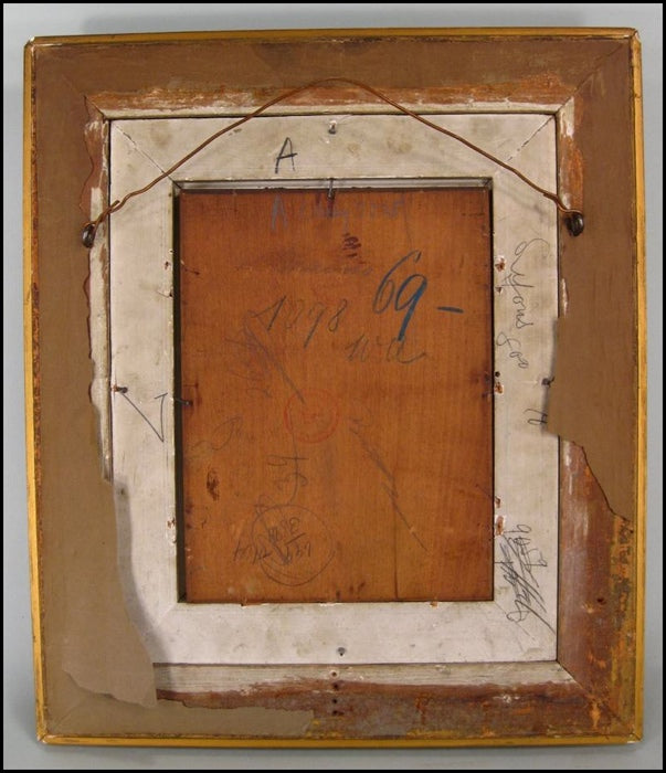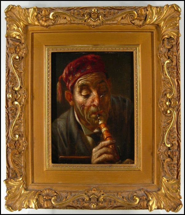 Original oil on panel painting of a recorder player, accomplished by an unknown highly skilled European School painter. In an attractive wood gilt frame, 8 x 6 inches, framed to 14.5 x 12.5 inches overall. Minor losses and rubbing to frame, but otherwise in very fine condition.