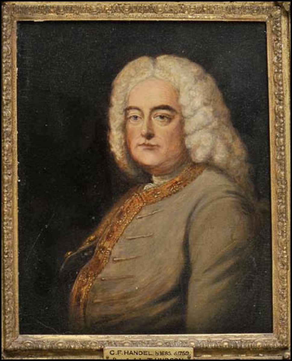 Handel, George Frederic. (1685-1759) [after Thomas Hudson (1701-1779)]. Original 18th Century Portrait. Head and shoulders portrait after Thomas Hudson, oil on panel, probably late 18th century. 24 x 19 cm (9.5 x 7.5 ins), old gilt frame with title and artist label attributing the portrait to Thomas Hudson to lower edge, David Messum gallery label to frame verso. Provenance: David Messum Gallery [now Messum's], 1983.