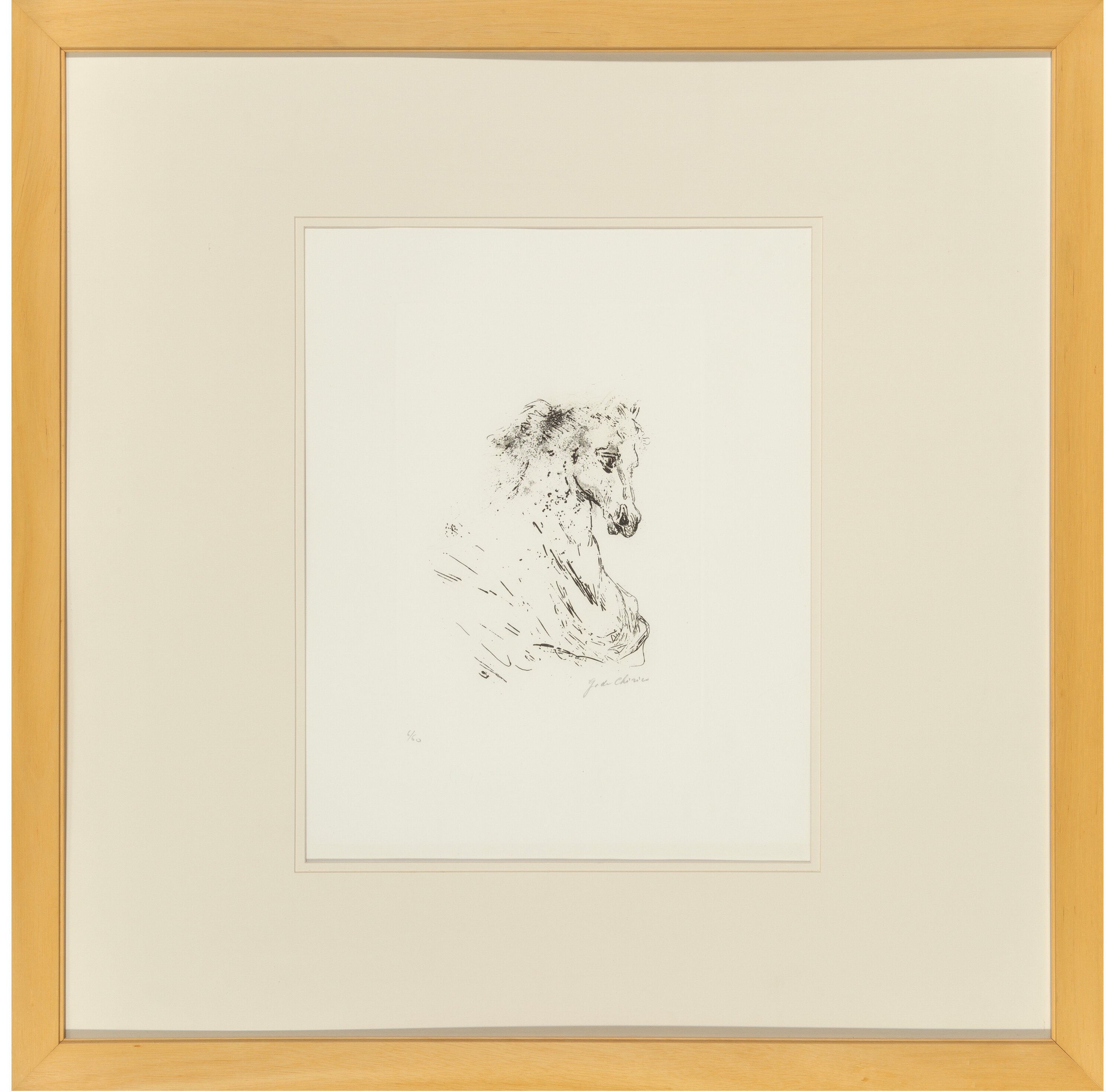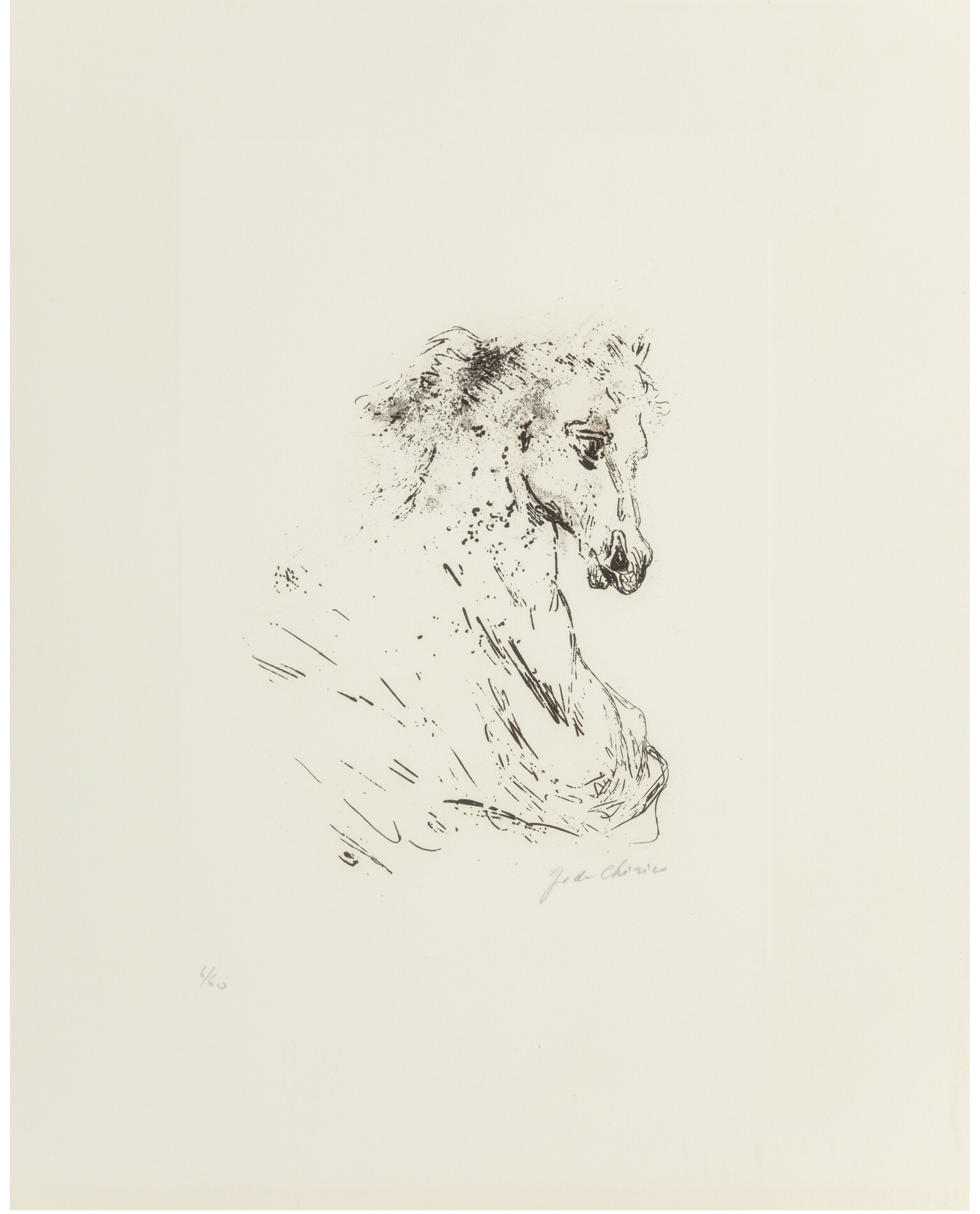Etching on wove paper, 20-1/4 x 16-1/8 inches (51.4 x 41 cm) (sight). Ed. 6/60. Signed and numbered in pencil along lower edge. Mild scattered handling creases, most notably to the right margin. Not examined out of frame. Matted and framed under acrylic. Framed Dimensions 35 x 35 inches.