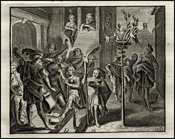 [Music Iconography] Cats, Jacob. (1577-1660). 18th Century Dutch Etching. A fine etching from a 1726 edition of 'Alle de Wercken van den heere Jacob Cats....." showing a band of musicians performing in the street. Etching measures 140 x 107mm within a larger sheet with text.