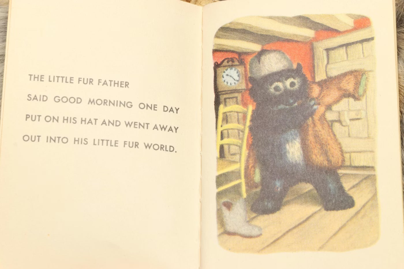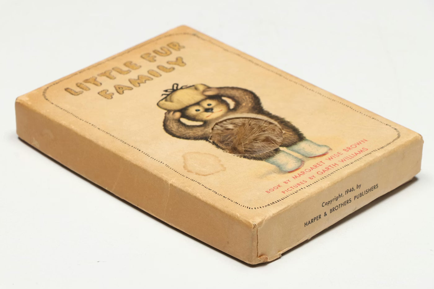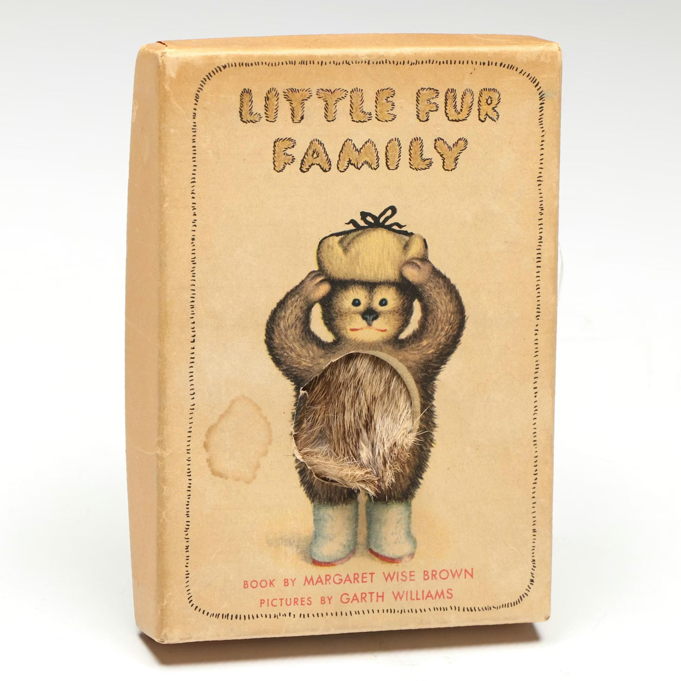 First edition of this beloved Margaret Wise Brown classic, with the child bear’s furry belly peeping through the publisher’s die-cut box. 16mo (83 x 50mm). Color illustrations by Garth Williams in publisher’s fur-covered boards and die-cut pictorial box. Usual page toning; shaken but tight binding with slightly loose hinges; light bowing and wear to boards and backstrip; small stain, light peeling, bowing, and wear to box.