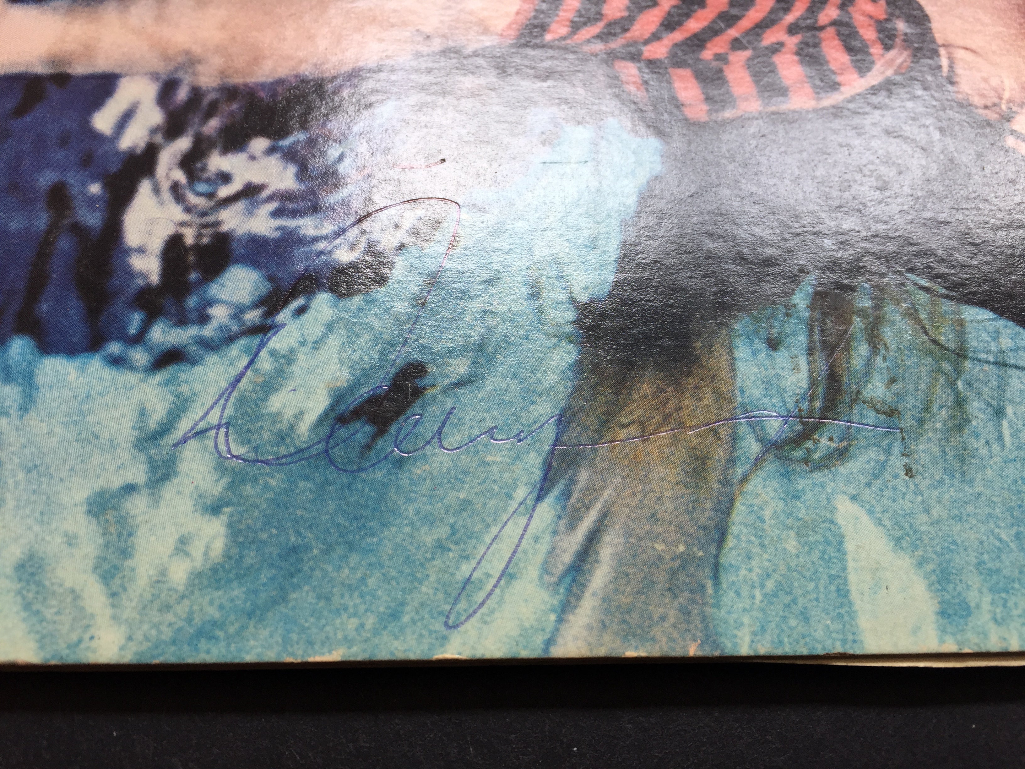 1967 LP of "The Mamas & The Papas Deliver," signed on the cover by all four members of the band: Cass Elliot, Michelle Phillips, John Phillips, and Denny Doherty. Slightly poor contrast to some of the signatures, which are signed in blue ballpoint over the light blue background; some slight shelf wear and creases at the lower left; LP in good to very good playing condition; overall very good. 12.25 inches (31 cm) square.
