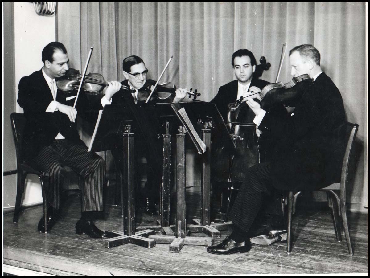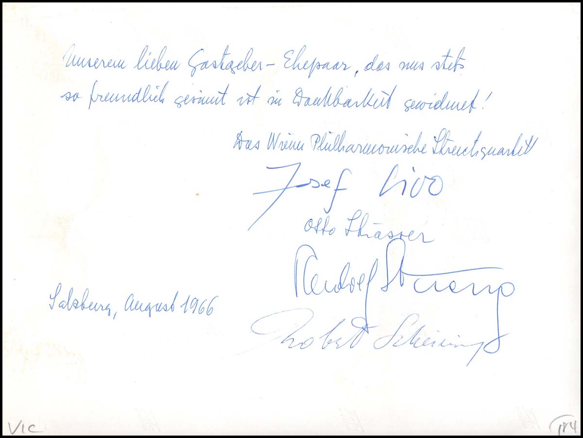 Vintage glossy photograph signed and inscribed on the verso by the members of the Vienna Philharmonic String Quartet (Josef Sivo, Otto Strasser, Rudolf Streng, Robert Scheiwein), Salzburg, August 1966. 23.5 x 18 cm. Fine.