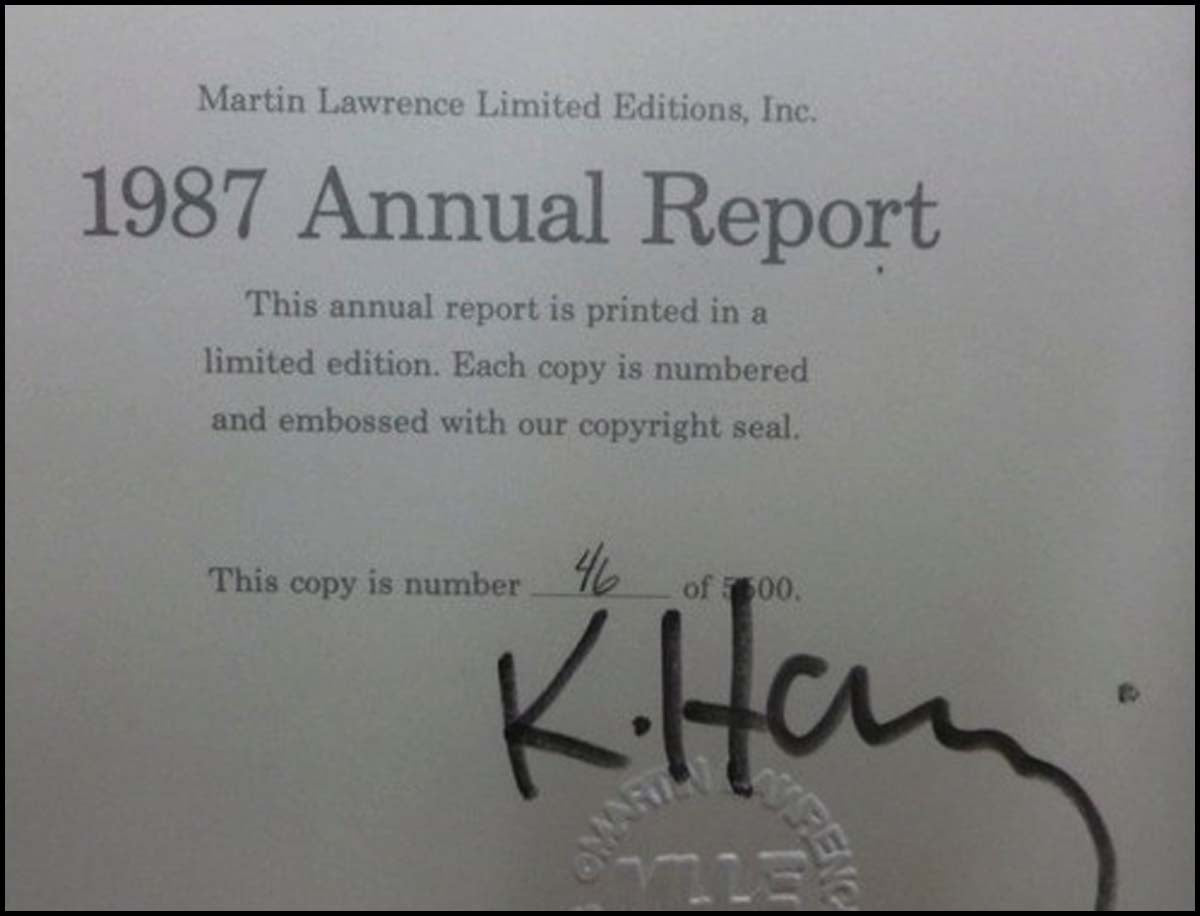 Martin Lawrence Limited Editions 1987 Annual Report and Calendar, signed by Keith Haring, who did the cover art specially commissioned for this report. Limited Edition No. 0046/5500, softcover, 24 pages. Very Good condition with light shelf wear at corners and edges, front cover slightly curled and with some small spots along one edge. Binding secure.