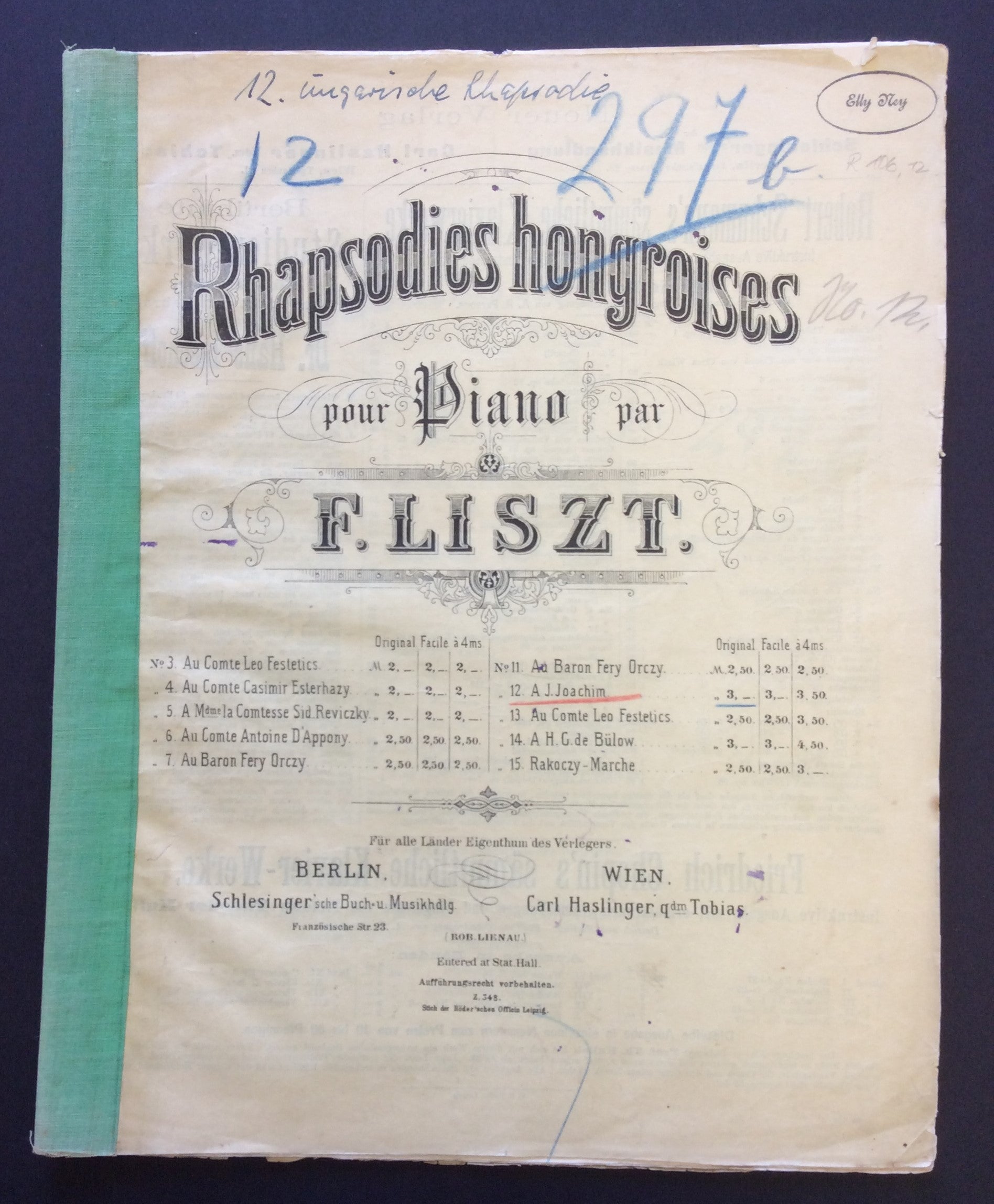 [Ney, Elly. (1882–1968)] Liszt, Franz. (1811–1886). Rhapsodies Hongroises no. 12 - THE COPY OF ELLY NEY. Berlin - Wien: Schlesinger-Haslinger. [Ca. 1875].