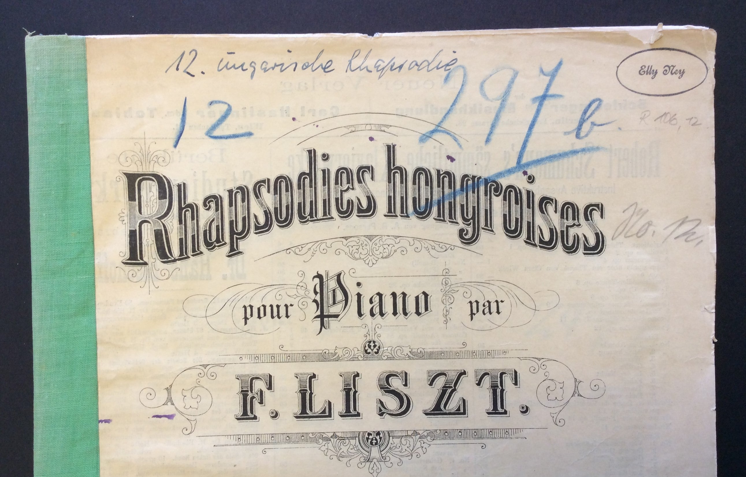 Score of Liszt's Hungarian Rhapsody no. 12 ("A J. Joachim"), with the ownership stamp of the important twentieth-century German pianist Elly Ney, who has also penned "12. Ungarische Rhapsodie" in blue ink at the head. A few paper repair within, edges lightly nicked with small tears, spine reinforced with green cloth, overall very good. There are no markings within the score.
