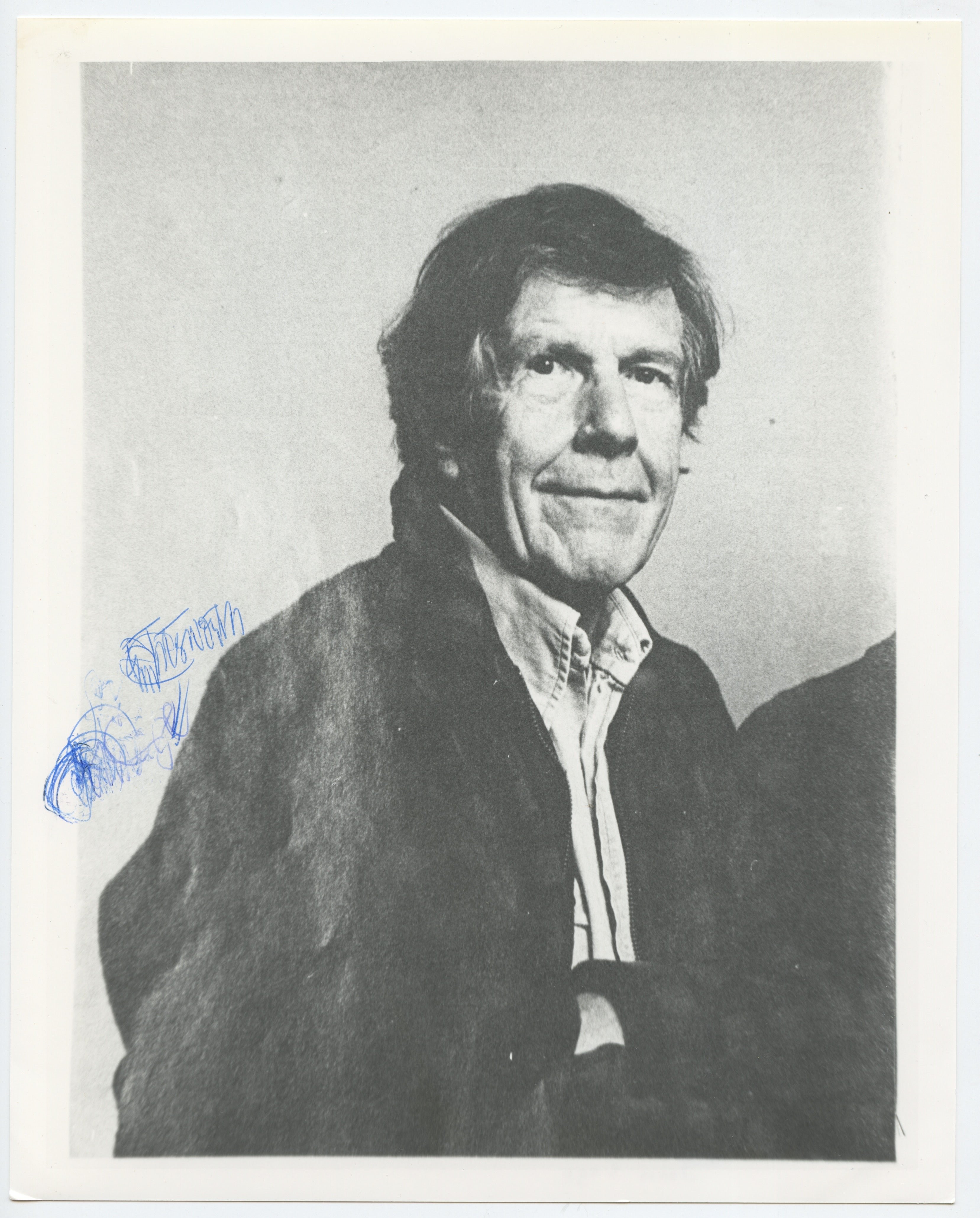 Original photograph, ca. 1980s, of the influential American composer who experimented with the nature of sound and devised new systems of musical notation. His innovative ideas on composition and performance influenced musicians, painters, and choreographers. Signed and inscribed in blue ink to the left lower light area, with evident pen issues having caused a sort of evocative multi-layering of his signature! Mild toning along the margins, otherwise in fine condition. 8 x 10 inches (20.3 x 25.4 cm.).