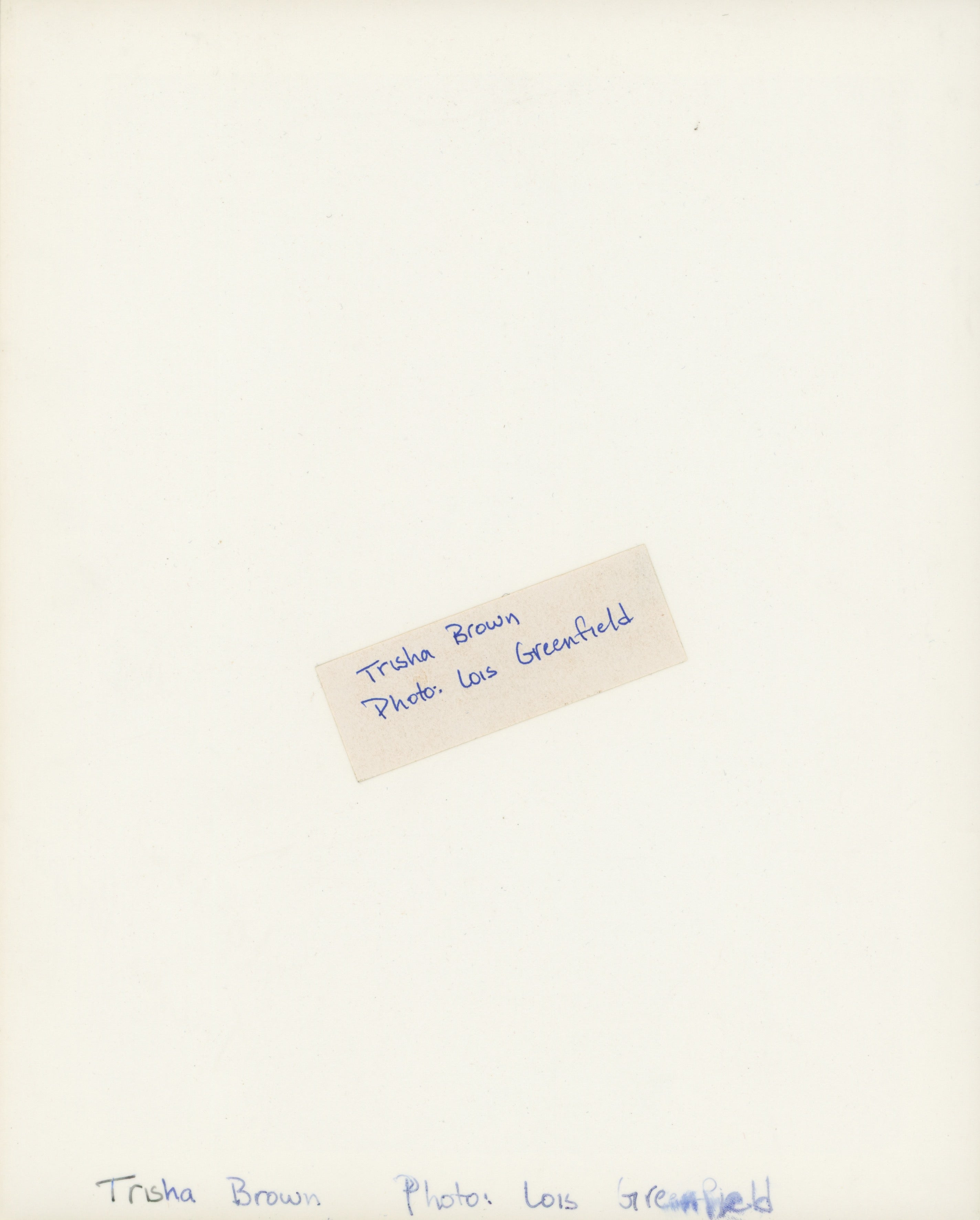Uncommon signed Louis Greenfield photograph of the American dancer and choreographer, an influential figure in postmodern dance and one of the founders of the judson Dance Theater, who has inscribed "to Paul / Trisha Brown." Label to verso, in very fine condition. 8 x 10 inches (20.3 x 25.4 cm.).