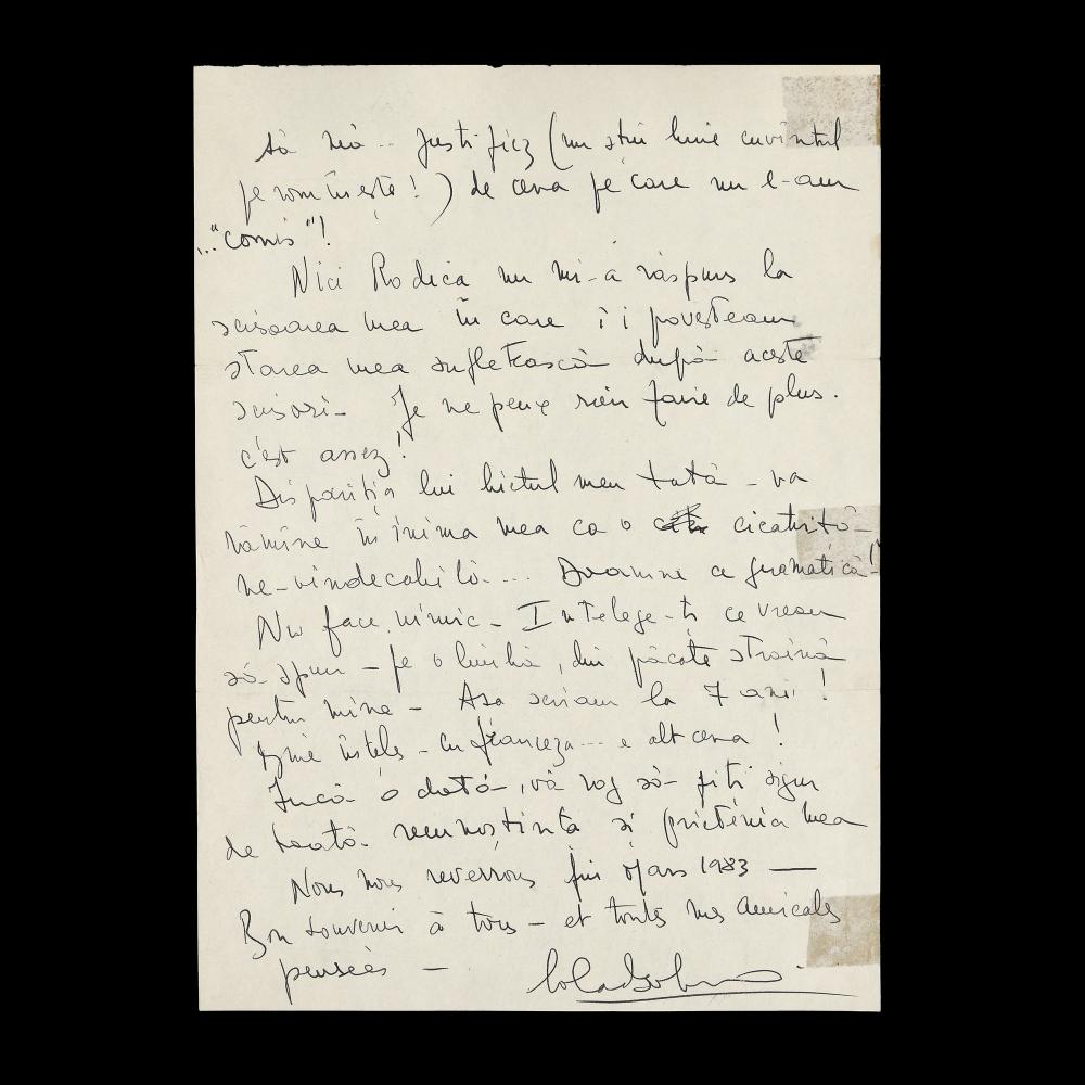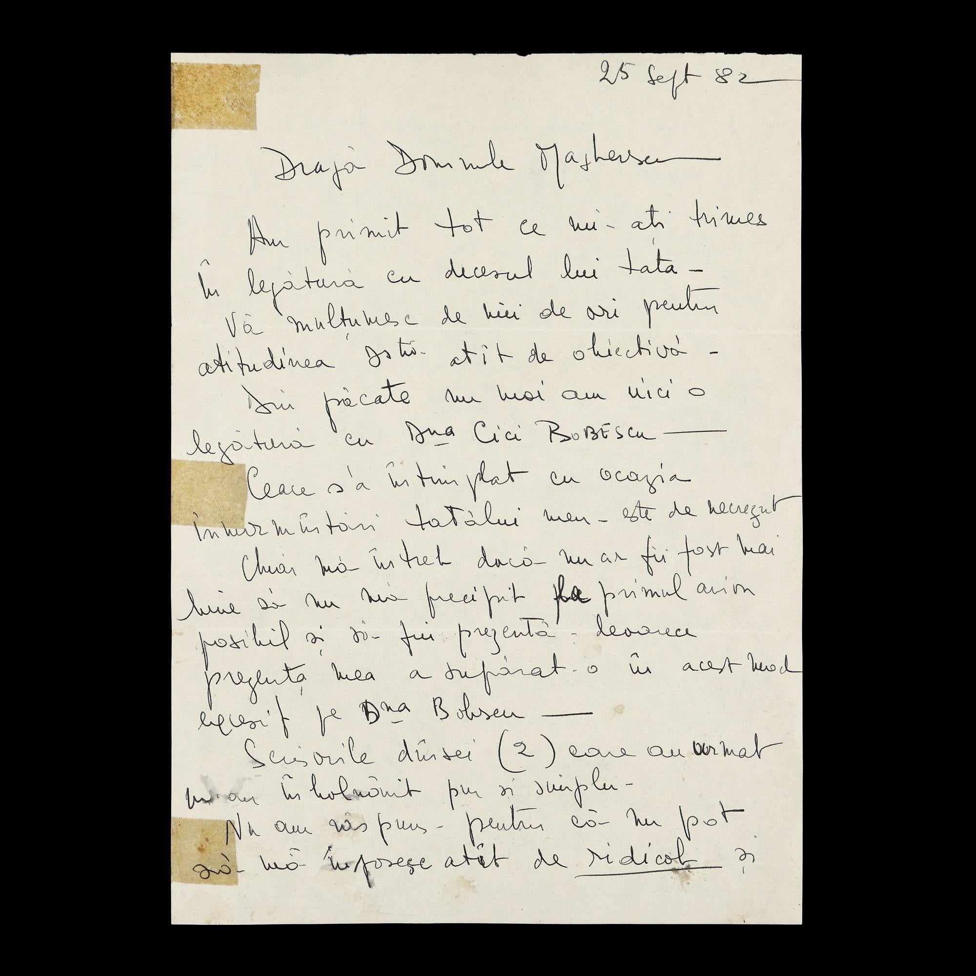 Bobesco, Lola. (1921–2003). Autograph Letter Signed to Colonel George Magherescu written on the occasion of her father's death..