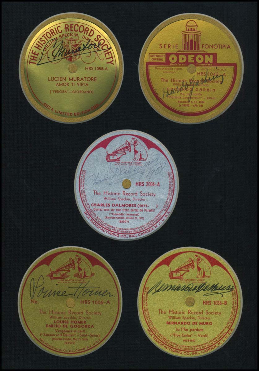 Attractive framed set of five "Historic Record Society" labels, each with an authentic signature in ink from a Golden Age of Opera legend: Louise Homer, Lucien Muratore, Charles Dalmores, Eduardo Garbin and Bernardo de Muro. Framed 15 x 11 inches. An unusual collection.