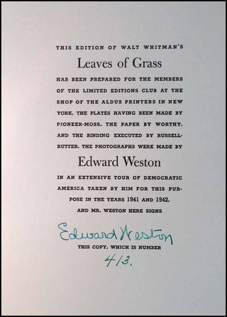 [Literature & Art] Whitman, Walt. (1819 - 1892) [Weston, Edward. (1886 - 1958)] Leaves of Grass