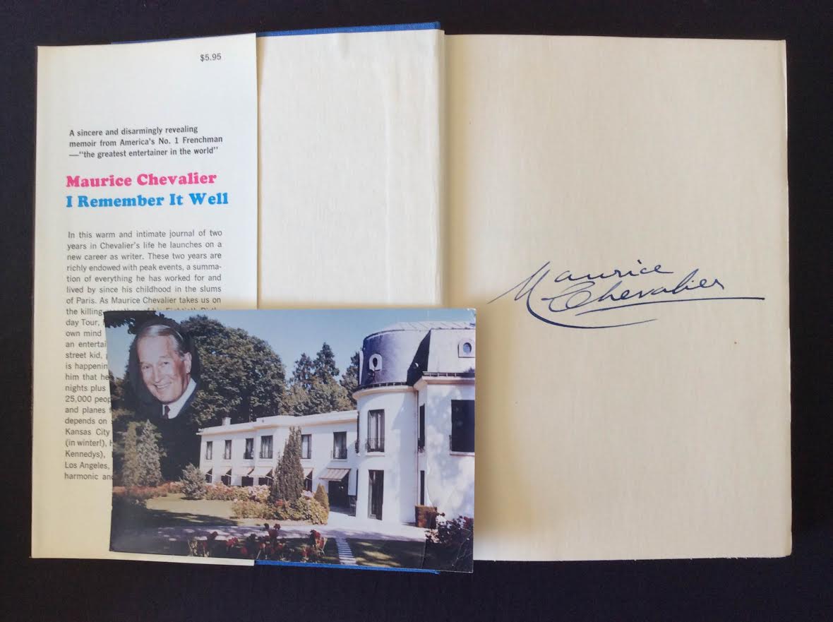 Chevalier, Maurice. (1888–1972) [Monteux, Doris Hodgkins. (1894–1984)] [Monteux, Pierre. (1875–1964)]. I Remember It Well - SIGNED WITH CARD INSCRIBED TO DORIS MONTEUX. New York : The Macmillan Company. 1970. First Printing. Autobiographical account of the great French entertainer's farewell tour, boldly signed on the front endpaper, together with a postcard of Chevalier's house and smiling face signed and inscribed to Doris Monteux, wife of Pierre Monteux, for New Year 1971. The book, described as a "sincere and disarmingly revealing memoir," is translated from the original French version and includes 16 pp. of photographs. Hardcover with original dust jacket, in fine condition. 221 pp. 5.75 x 8.5 inches (14.5 x 21.5 cm). From the estate of Monteux's daughter, Nancie Monteux Barendse.