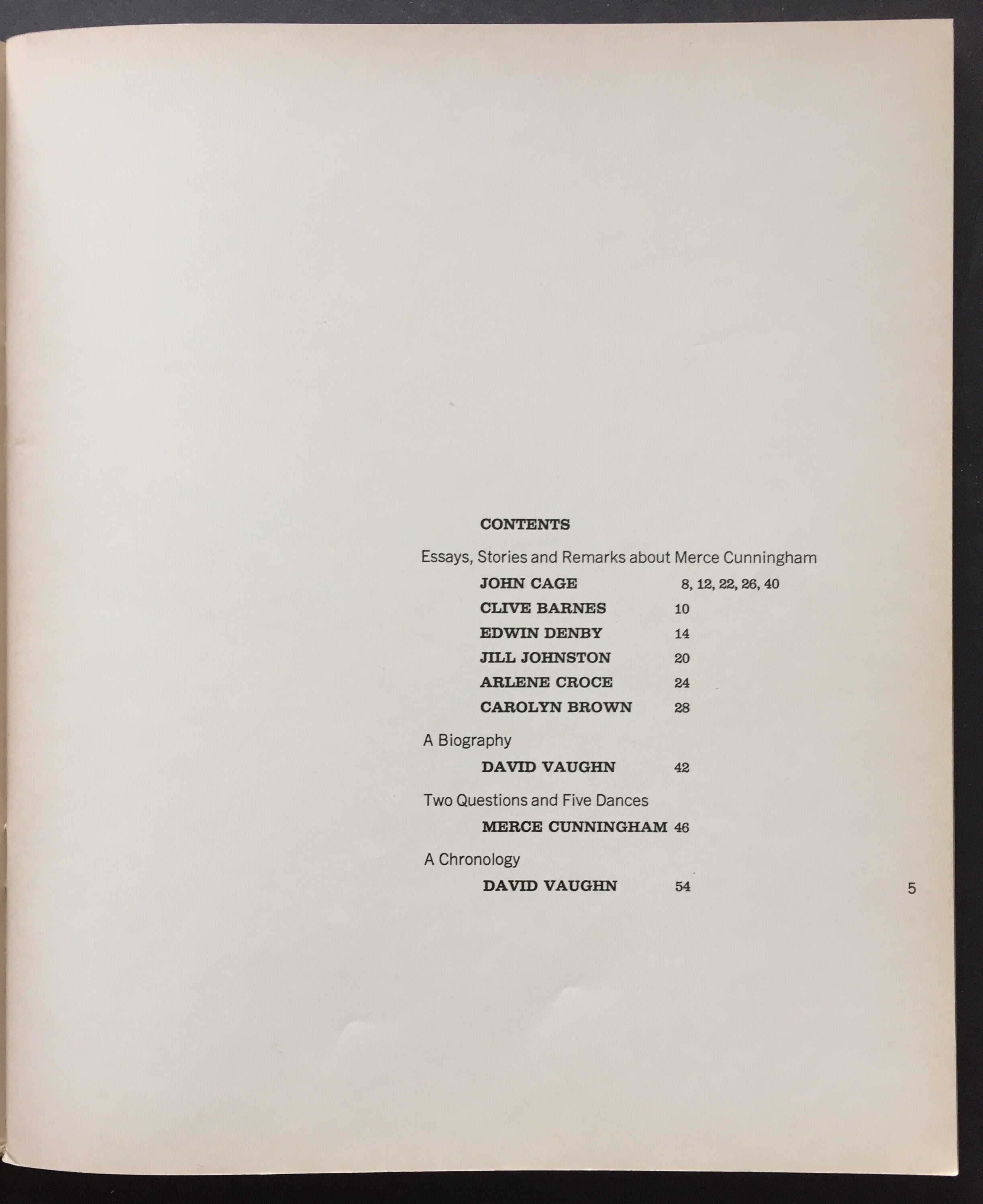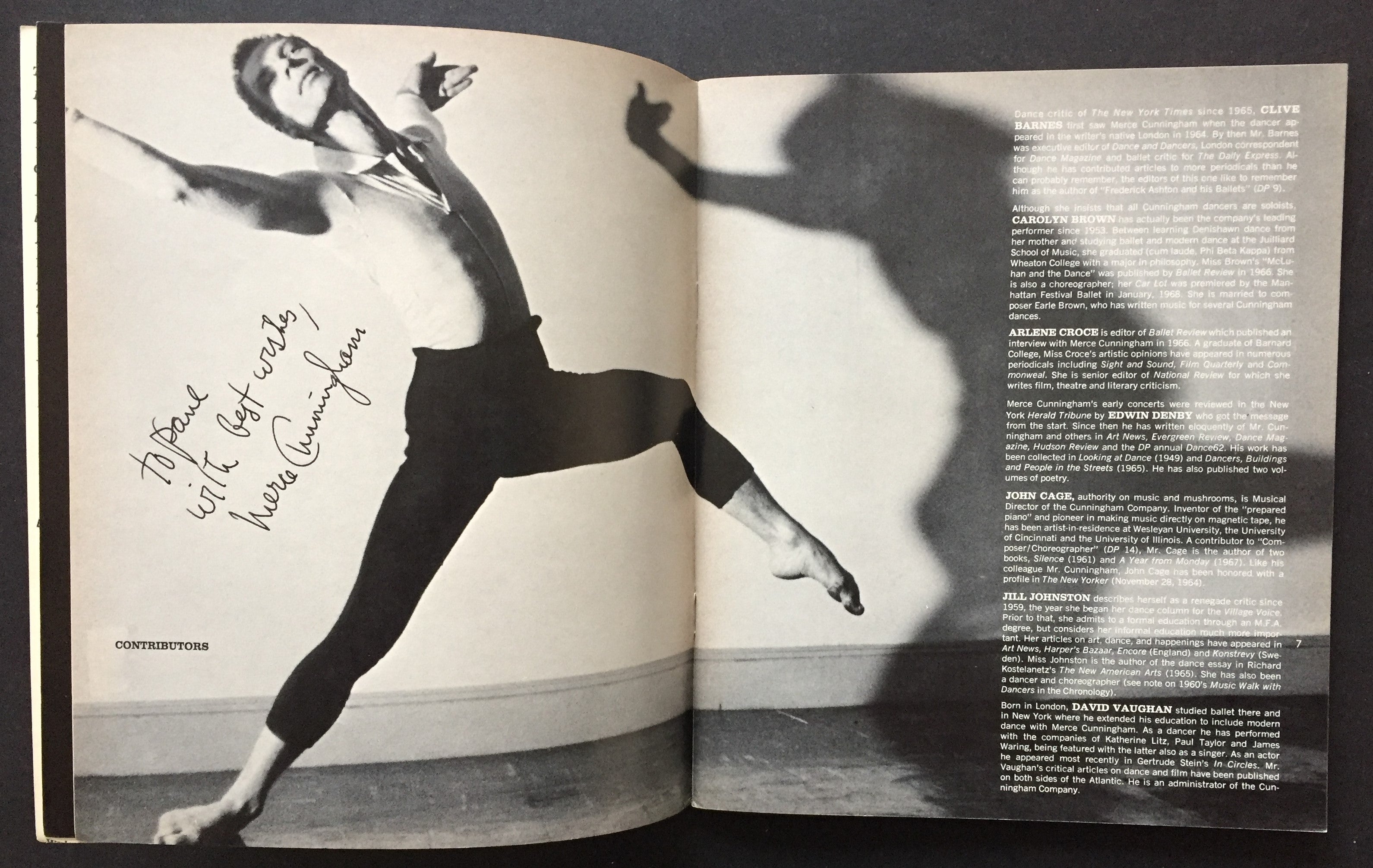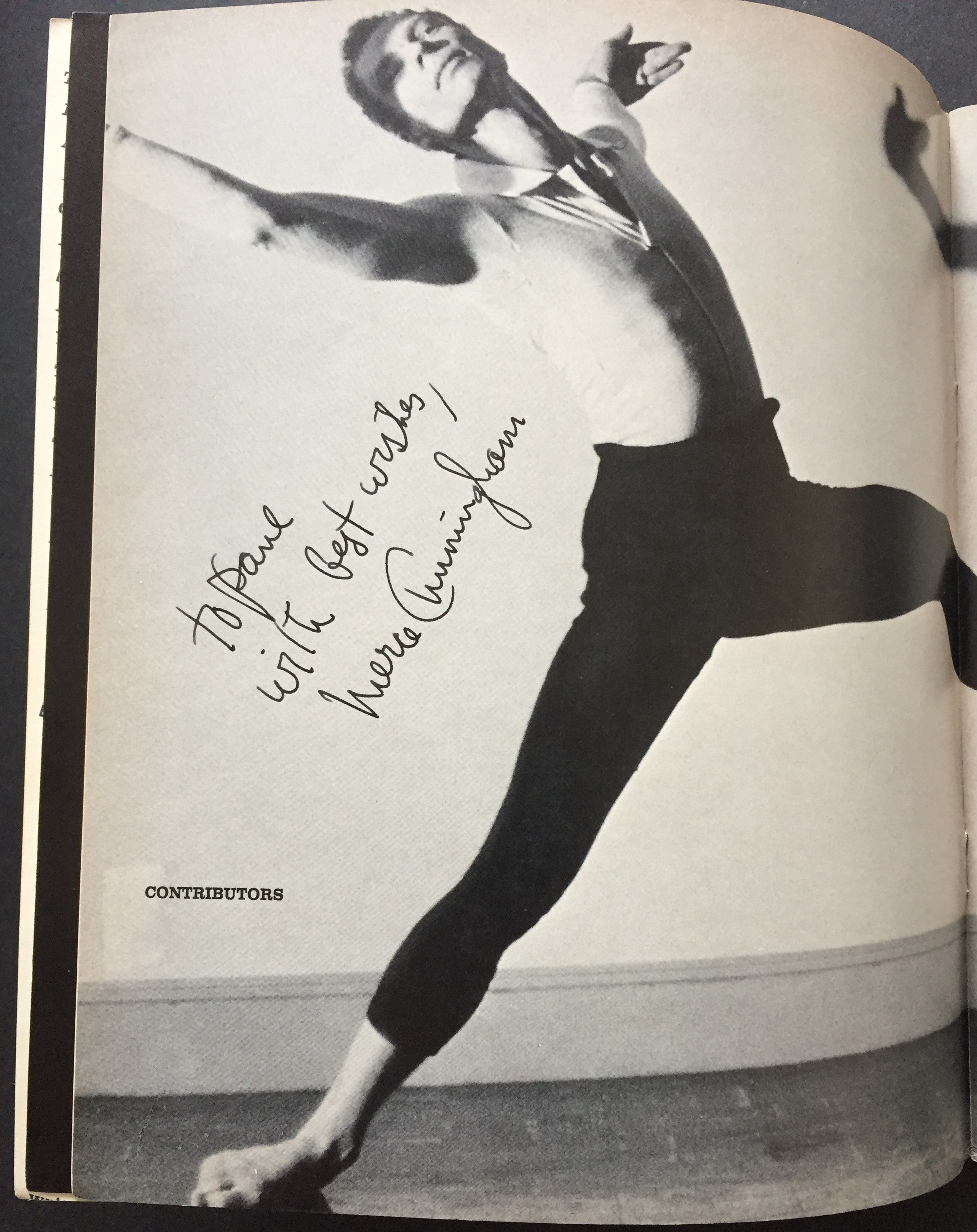 Signed periodical from the pioneering American modern dancer and choreographer. This issue of the dance journal is dedicated to Cunningham's work, with articles by John Cage, Clive Barnes, and others. Cunningham has signed and inscribed to Paul McMahon over his photograph on the page opposite the contributors' biographies. 67 pp. Softcover. Light shelf wear and toning; overall in fine condition. 7.5 x 9 inches (19.3 x 23 cm).