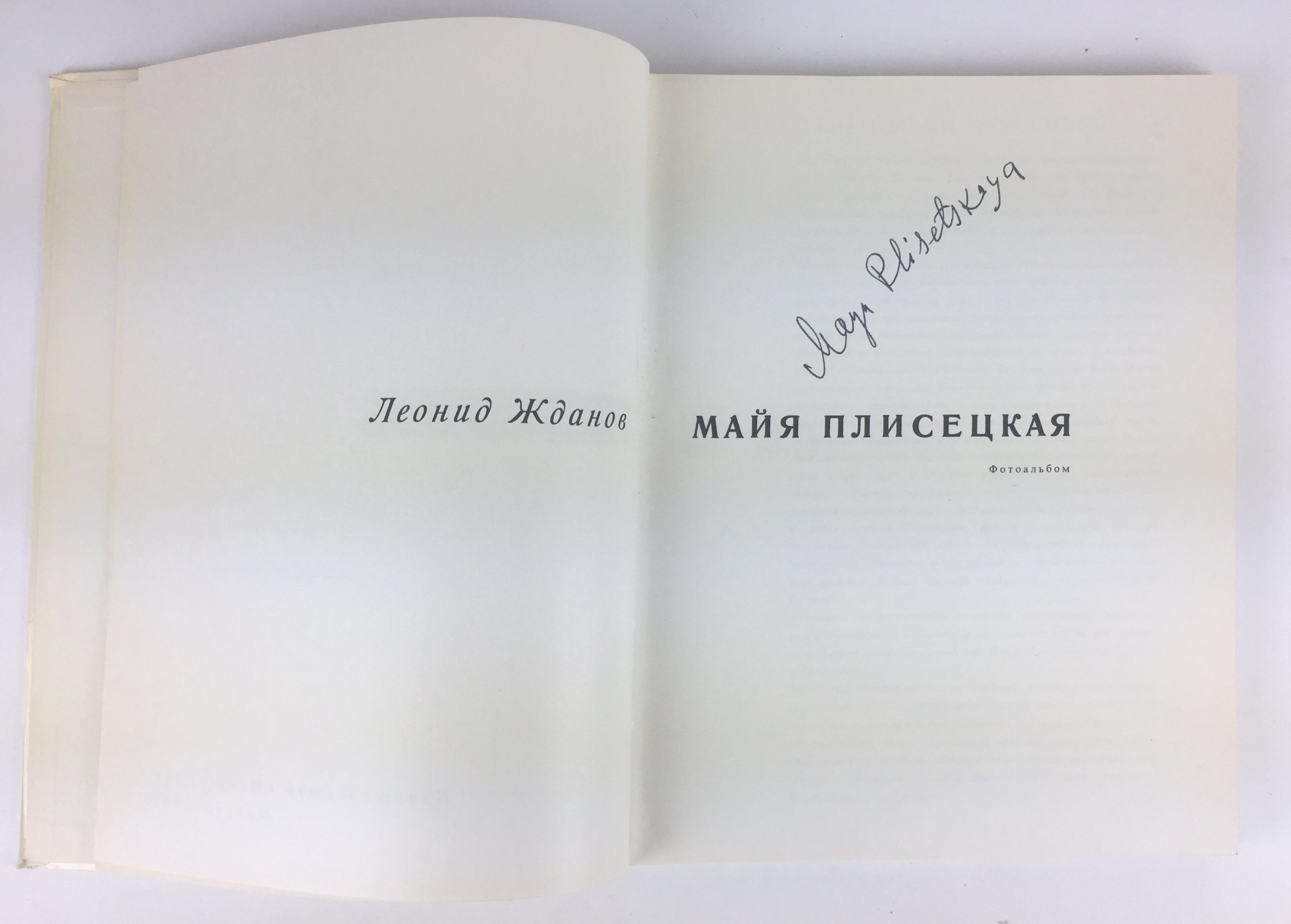 Plisetskaya, Maya. (1925–2015) [Zhdanov, Leonid [Photographer] / Komissarzhevsky, Victor [Intr.]. "Maya Plisetskaya"- SIGNED. Moscow: Isdatelhstwo "Iskustwo". 1965. Signed volume from the Soviet-born ballerina, choreographer, director, and actress who embodied the Bolshoi Theater in the second half of the twentieth century. She has signed boldly in black ink on the title page "Maya Plisetskaya" Unpaginated. Black and white illustrations throughout, text in English, French, and Russian. Hardcover with illustrated boards. Corners bumped, upper cm of spine perished, else very good. 8.5 x 10.75 inches (21 x 27 cm.).
