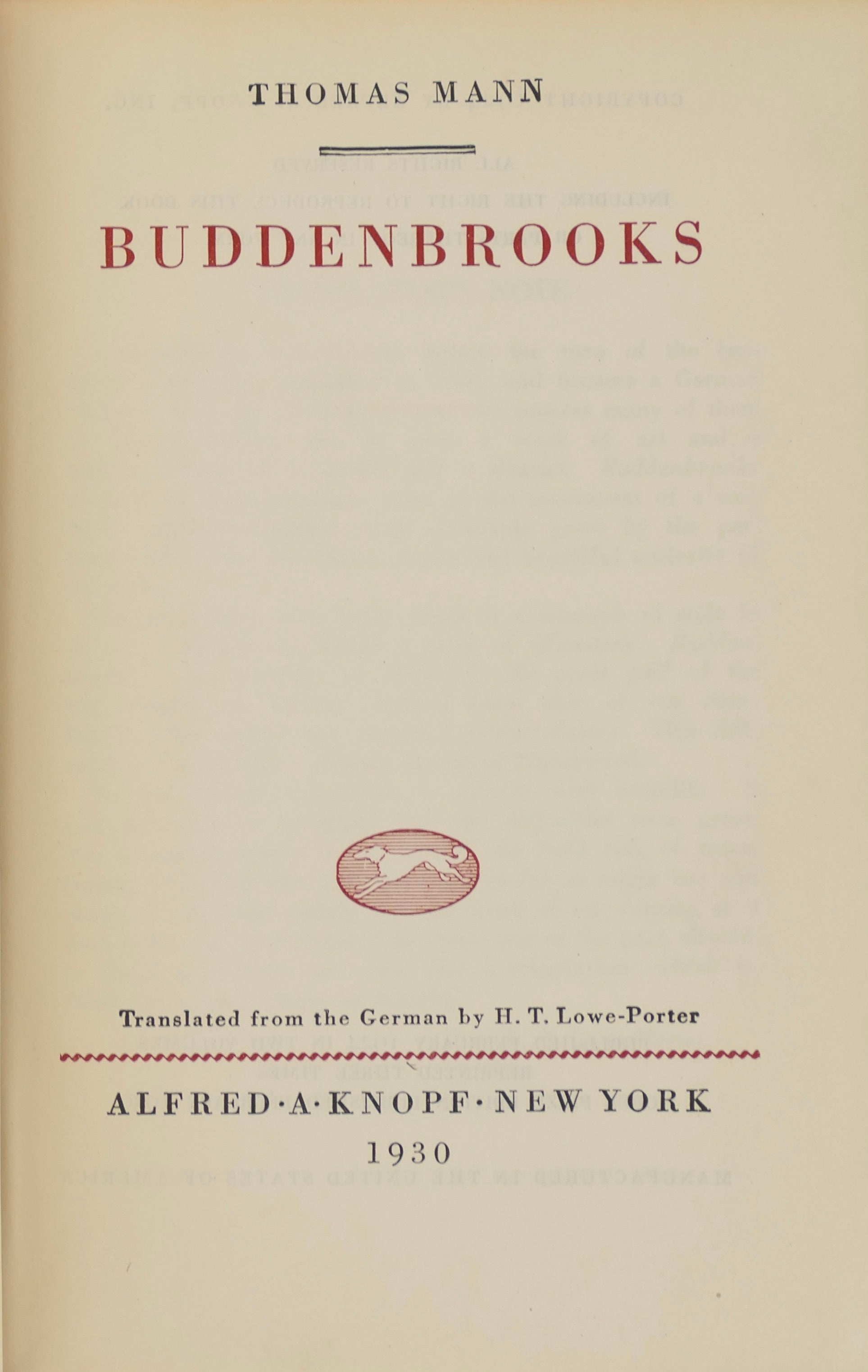 The first novel by Thomas Mann,"Buddenbrooks" is the story of a German merchant family, closely resembling the author's family. Cited by the presenters of the Nobel Prize in Literature when awarding it to Mann in 1929, the present edition of the work - Volumes I and II combined in a single book, translated from the German by H. T. Lowe-Porter - was published the following year.