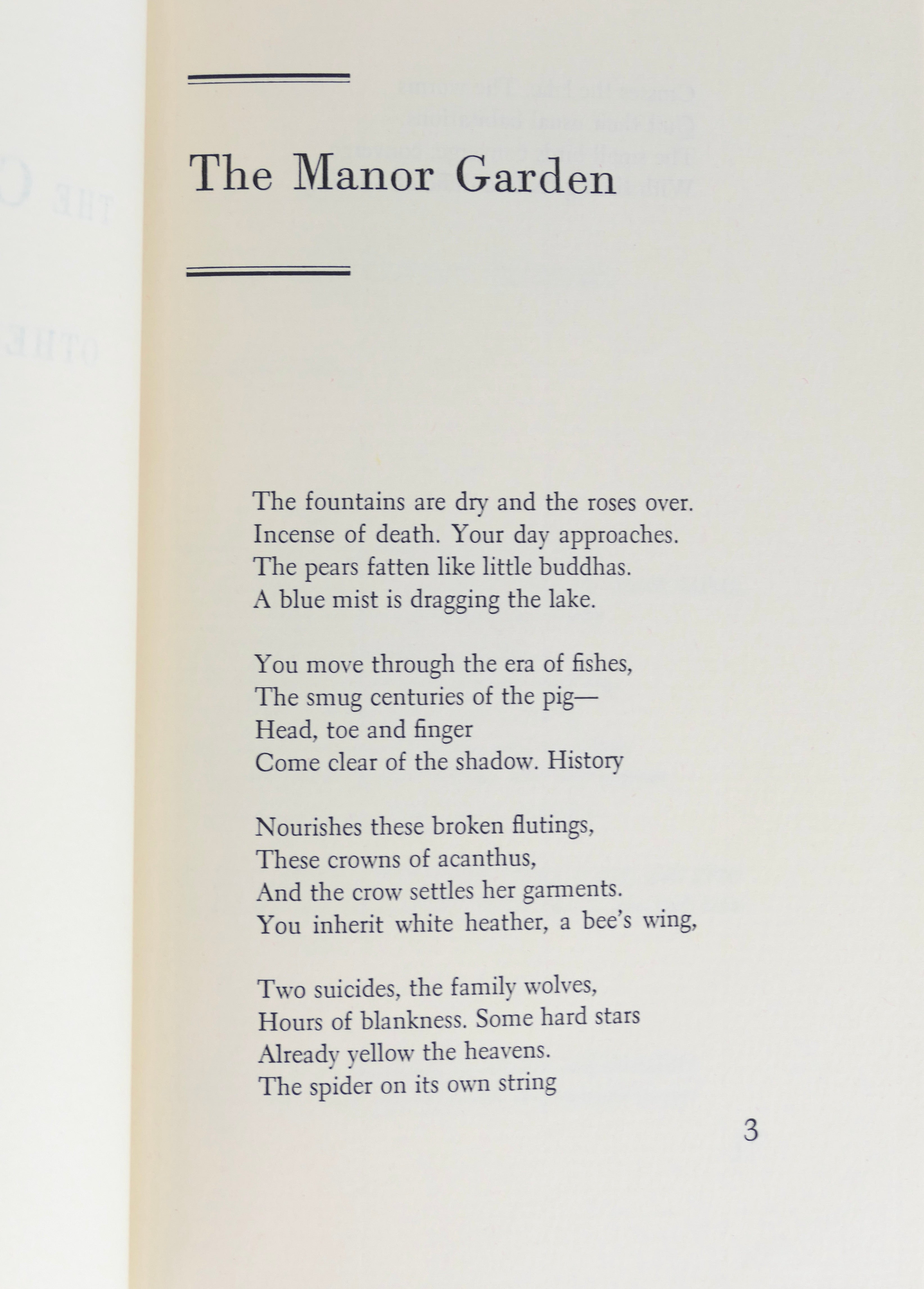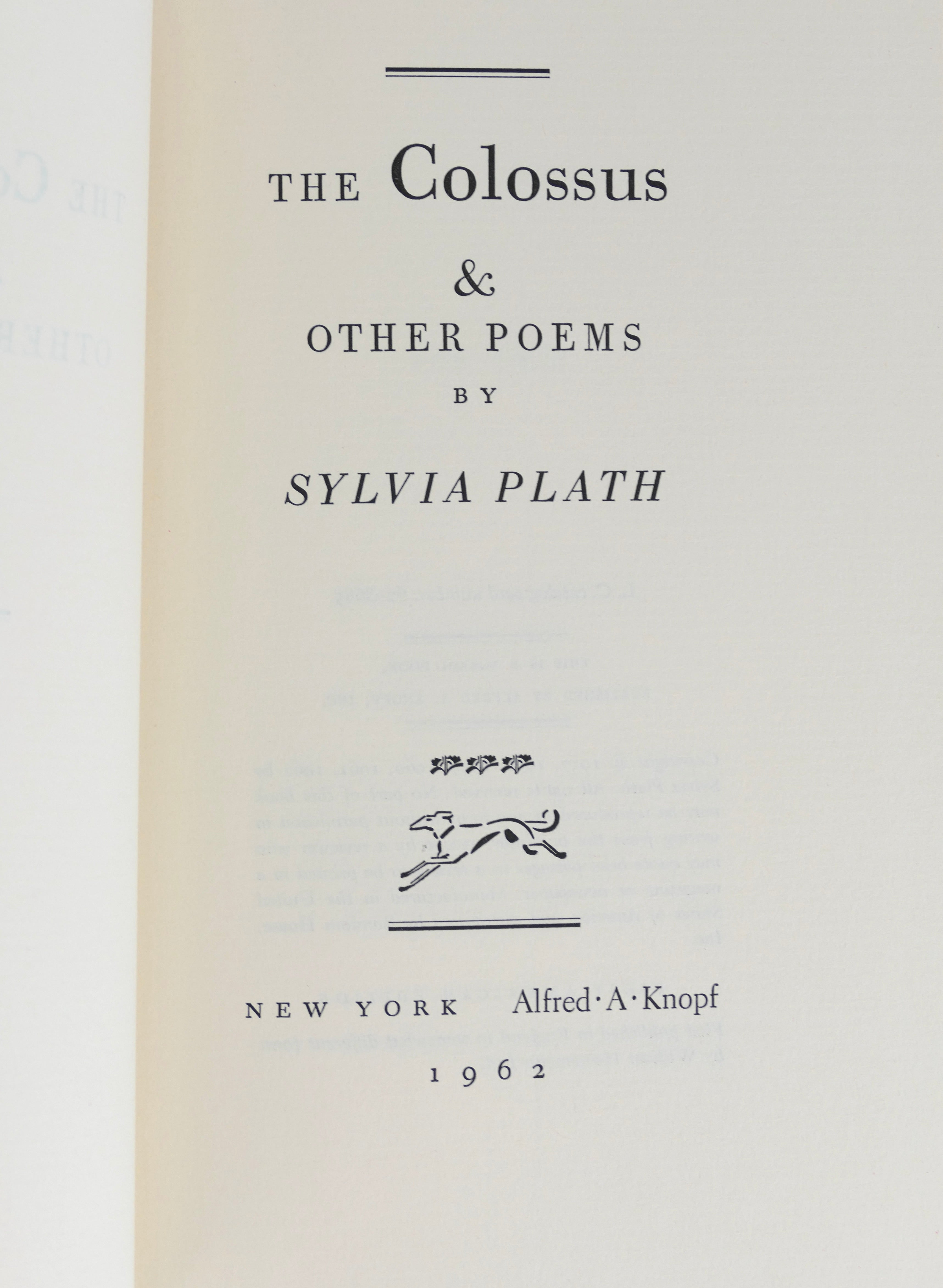 An exceptional copy of the only volume of poetry by Plath that was published before her death in 1963.  The first American Edition, published two years after the UK edition in 1960, notably excluding 10 poems previously included in the Heinemann first edition. Allegedly the editors at Knopf felt they were too obviously Roethke inspired, thus the 50 poems were cut to 40 in this edition. Tragically Plath would take her life less than a year after the publication of this edition.