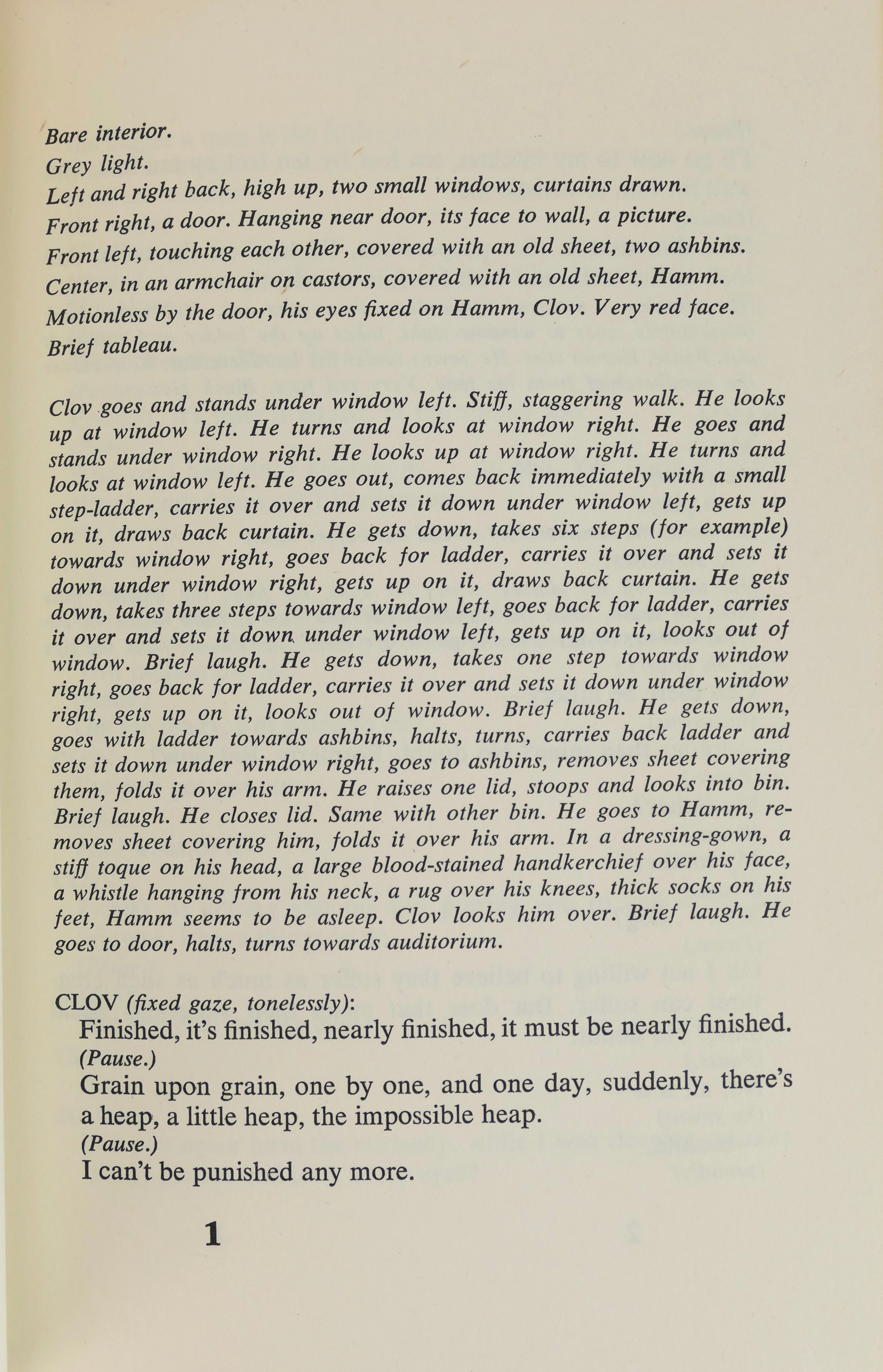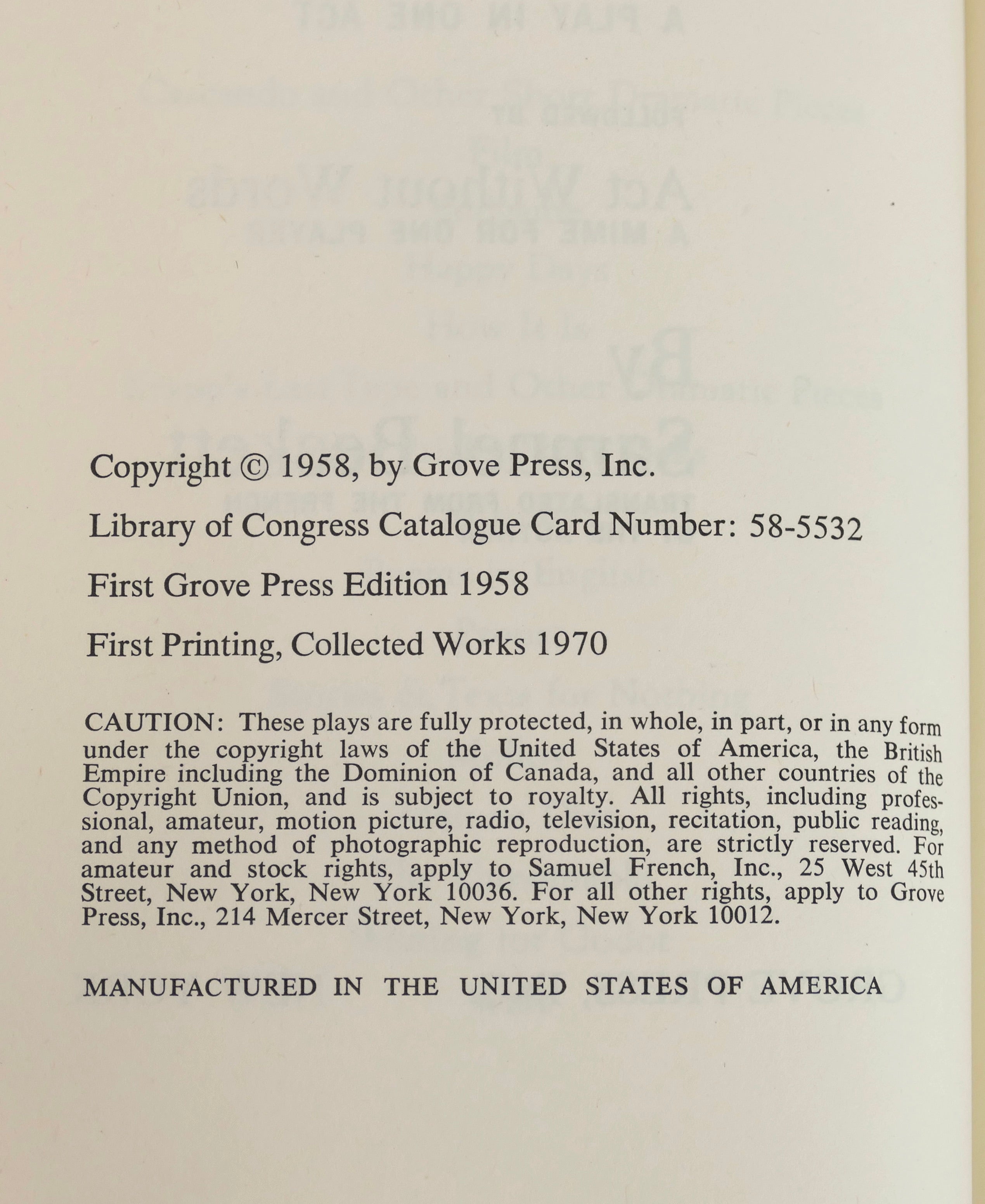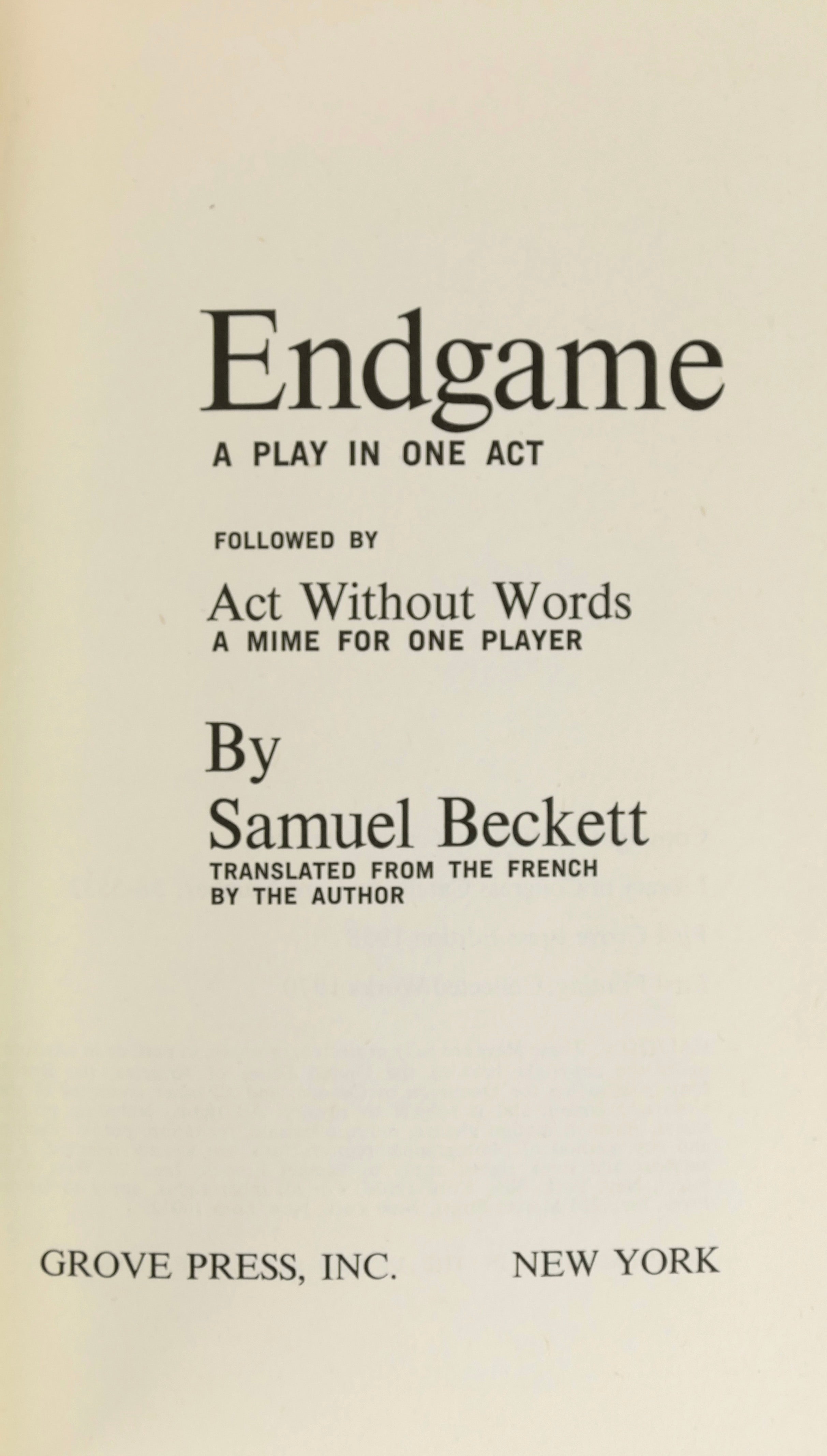 Hardcover. 8vo. 92 pp. Blue boards, silver lettering to front and spine. Dj in fine condition with light toning. Pages are clean. A fine first edition thus copy of Beckett's one-act play "Endgame" published as part of a larger collection of his works by Grove Press in 1970.
