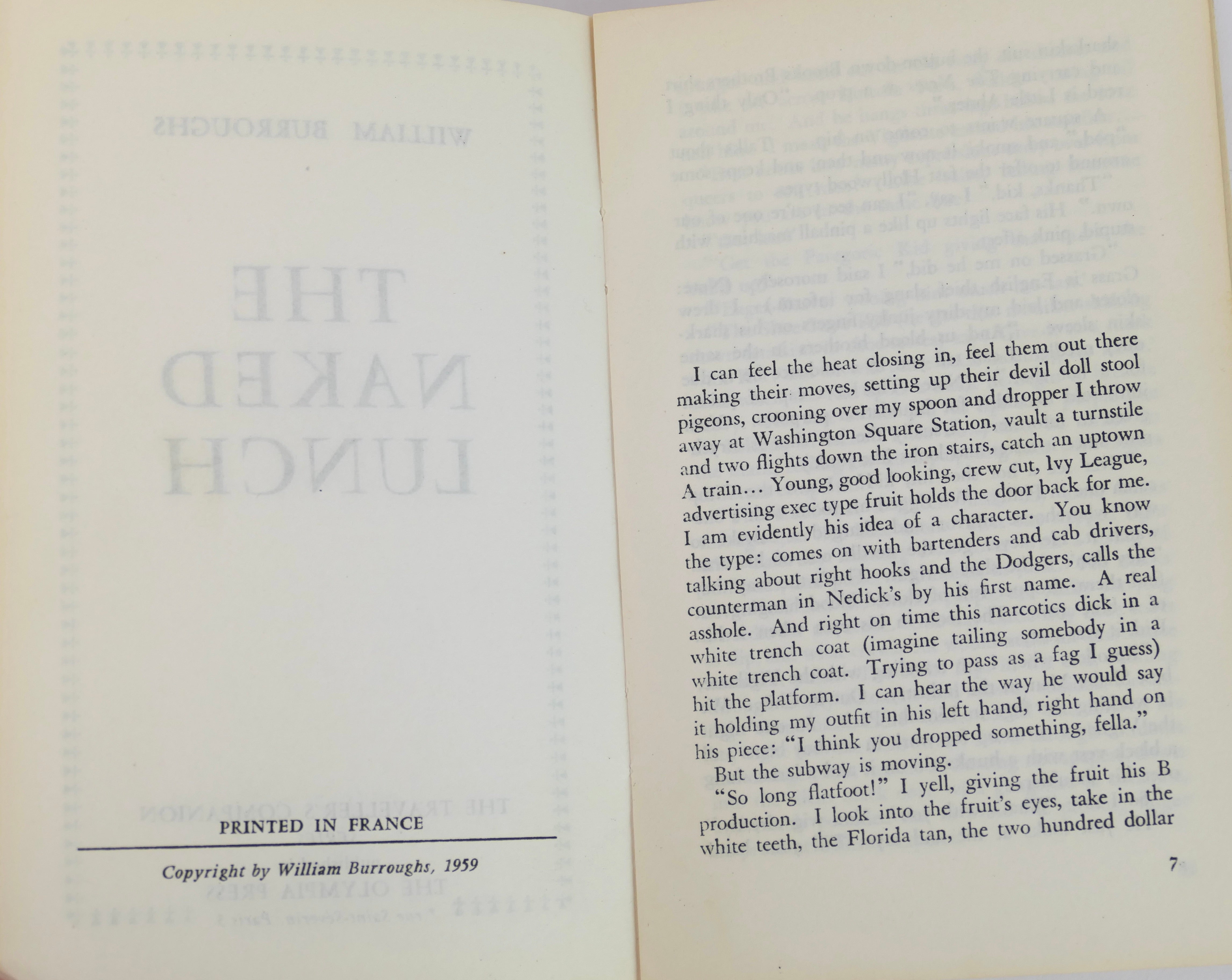 Softcover. 8vo. [1-6], 7-225, [226-232]pp. In the rare white ground dust jacket reproducing a calligraphic drawing by Burroughs, over the trademark green Olympia Press softcover wrappers including "Traveller's Companion." First issue with the original price of 1,500 Francs to rear wrap. Notably titled "The Naked Lunch" instead of the later, accepted "Naked Lunch". Block separated from the wrappers, some glue showing along loose internal gatherings, otherwise a good example of the First edition, first printing of Burroughs' masterpiece and a cornerstone of beat literature.