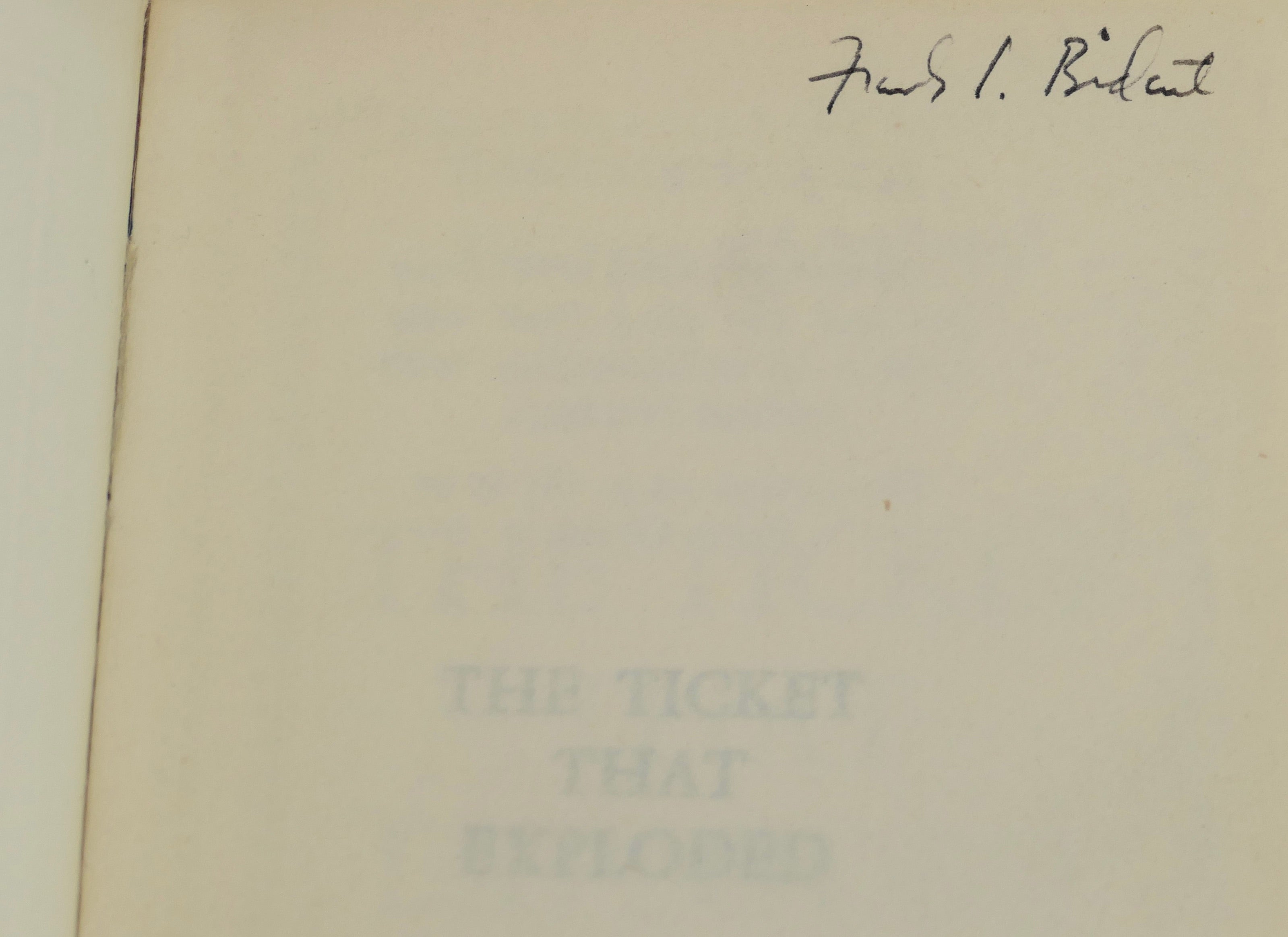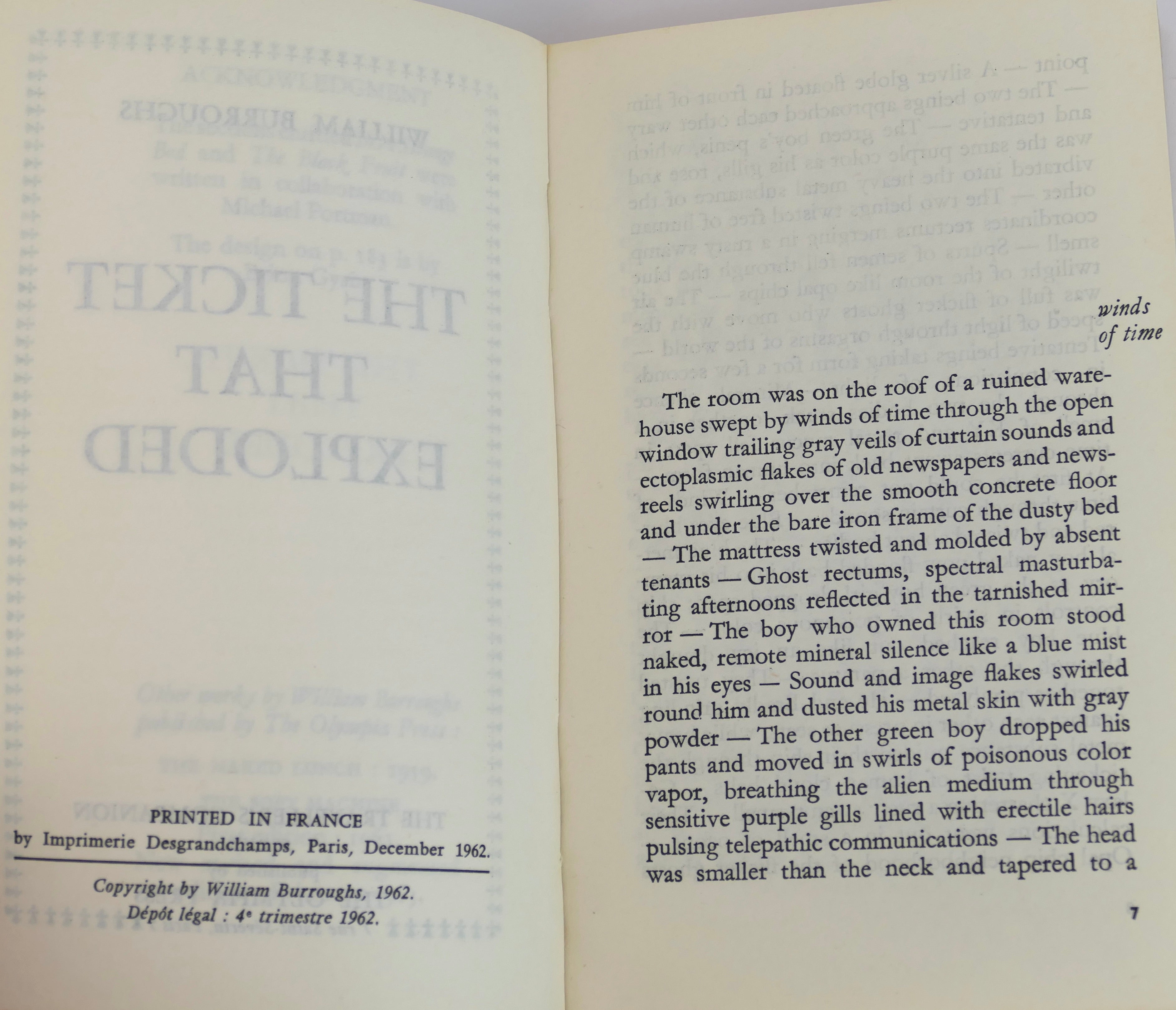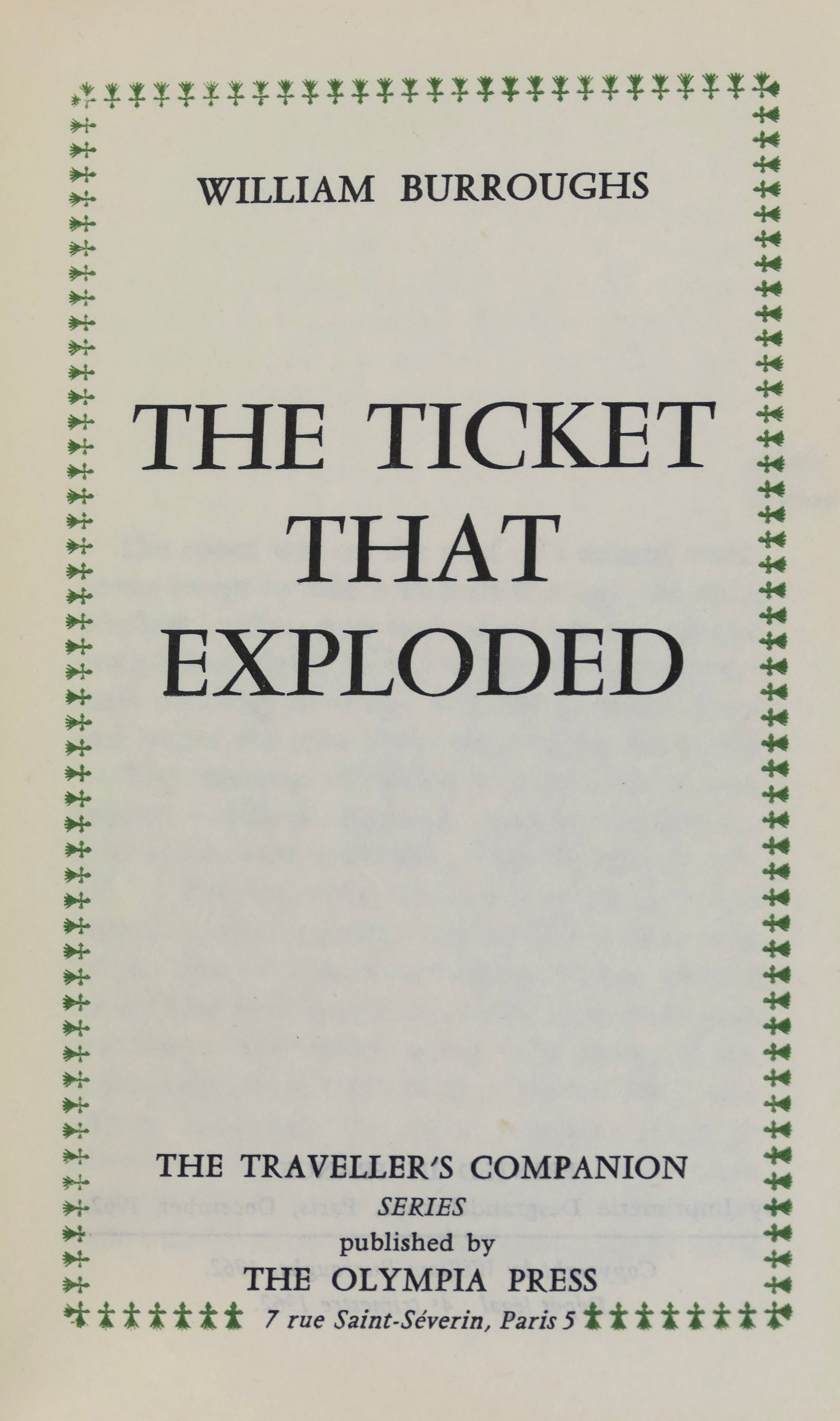 Softcover. 8vo. 183 pp. In the trademark green Olympia Press softcover wrappers including "Traveller's Companion," no. 91 in the series, green borders on title page, Brion Gysin drawing last page, price 18 n.f. on rear cover. Very minor wear along spine. A very fine copy Burroughs's lesser-known story of which Anthony Burgess wrote, "It is in books like The Ticket that Exploded that Burroughs seems to revel in a new medium for its own sake–a medium totally fantastic, spaceless, timeless, in which the normal sentence is fractured, the cosmic tries to push its way through bawdry, and the author shakes the reader as a dog shakes a rat."